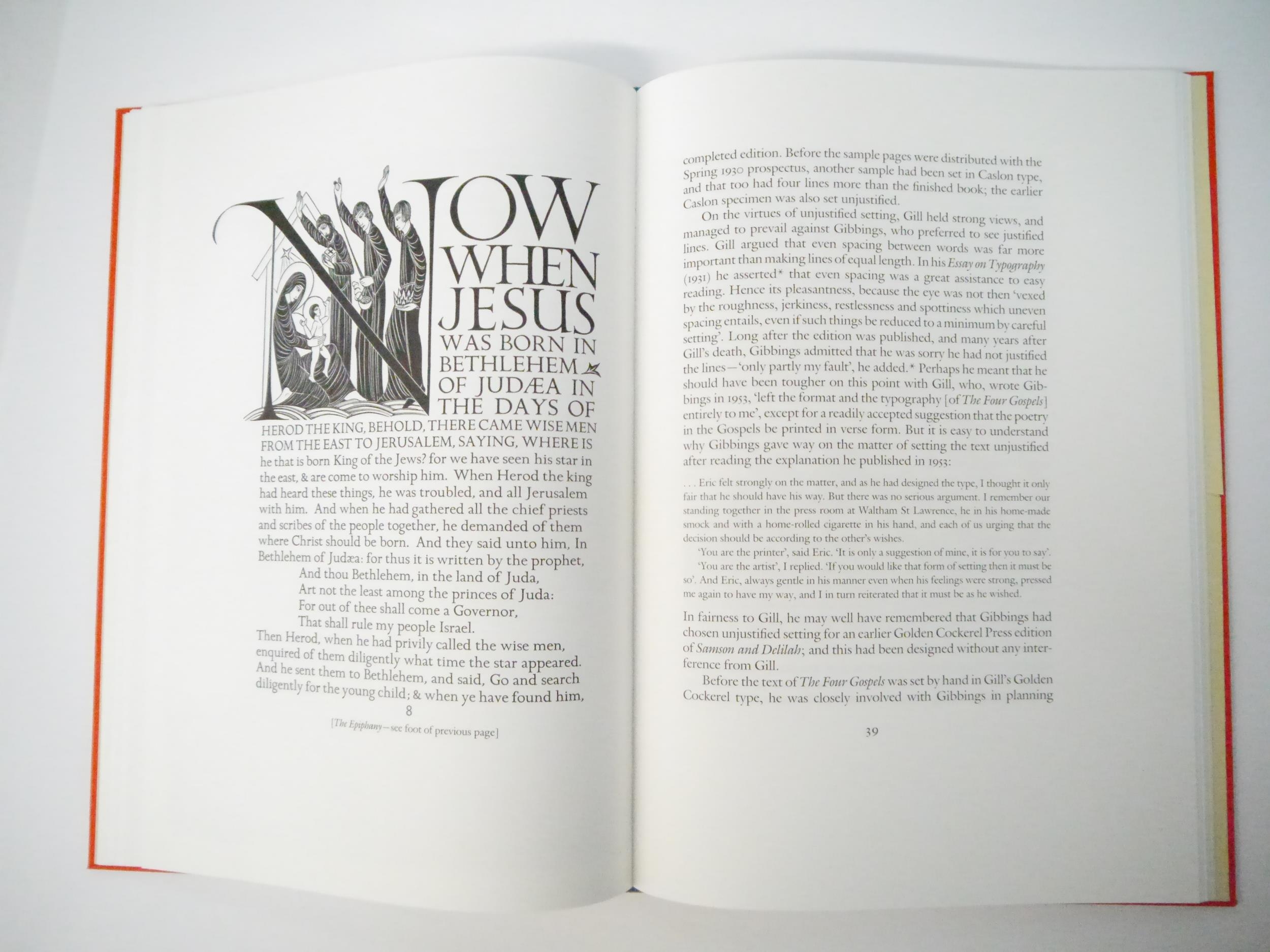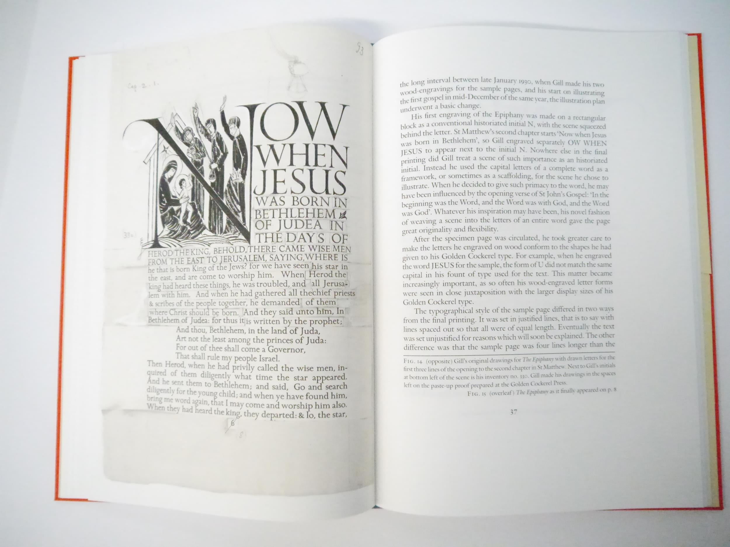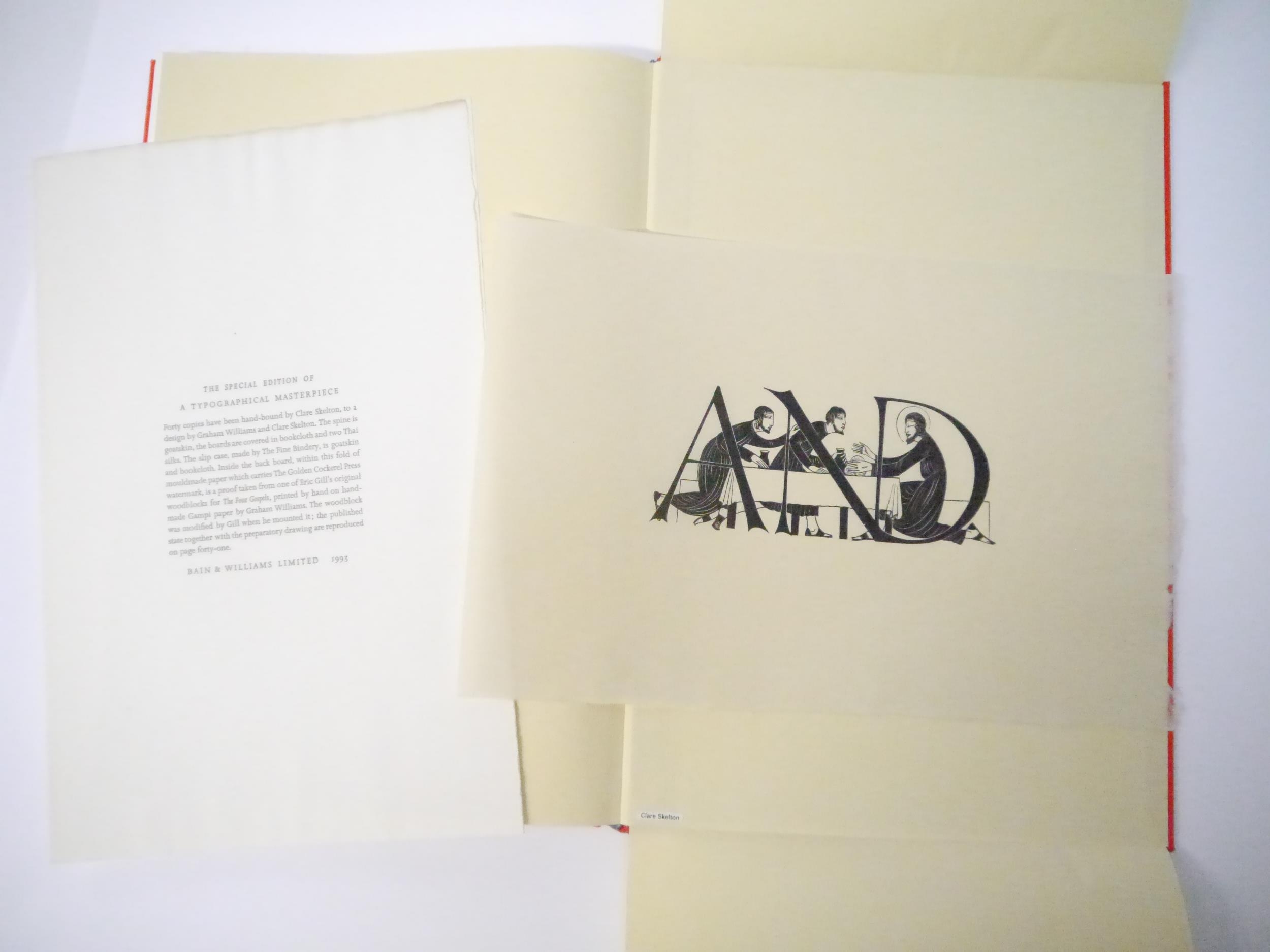 Eric Gill and others: 'A Typographical Masterpiece. An account by John Dreyfus of Eric Gill’s collaboration with Robert Gibbings in producing the Golden Cockerel Press edition of 'The Four Gospels' in 1931', London, Bain & Williams, 1991, limited edition, this being one of only 40 special copies, bound by Clare Skelton with red leather spine, titling gilt, striking geometric designs in coloured cloth to front and rear boards, slipcase, xii + 105pp, illustrated throughout, large 4to (34.5 x 24.5cm). This special copy comes with a fine Gill engraving printed from the block in a pocket at rear. Fine.