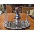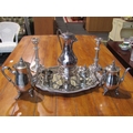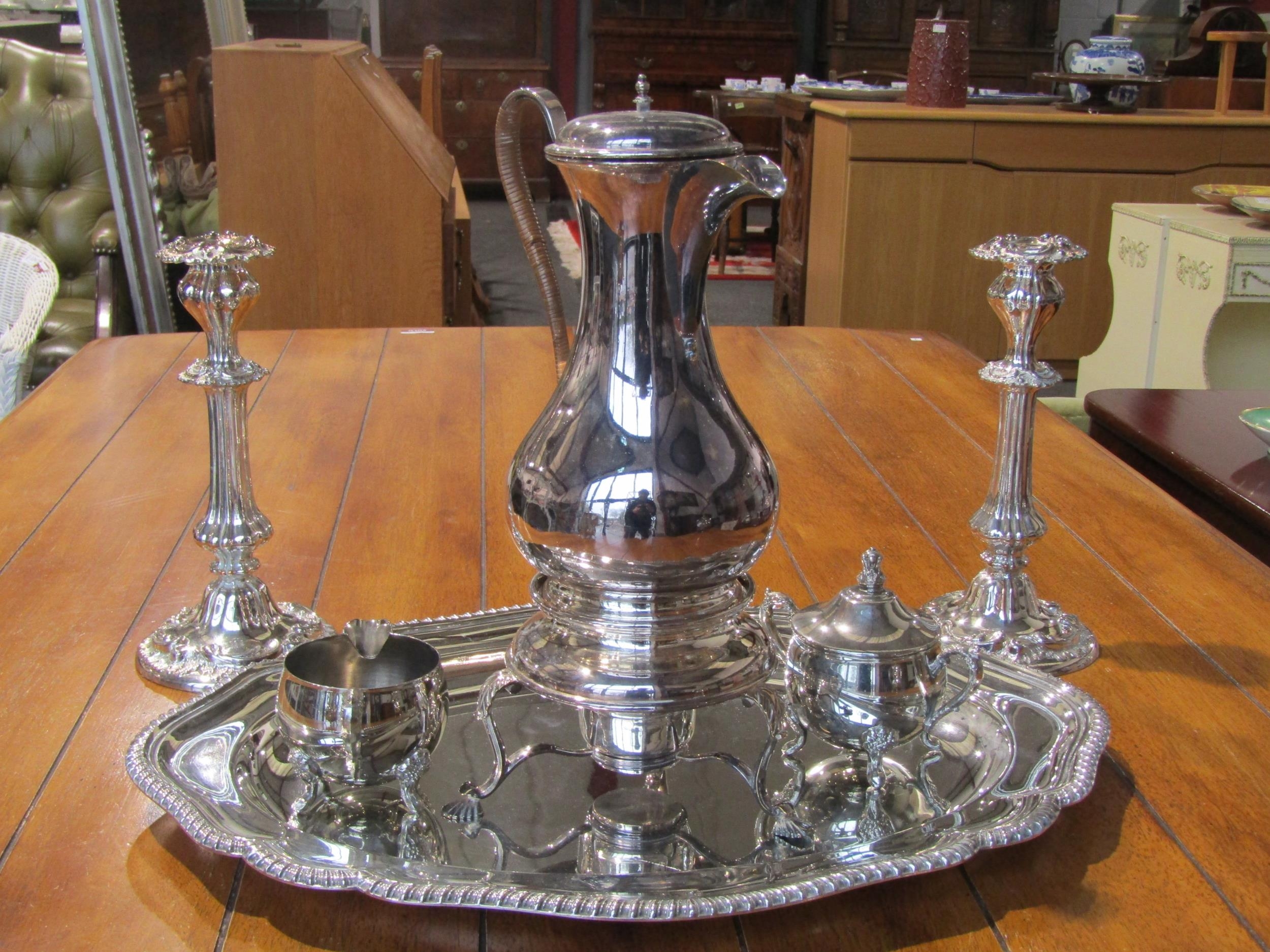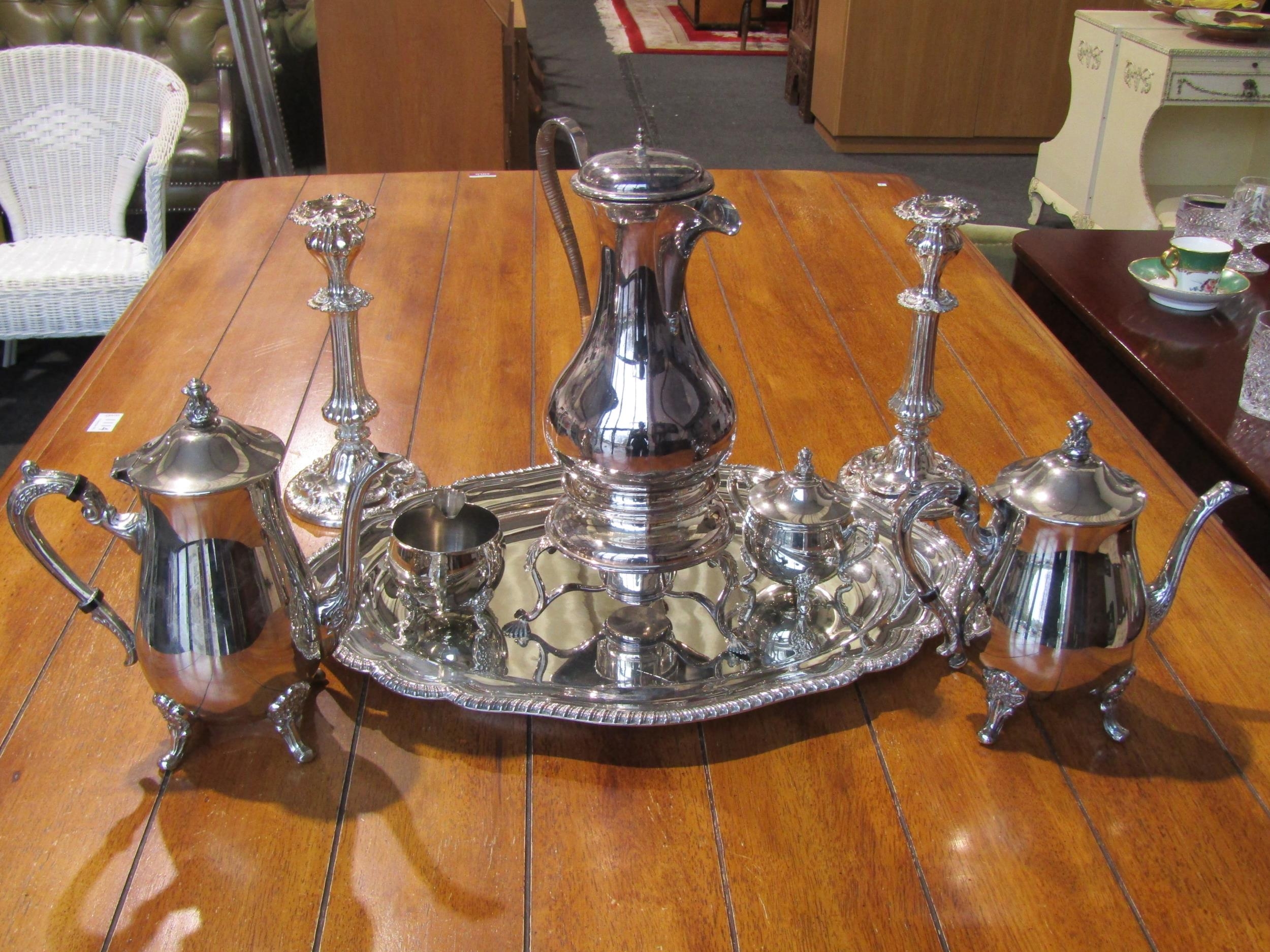 A selection of plated wares including hot water jug with spirit stove, teapot, coffee pot, milk and sugar and a pair of candlesticks