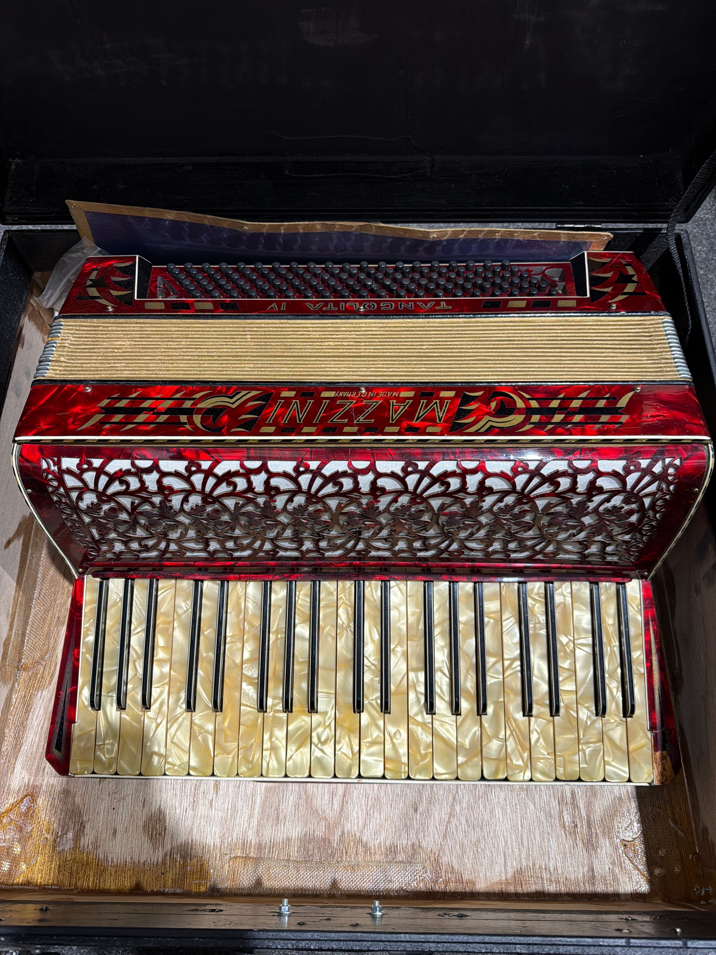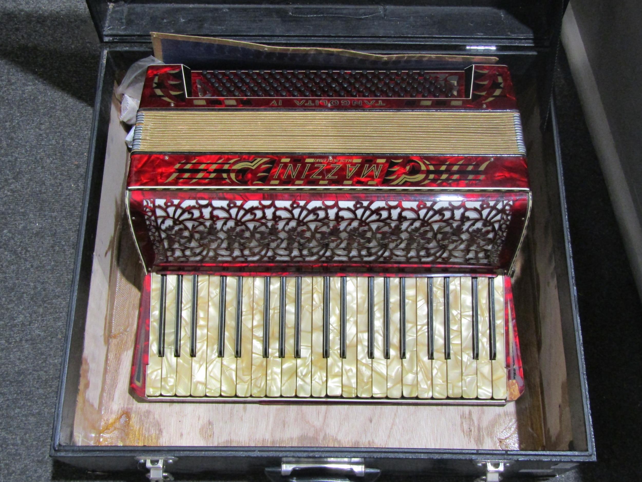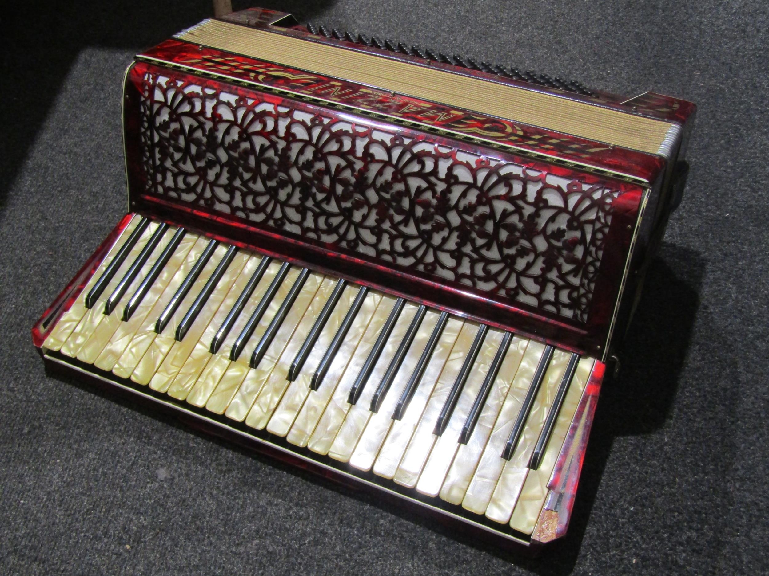 A Mazzini Tangolita IV 120 bass piano accordion, red pearles...