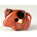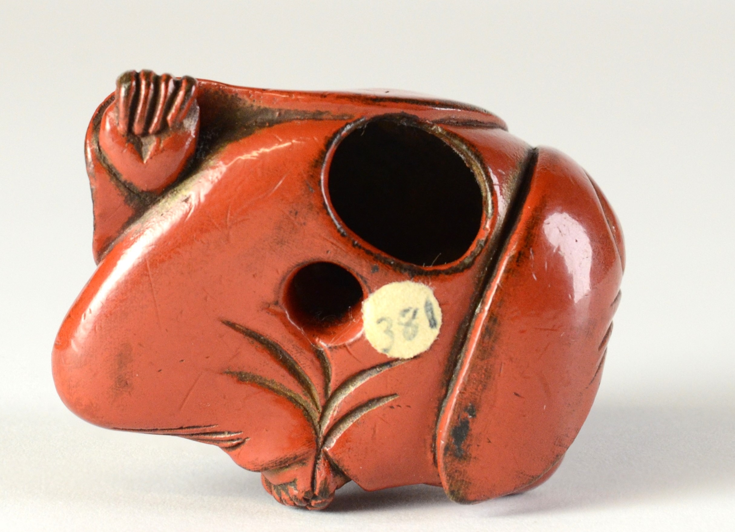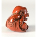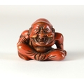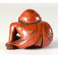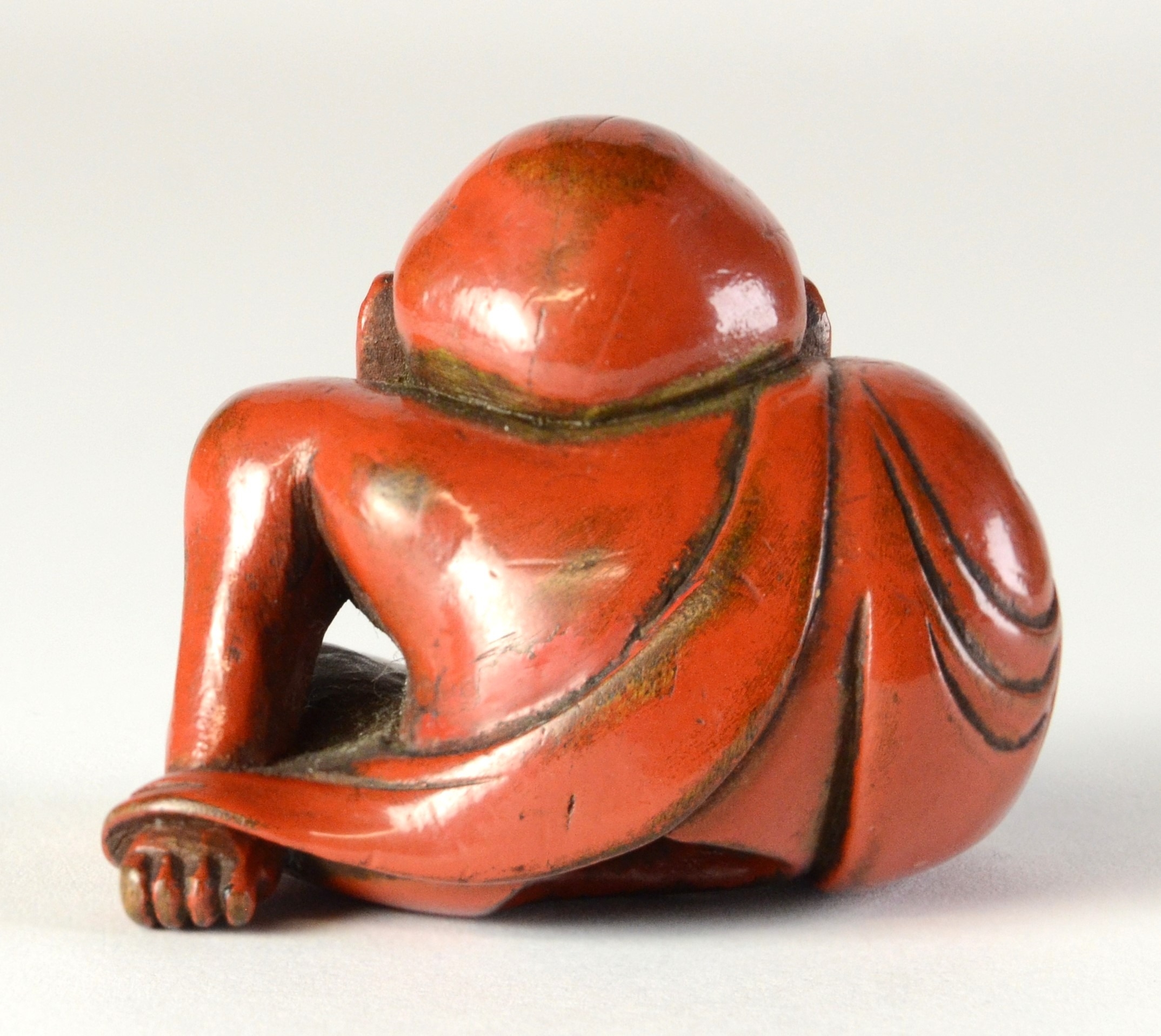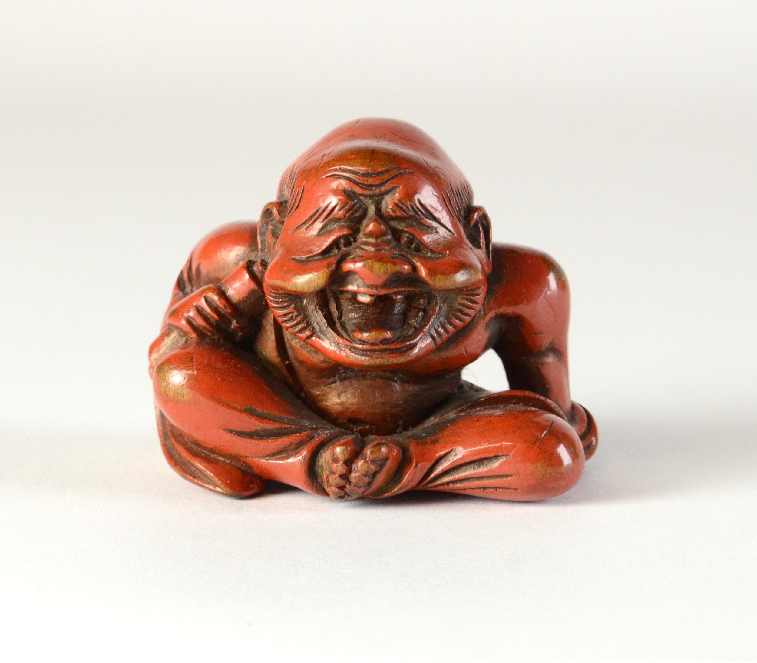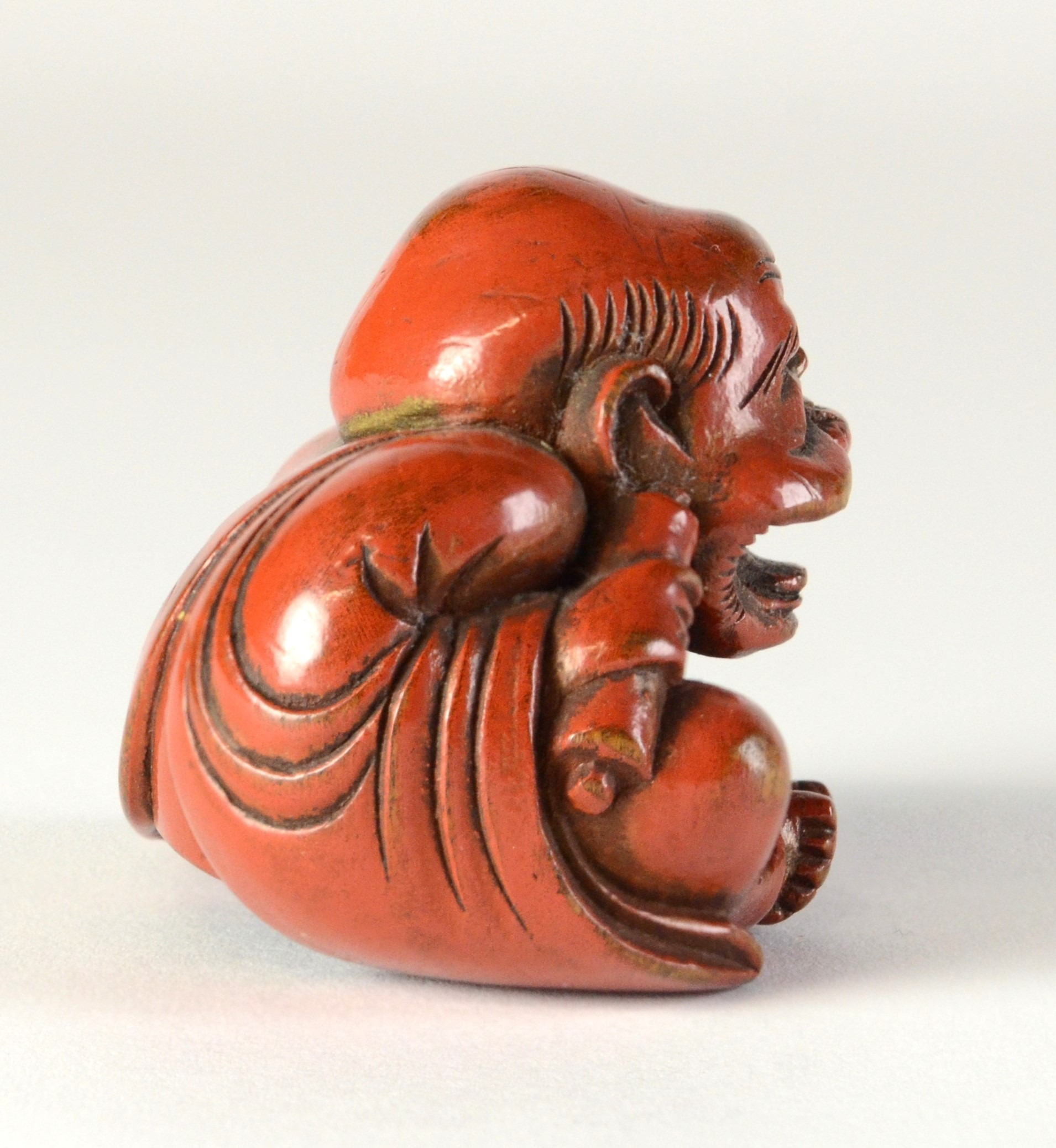 A seated laughing storyteller netsuke in Baddha Konasana pose, red lacquer, unsigned3.8cm wide x 3cm deep and 3.5cm highProvenanceDorothy Ann Stevens no. 381Ex Sharpe collection (brought from Meinertzhagen 28th Nov, 1951)