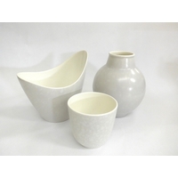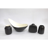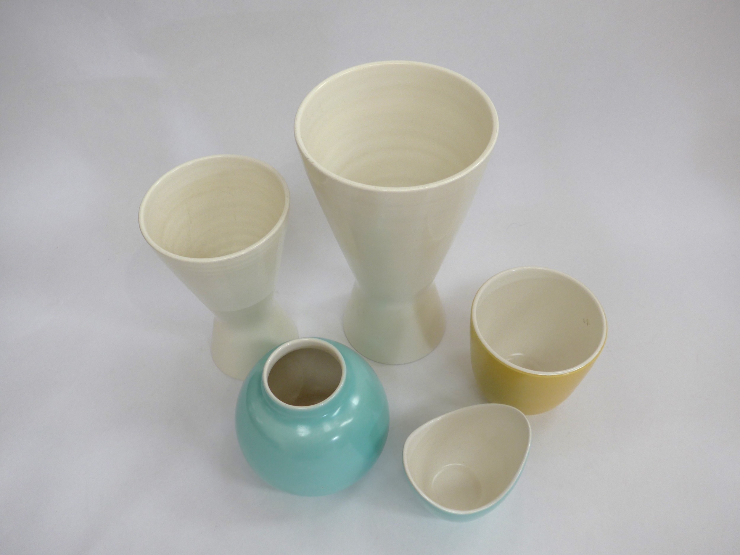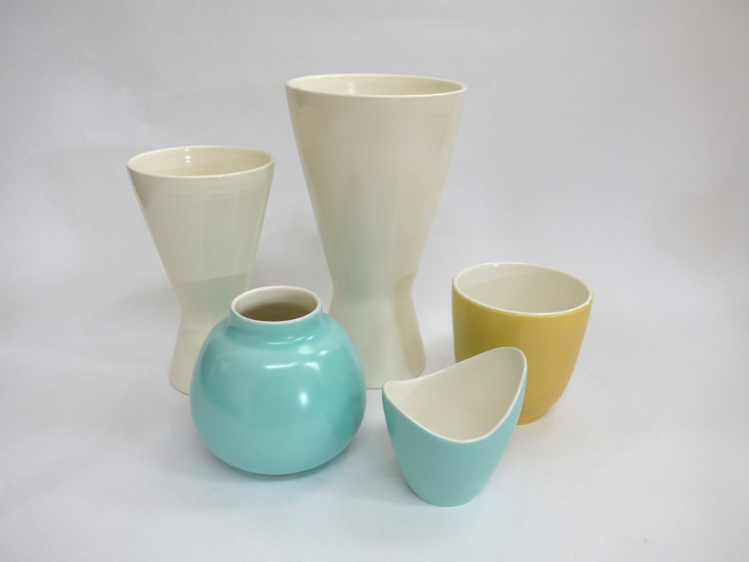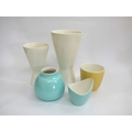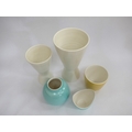 Five Poole Freeform vases designed by Alfred Read & Guy Sydenham, various colour glazes and shapes. 'Dolphin' backstamps. Tallest 25cm high