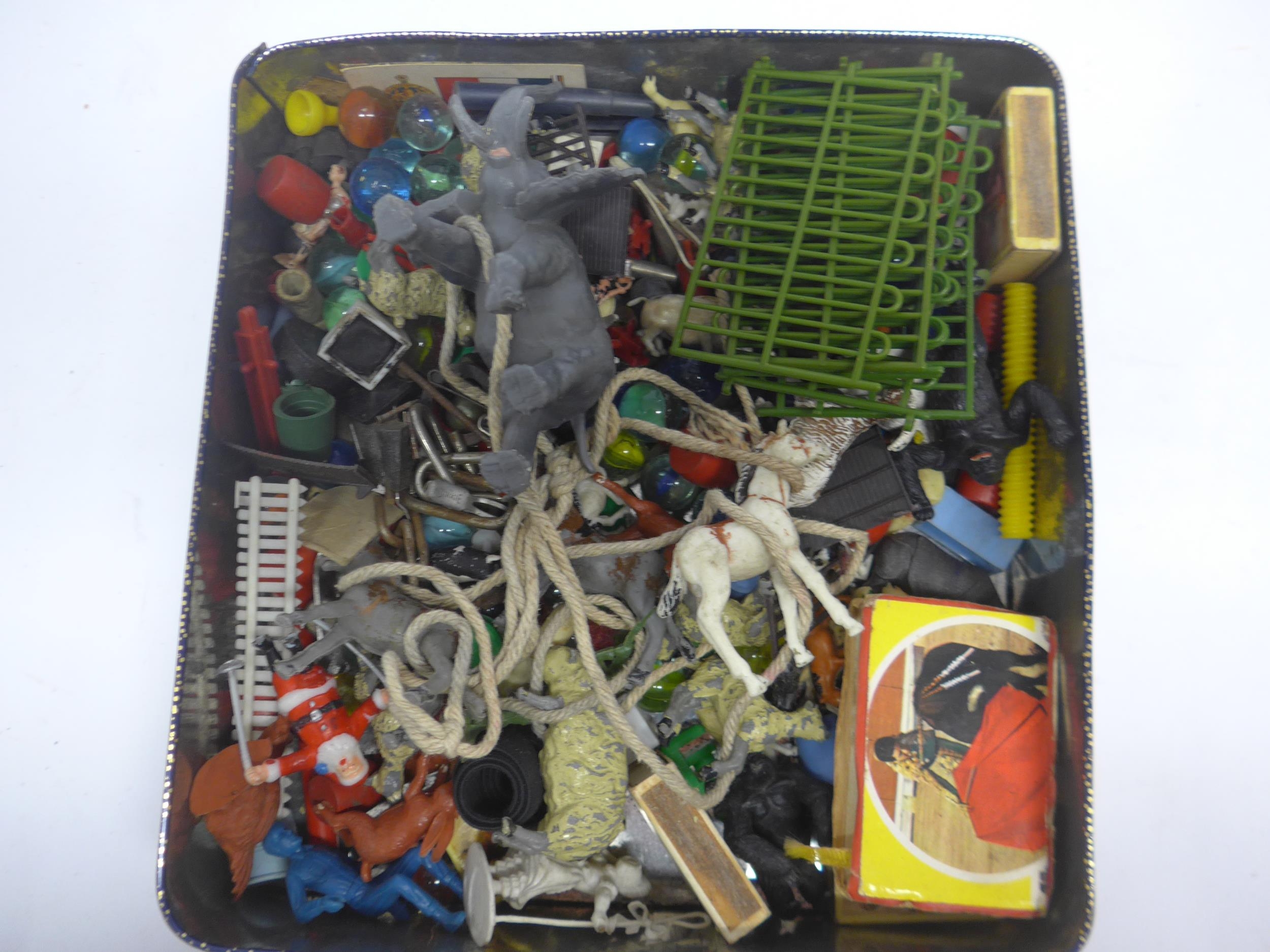A tin of plastic and lead animal figures, 20th Century glass marbles, etc.