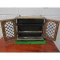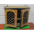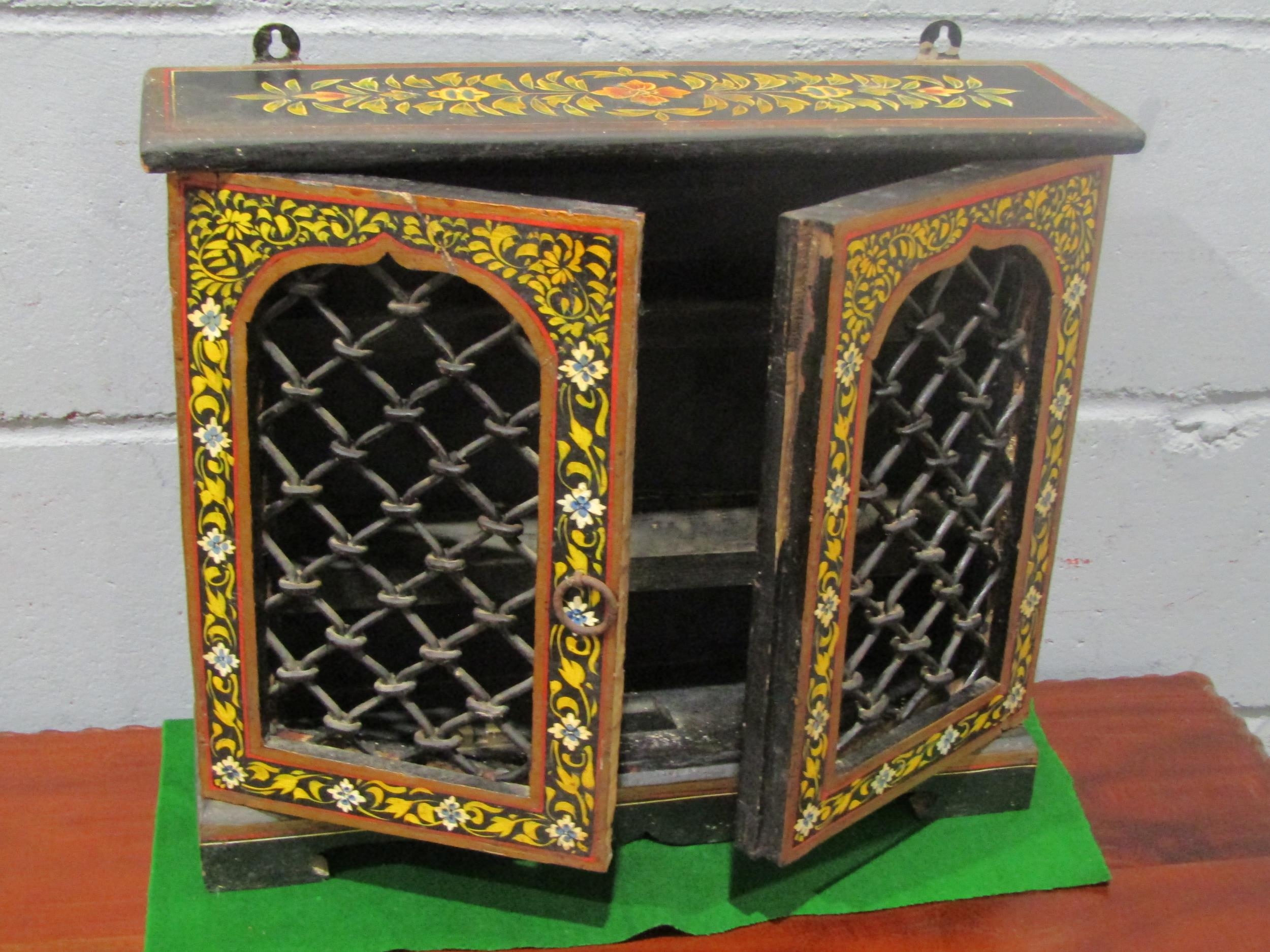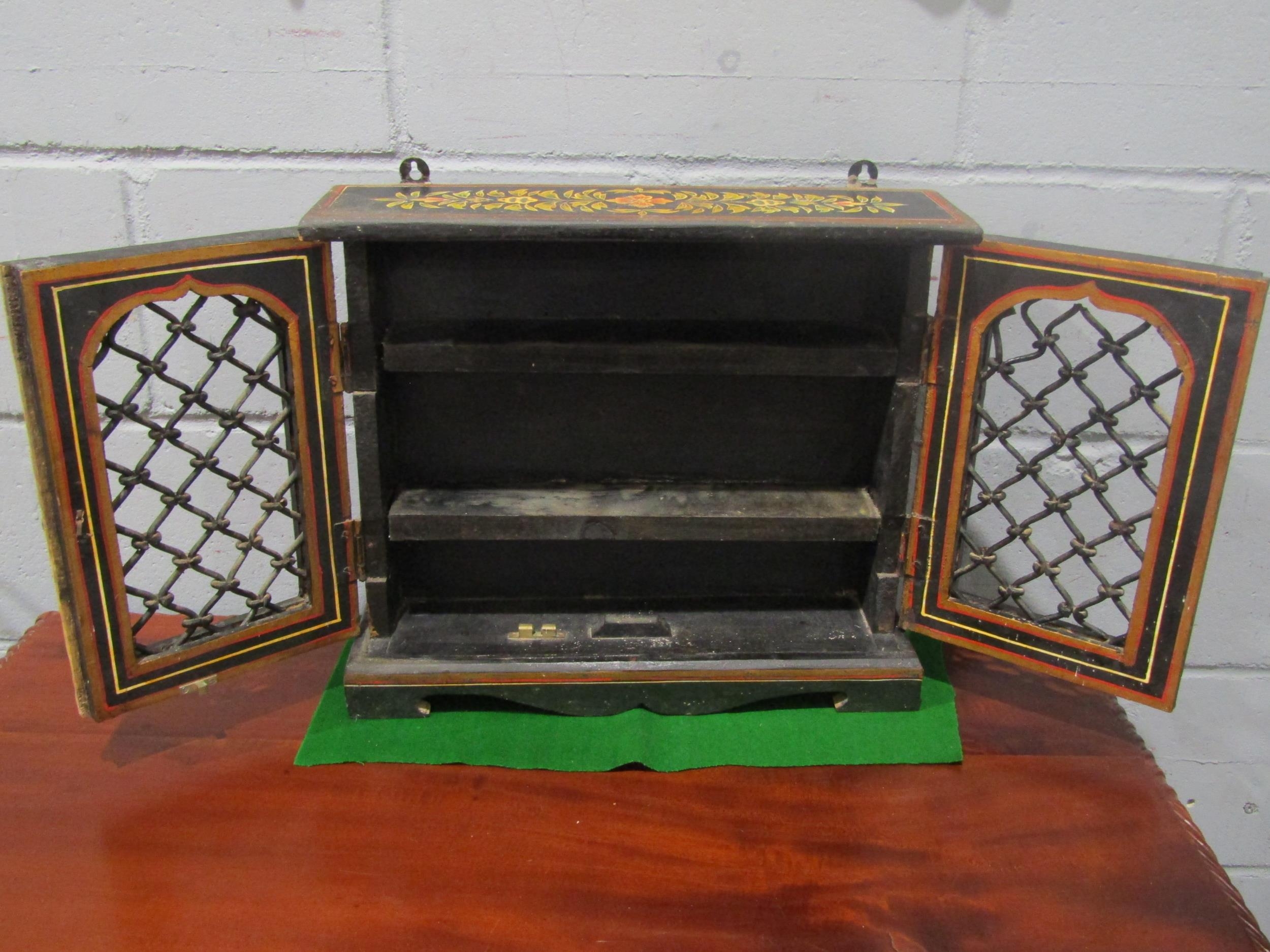A painted wooden Indian spice cabinet with lattice metalwork doors, shelved interior, 39cm tall x 46cm long x 12.5cm deep