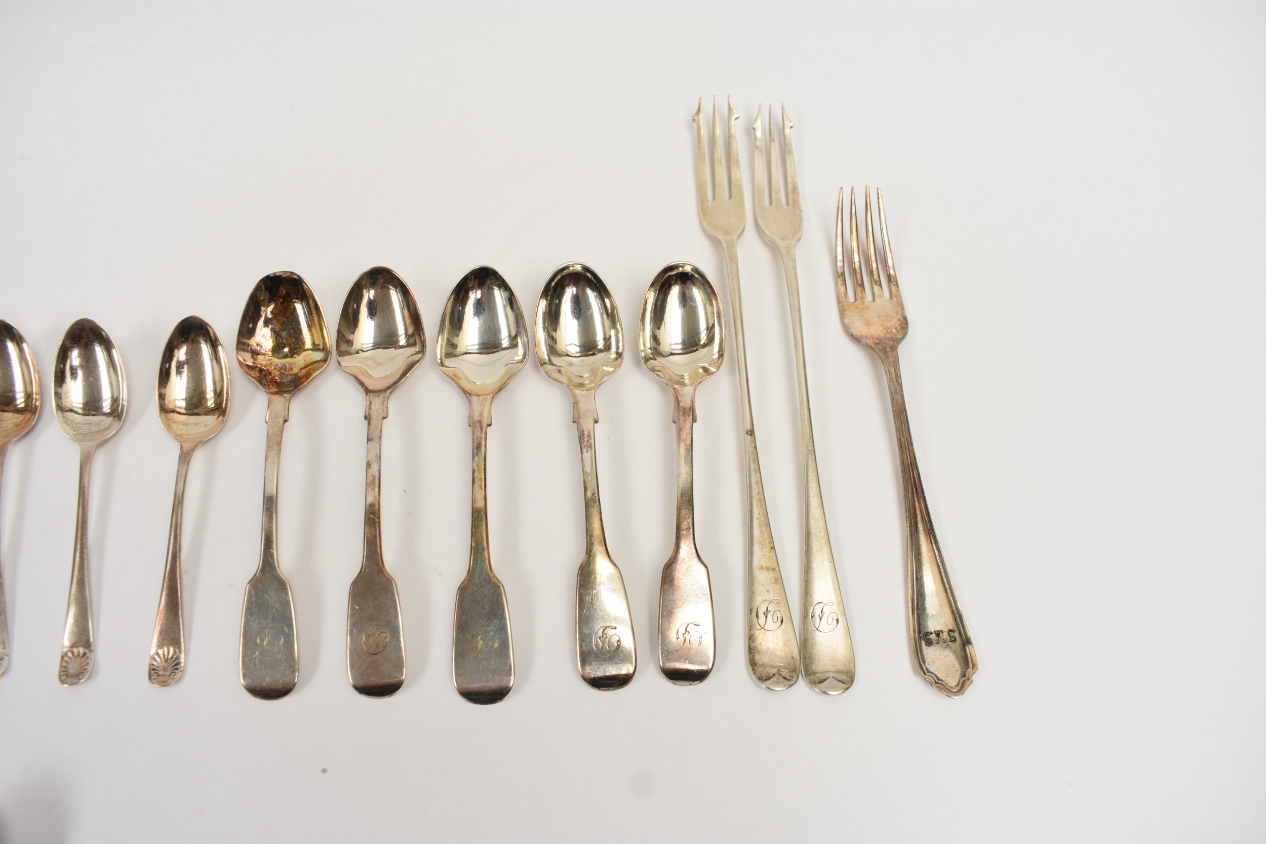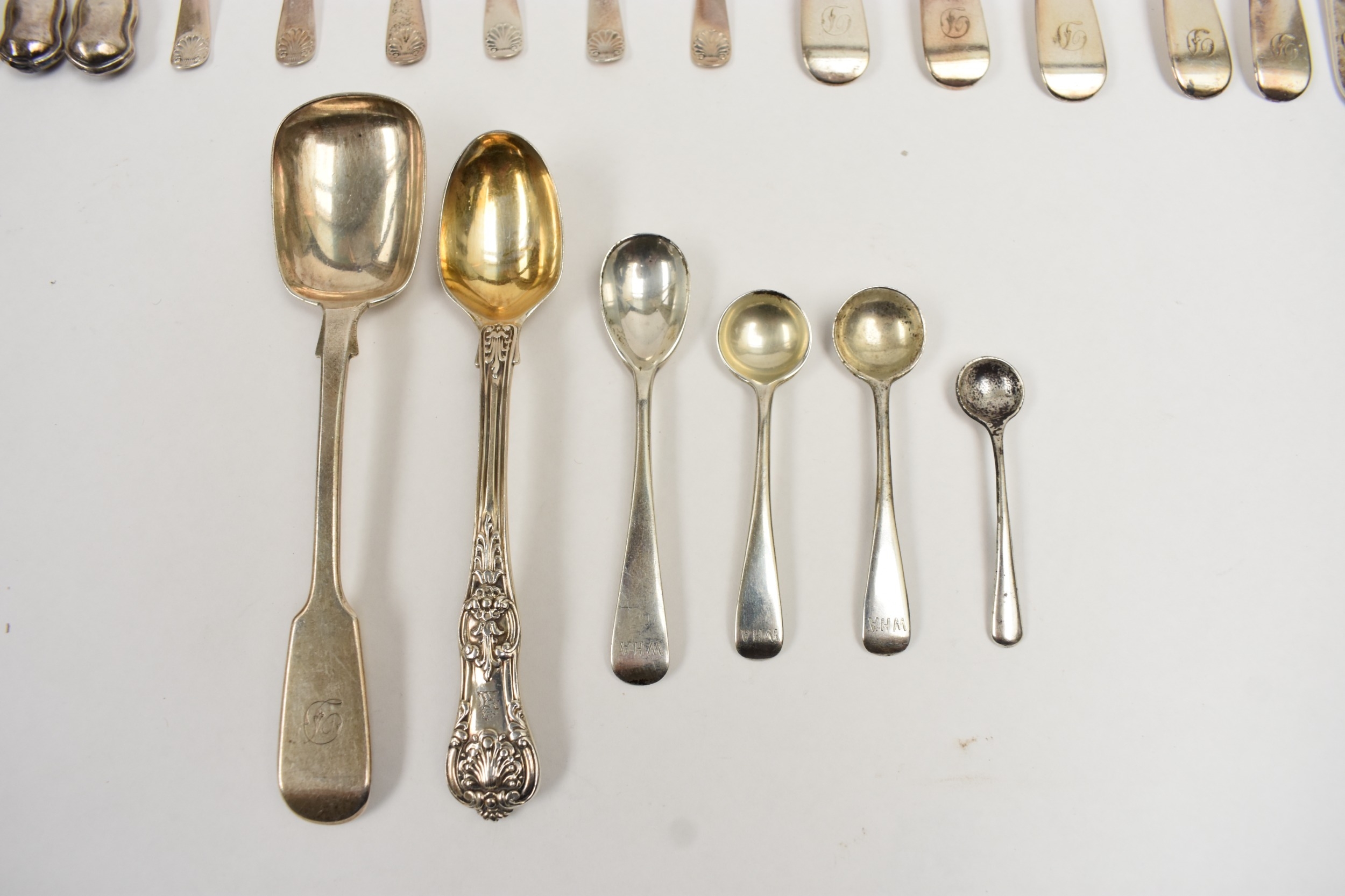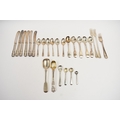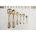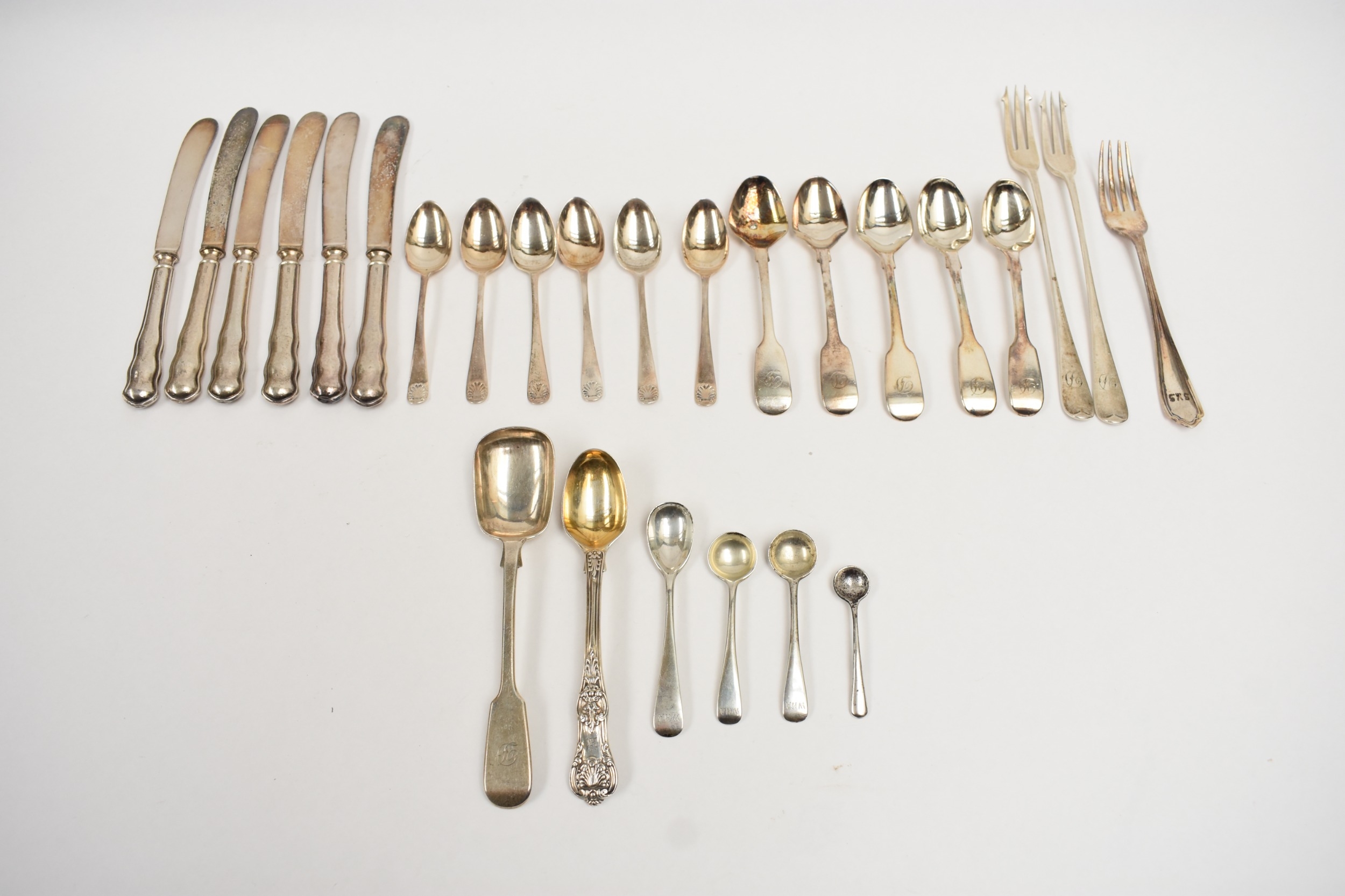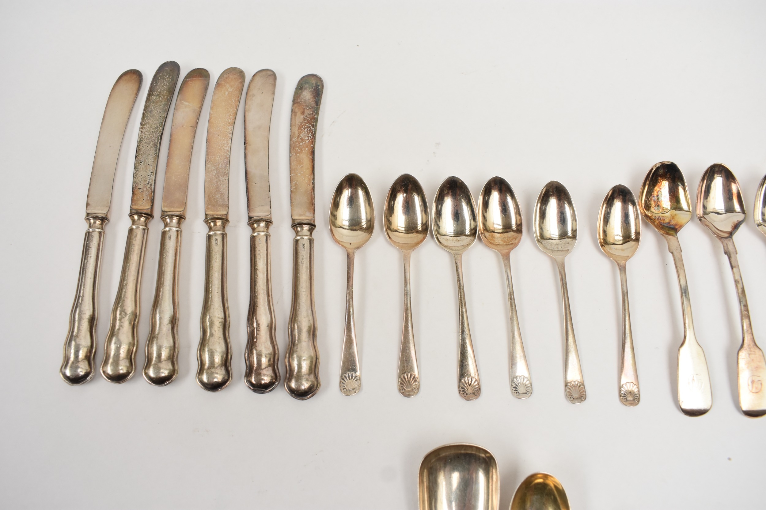 Silver flatware including six Cooper Brothers & Sons coffee spoons, Sheffield 1935, five Samuel Whitford teaspoons, London 1858, pickle forks, condiment spoons and silver handled butter knives. 314g excluding the knives