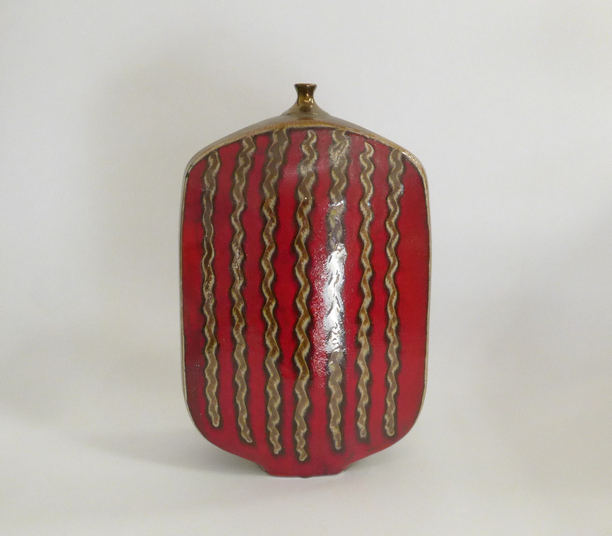 A modern pottery vase with red and bronzed glazes, vertical ...