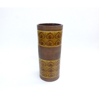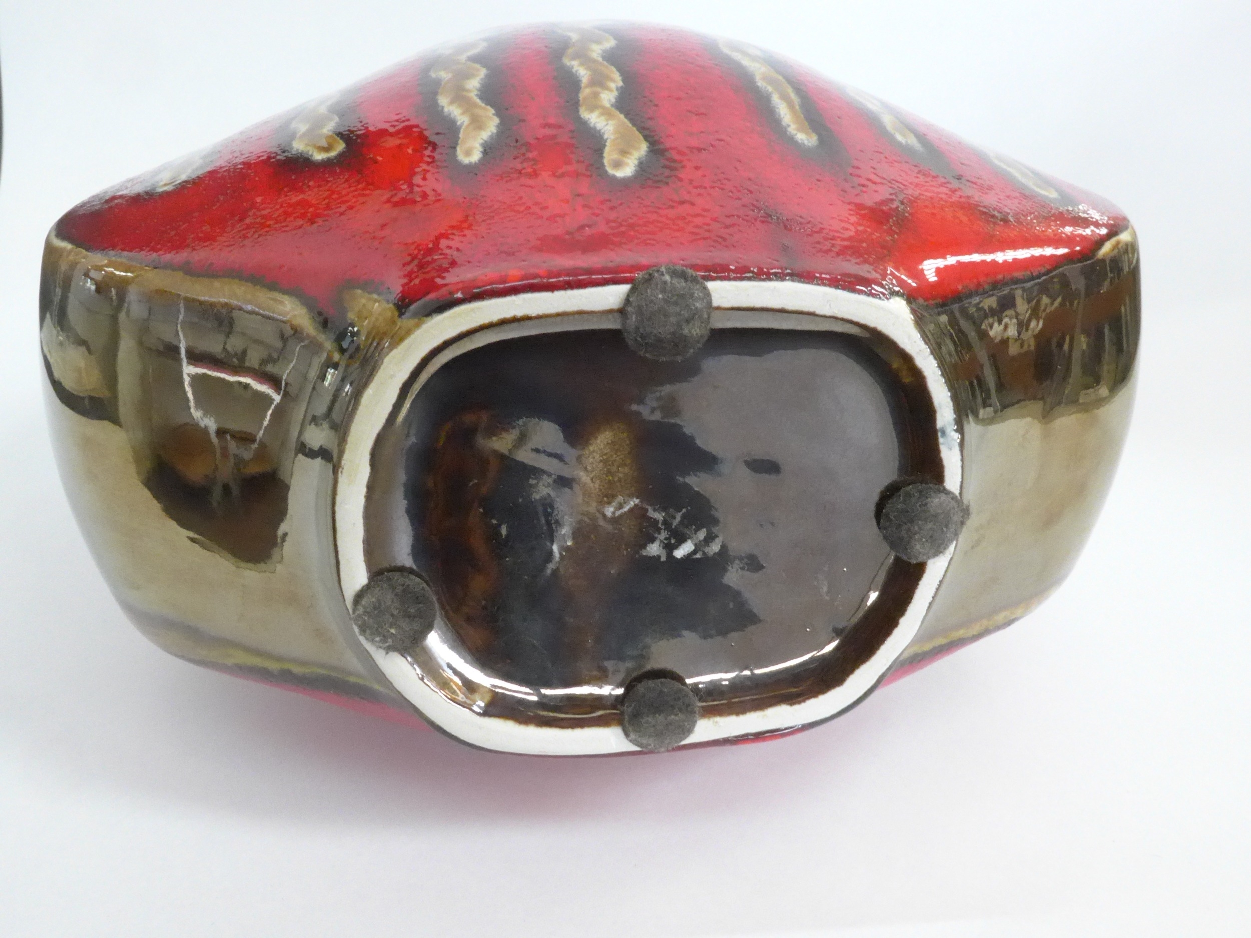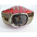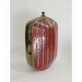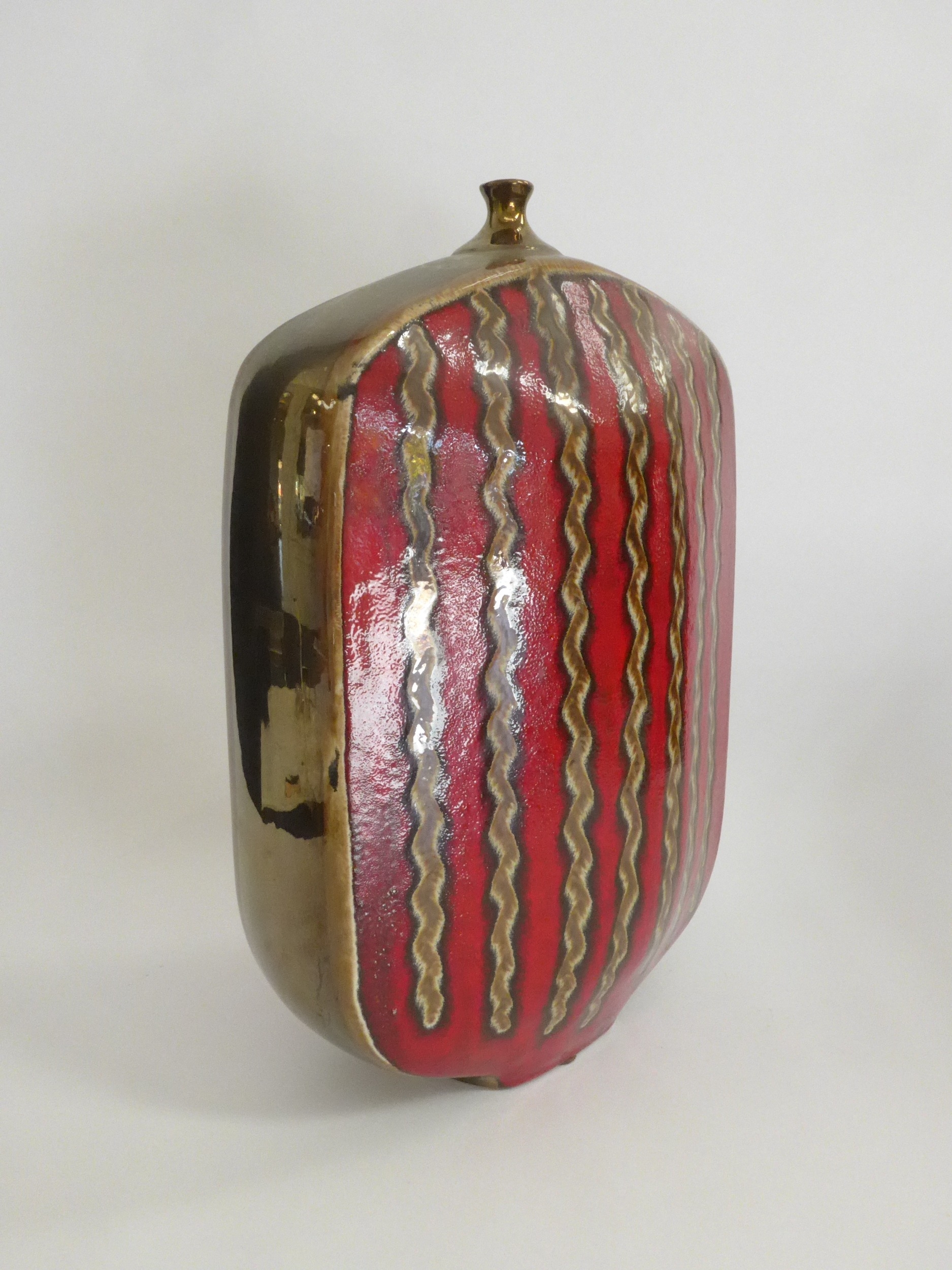 A modern pottery vase with red and bronzed glazes, vertical line detail. 41cm high