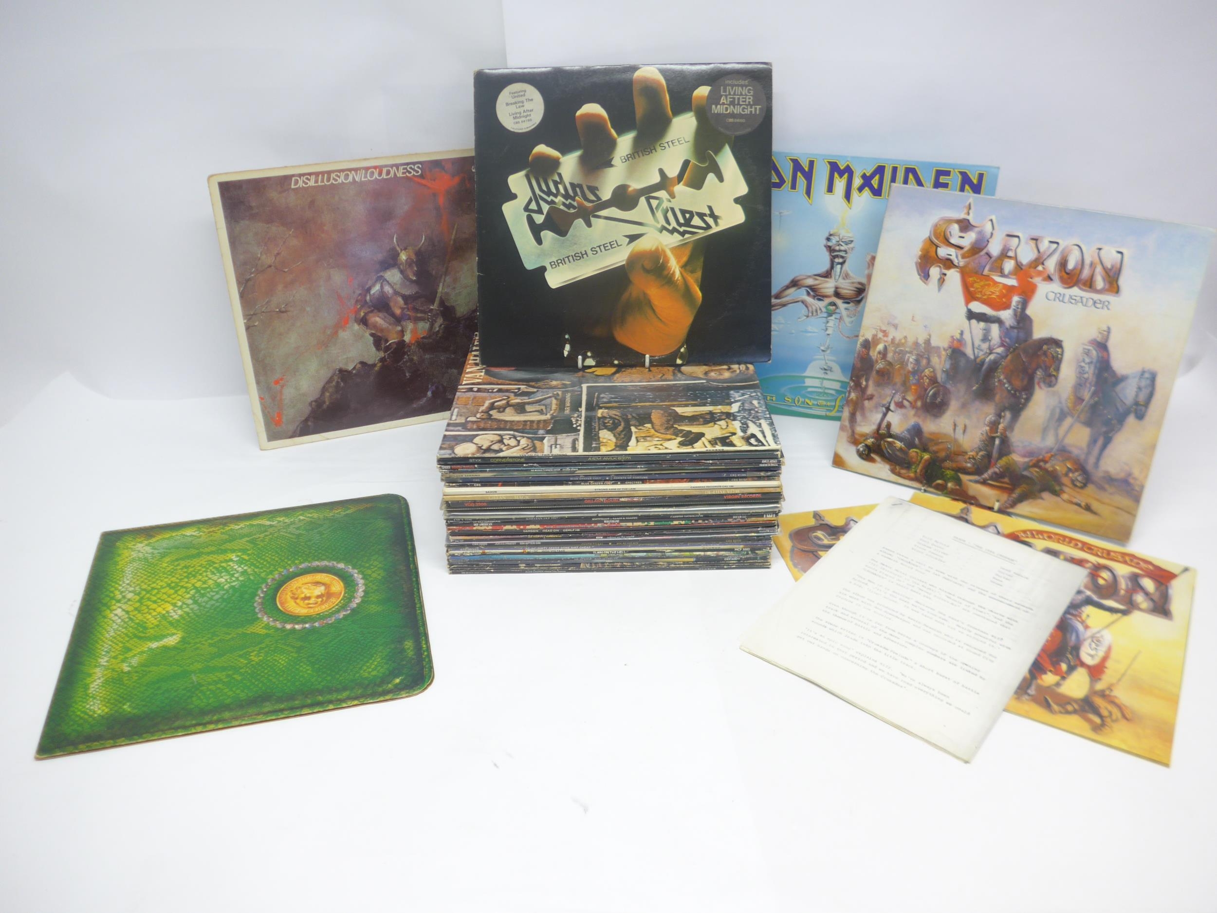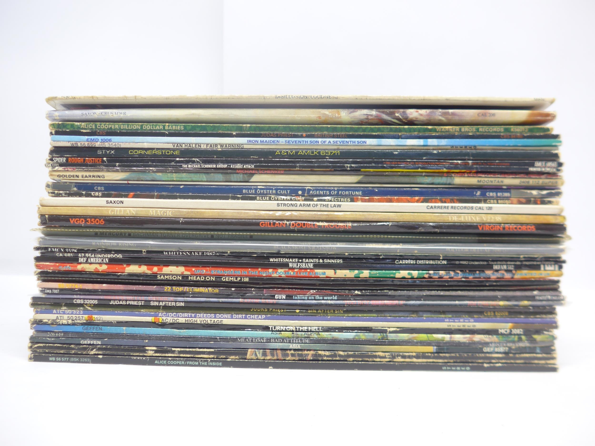 Hard Rock / Heavy Metal / Arena Rock - A collection of thirty-six LPs and three 12" singles to include JUDAS PRIEST: 'British Steel' (S CBS 84160) and 'Sin After Sin' (x2 copies, S CBS 82008 and CBS 32005 respectively), AC/DC: 'High Voltage' (ATL 50 257) and 'Dirty Deeds Done Cheap' with insert (ATL 50 323), IRON MAIDEN: 'Seventh Son Of A Seventh Son' (EMD 1006), FIST: 'Turn The Hell On' (MCF 3082), LOUDNESS: 'Disillusion' (Music For Nations MFN 22), SPIDER: 'Rough Justice' (AMLX 68563), ASIA: 'Asia' (GEF 85577) and 'Alpha' (GEF 25508), MEAT LOAF: 'Bad Attitude' with merchandise order form (206 619), ALIC COOPER: 'Billiin Dollar Babies' in embossed gatefold sleeve with One Billion Dollar Bill insert, lacking perforated band pictures (K56013), 'From The Inside' (K 56577) and 'The Early Recordings' (K 66021), BLUE OYSTER CULT: 'Agents Of Fortune' (CBS 81385), and 'Spectres' (S CBS 86050), SAXON: 'Strong Arm Of The Law' (CAL 120) and 'Crusader' with typed press release and two tour programmes (CAL 200), THE MICHAEL SCHENKER GROUP: 'Assault Attack' (CHR 1393) and 'The Michael Schenker Group' (CHR 1302), GOLDEN EARRING: 'Moontan' with insert (2406 112) and 'When The Lady Smiles' 12" (151.153), GILLAN: 'Magic' (V2238), 'Glory Road' (V2171) and 'Double Trouble' (VGD 3506), BACHMAN-TURNER OVERDRIVE: 'Not Fragile' (9100 007), RAINBOW: 'Rainbow Rising' and 'Difficult To Cure' (POLD 5036), WHITESNAKE: '1987' (EMCX 3528) and 'Saints & Sinners' (67.954), WOLFSBANE: 'I Like It Hot' 12" (DEFAM 512), UFO: 'Strangers In the Night' (CJT 5), SAMSON: 'Head On' with insert (GEMLP 108), ZZ TOP: 'Eliminator' (92-3774-1), GUN: 'Taking On the World' (AMA 7007), STYX: 'Cornerstone' (AMLK 63711), RAZOR BABY: 'Too Hot To Handle' (HM USA 102), VAN HALEN: 'Fair Warning' (K 56899) (39, vinyl and sleeves VG-VG+, some would benefit from cleaning)