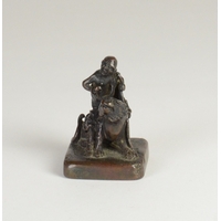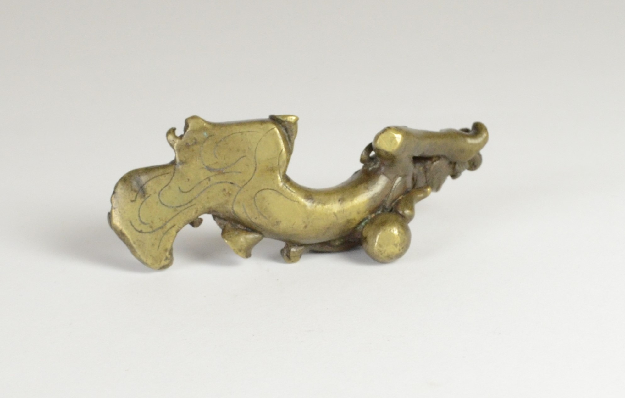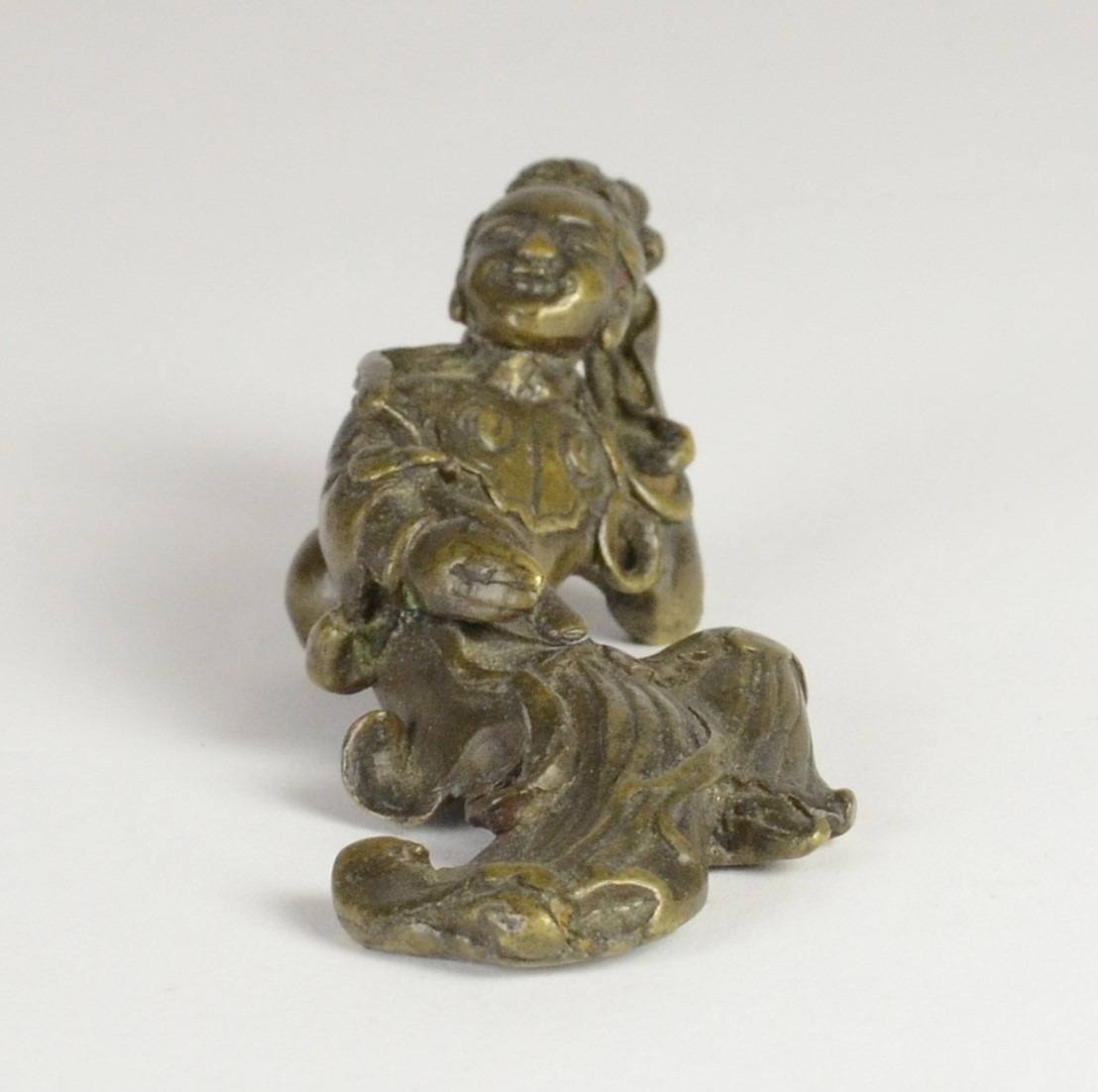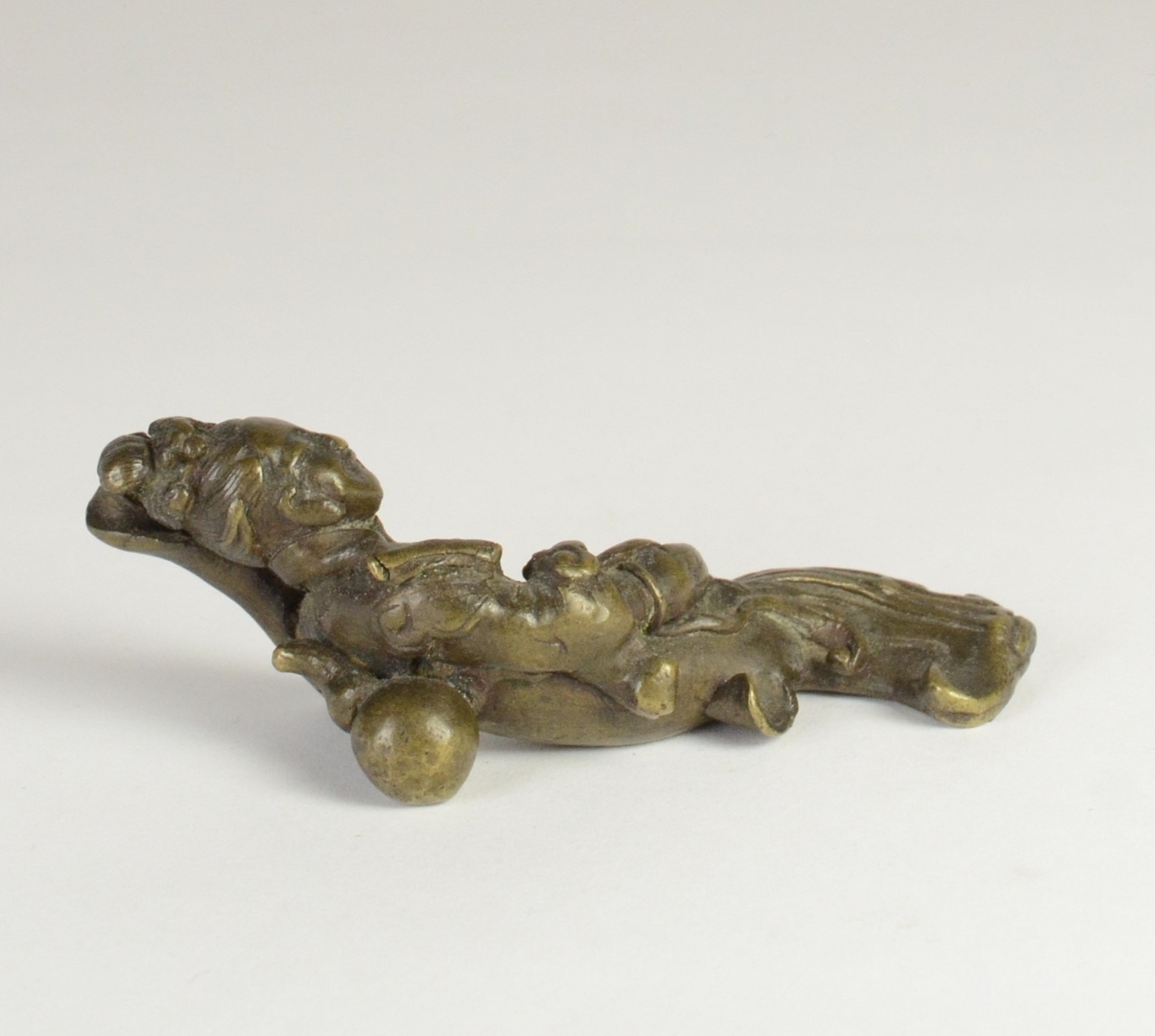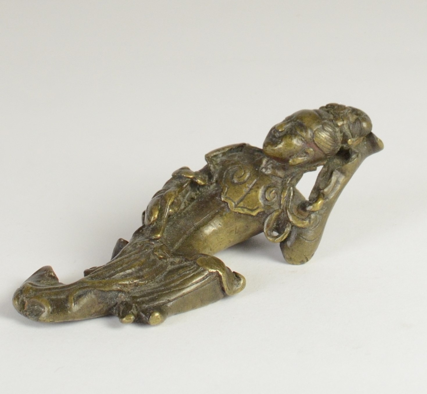 A Chinese bronze scroll weight in the form of a recumbent lady holding a ruyi sceptre7.7cm wide, 3cm deep and 2.7cm highProvenanceHenry Potter Stevens Collection