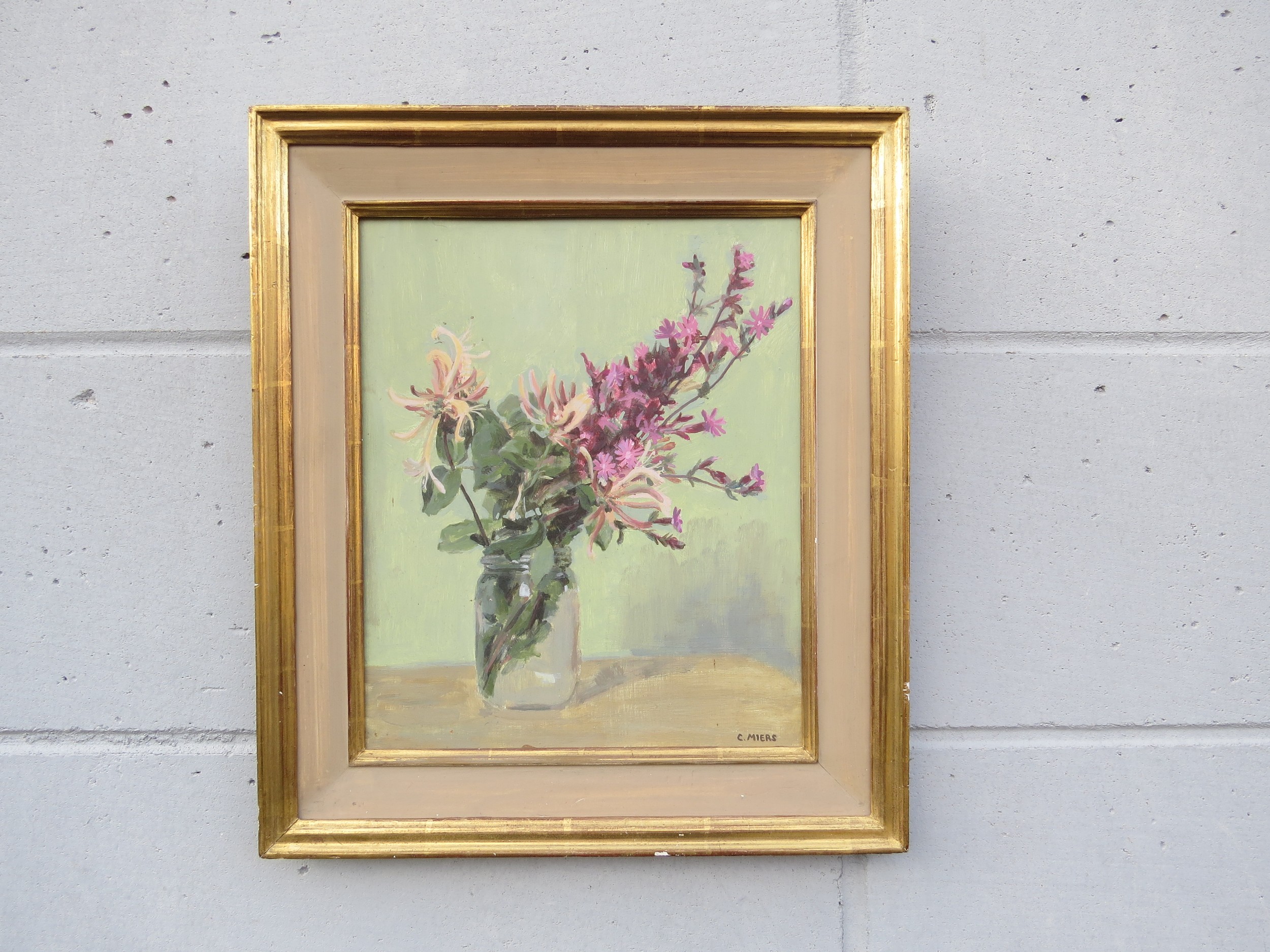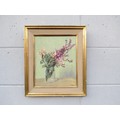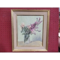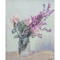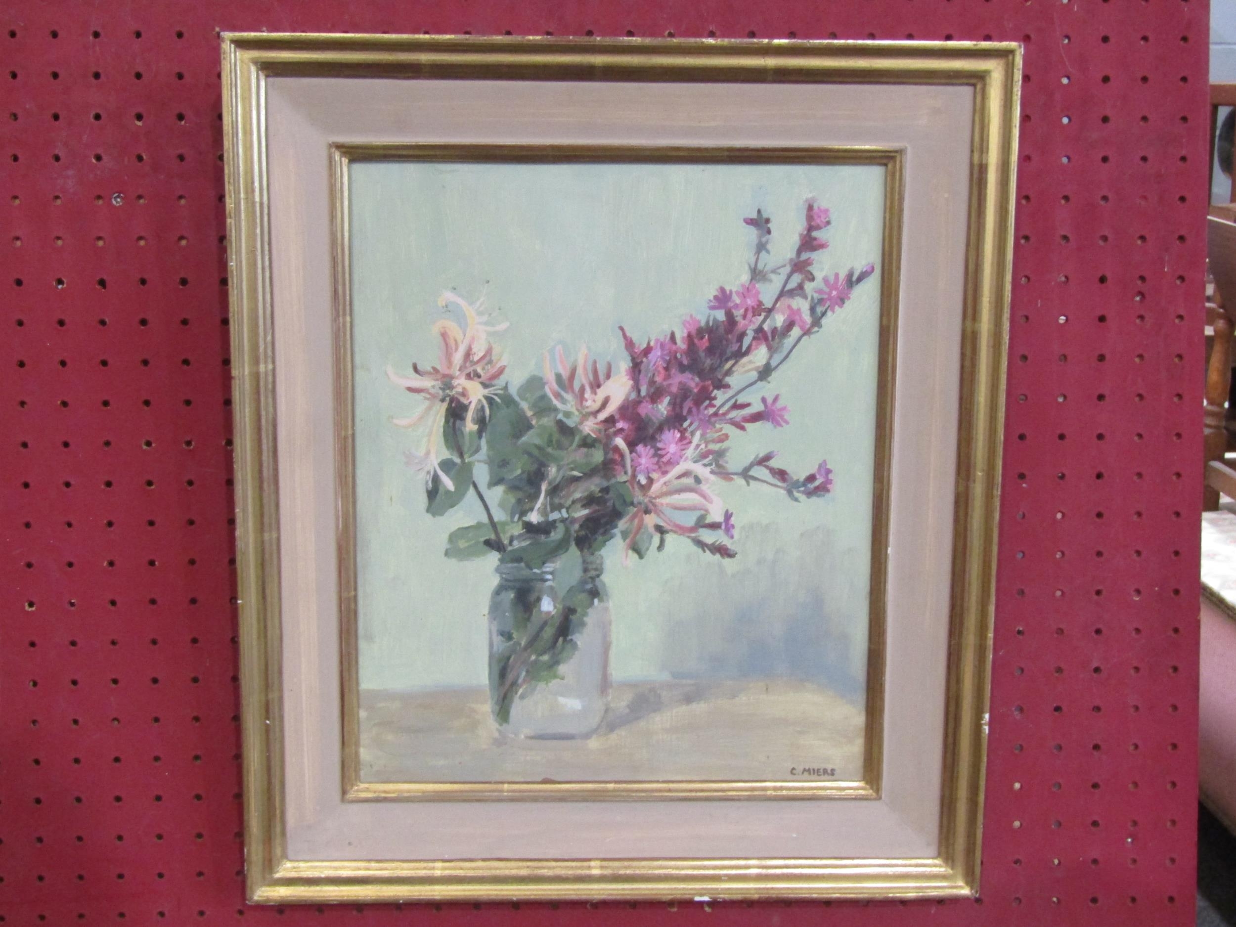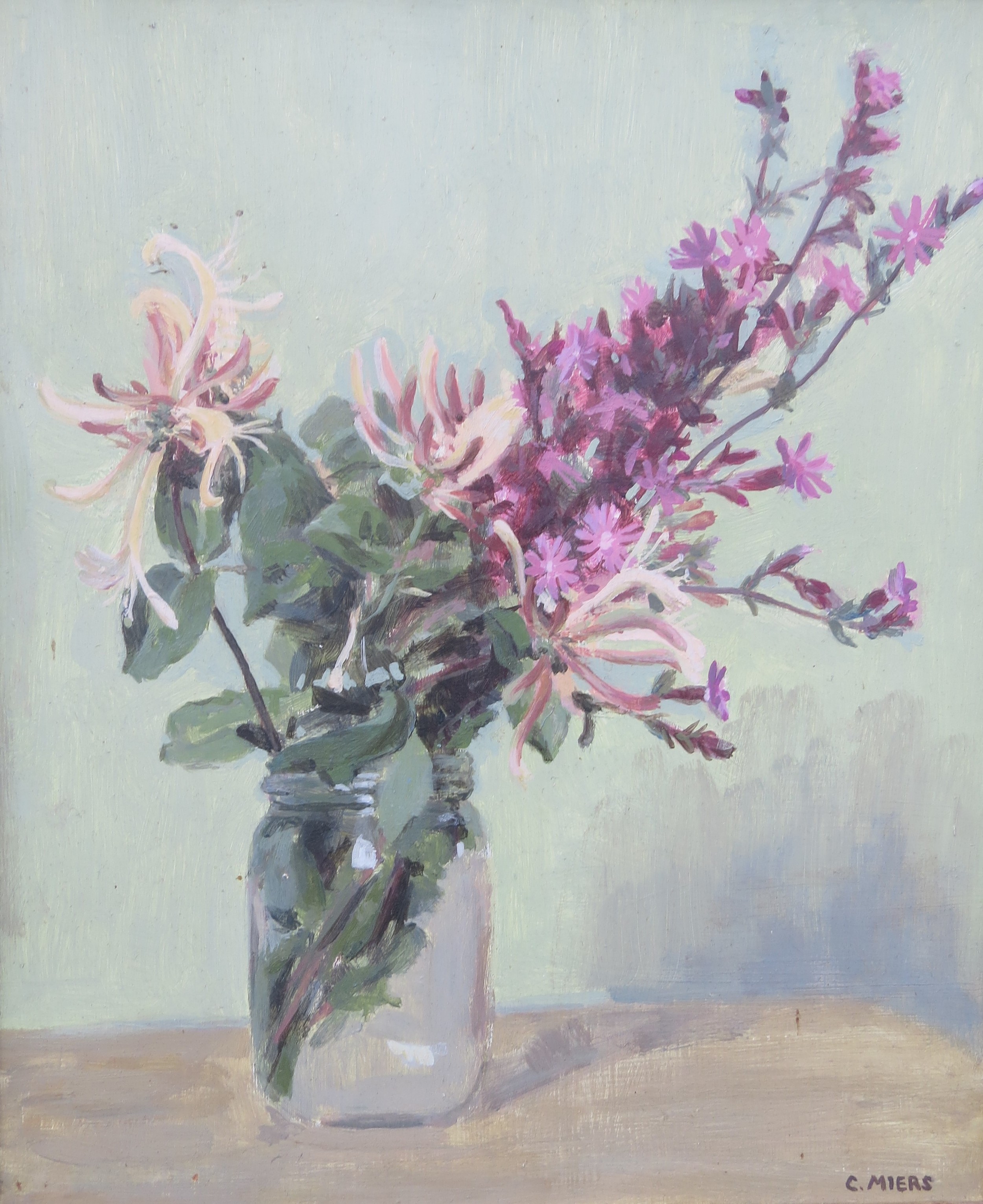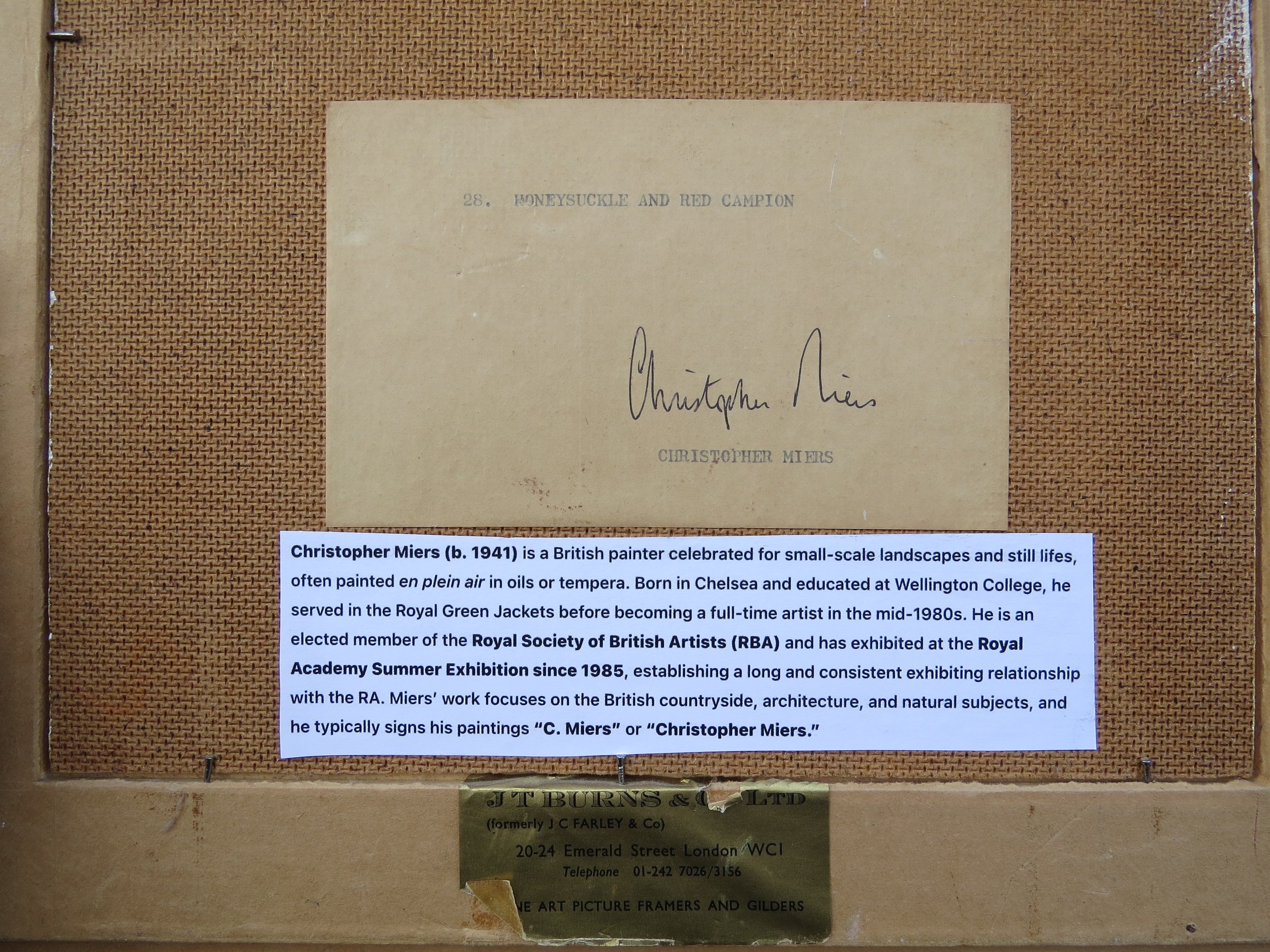 CHRISTOPHER MIERS R.B.A (b.1941): A framed oil on card still life titled 'Honeysuckle & Red Campion'. Signed bottom right. Image size 29.5cm x 24cm