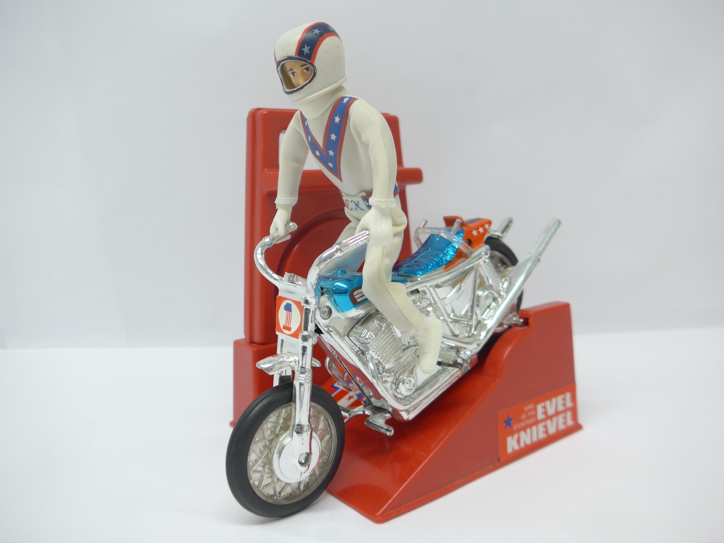 A 1970s Ideal Toys Evel Knieval action figure with stunt cycle and launcher