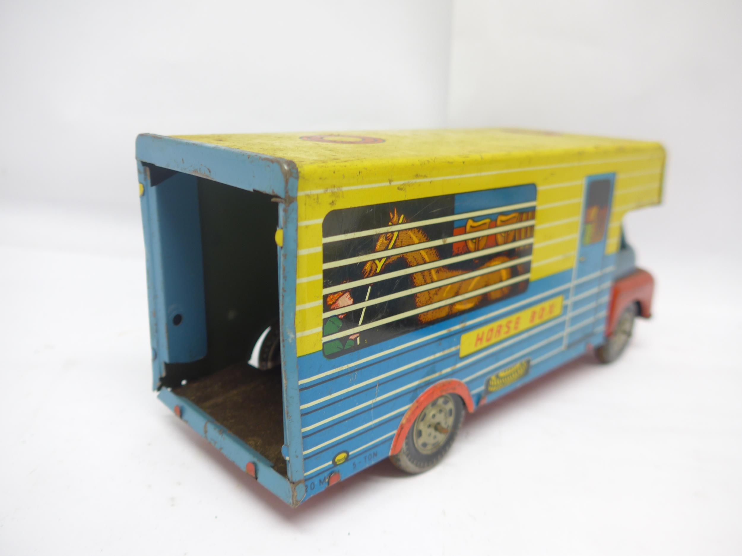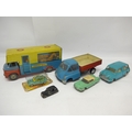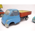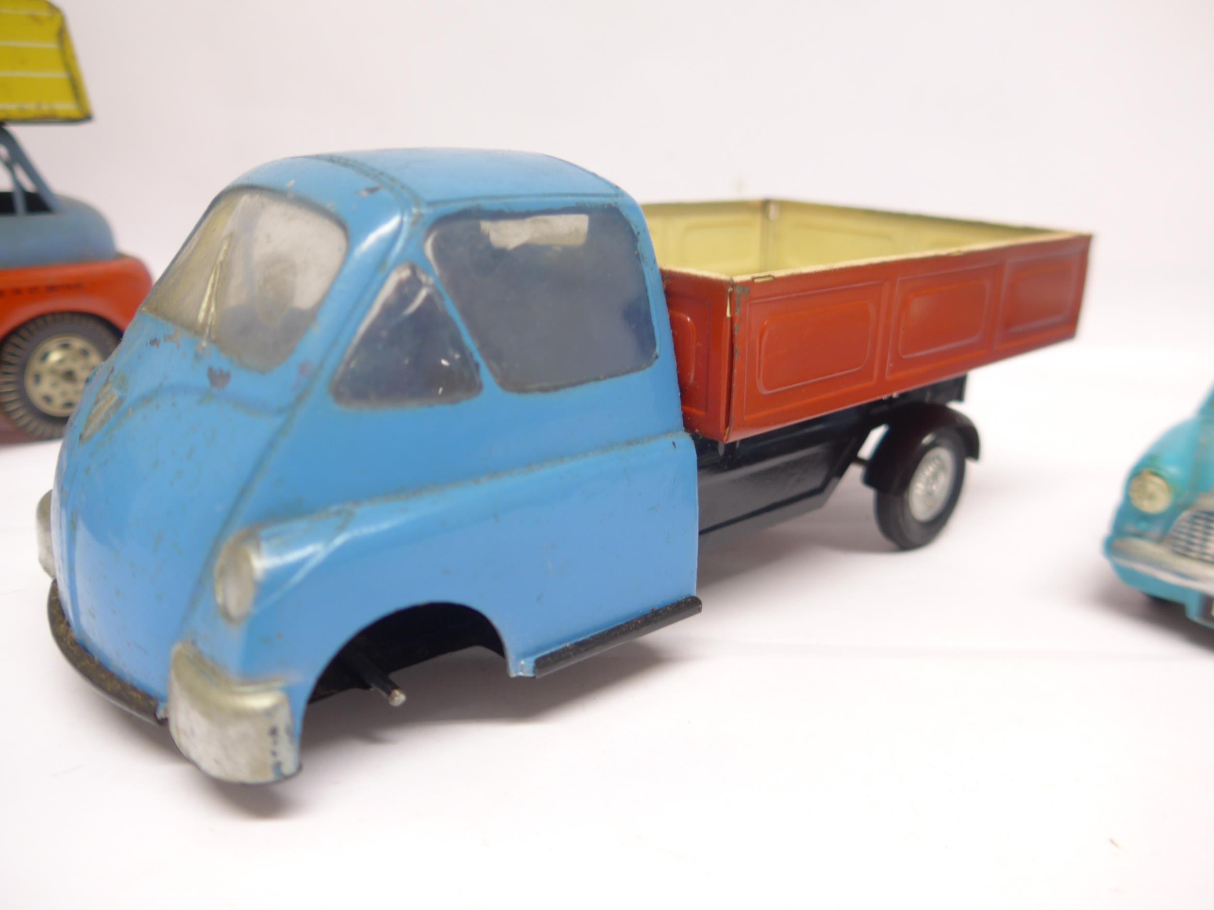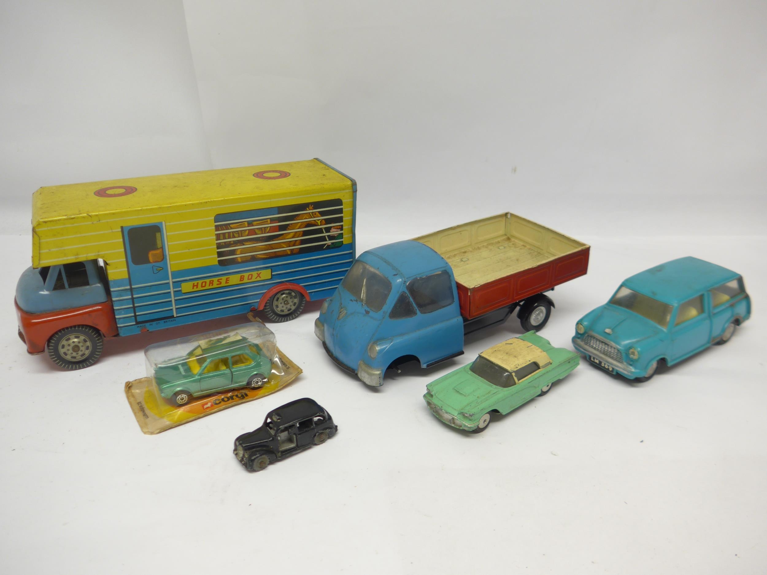 A mixed group of model vehicles to include Wells Brimtoy clockwork tinplate Horse Box (missing rear door), Clim Hermanos tinplate and plastic friction drive Isetta flatbed truck (missing one wheel), Hong Kong made plastic friction drive Morris Traveller, and three diecast vehicles comprising Corgi Ford Thunderbird and 92 Volkswagen and Budgie no. 13 Austin Taxi Cab (6)