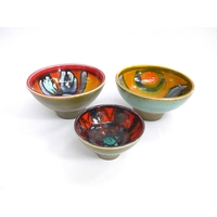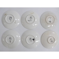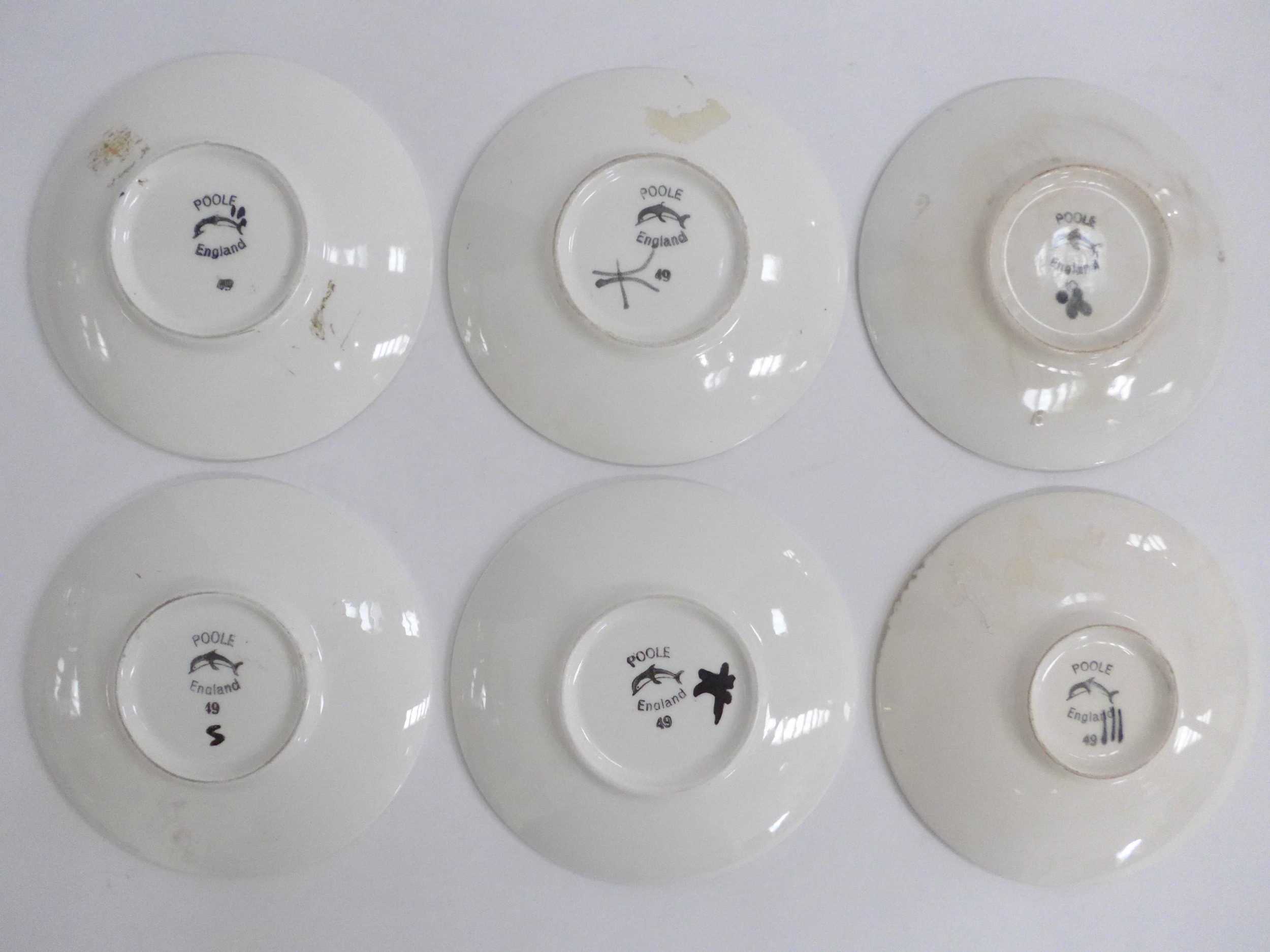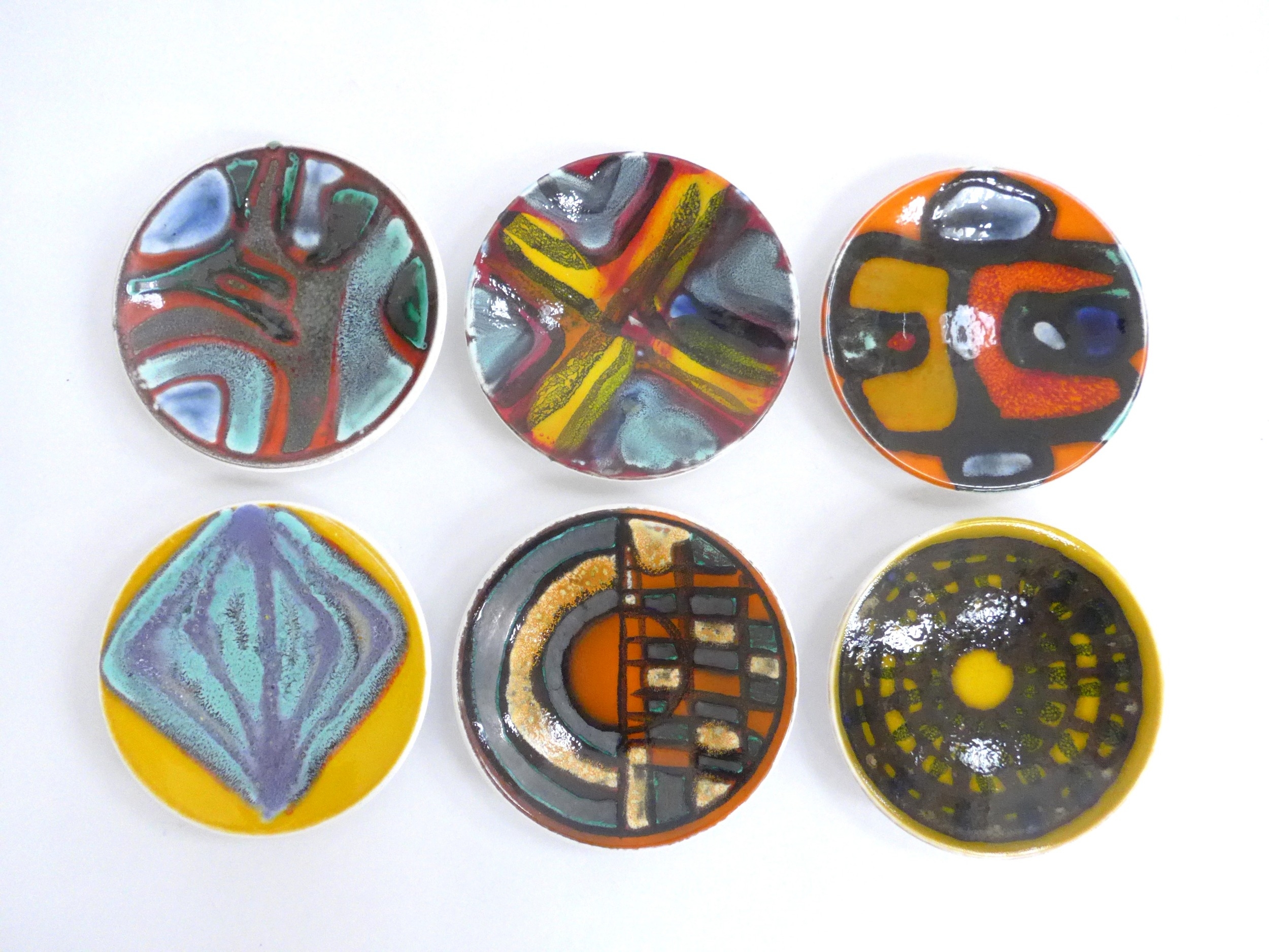 Six small Poole Pottery Delphis range pin dishes, various colours. Black backstamps. 12.5cm diameter