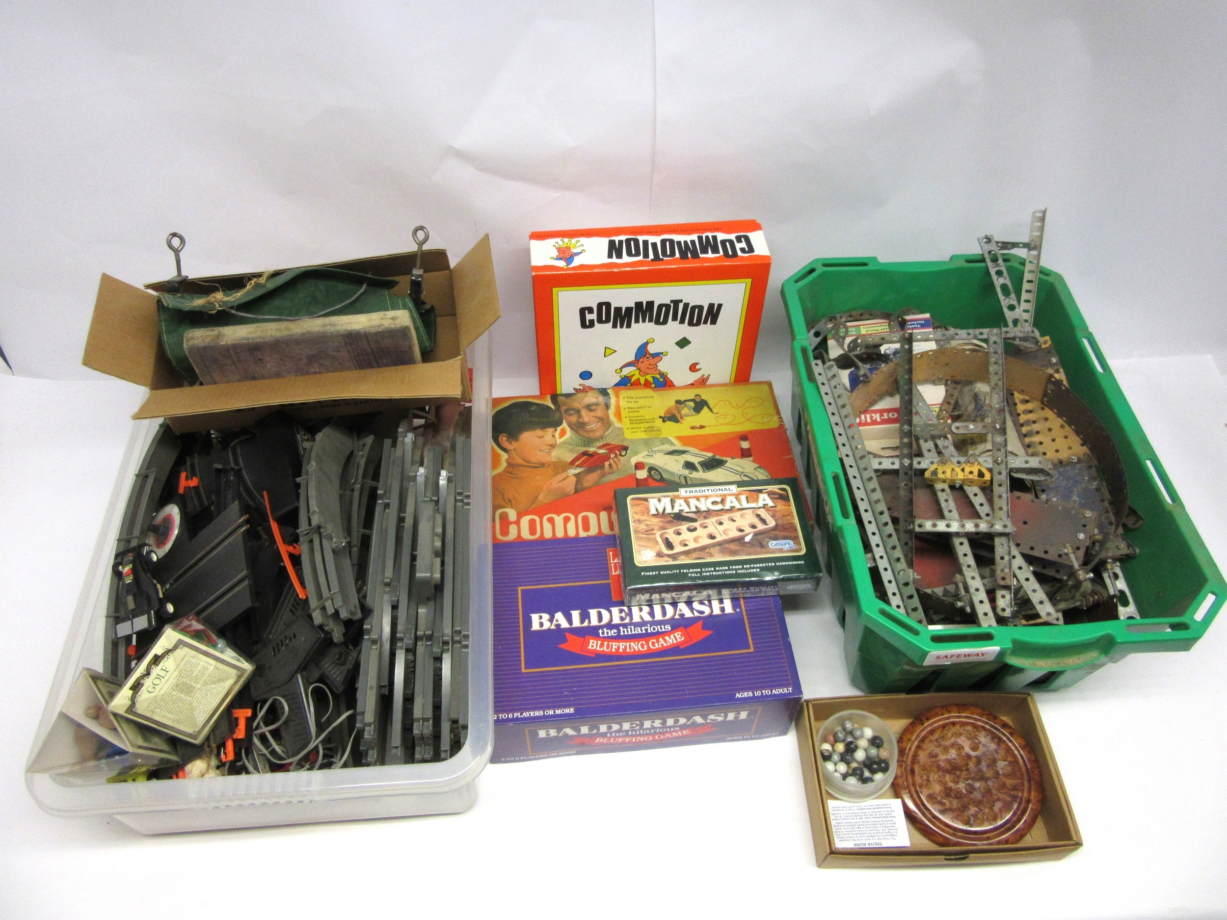 A mixed group of toys and games including Mettoy Computacar, unboxed Escalado racing game with painted lead horses, loose Meccano (a/f), slot racing track and cars, burr wood solitaire board and stone marbles, 'Mancala', 'Commotion', 'Balderdash' etc