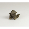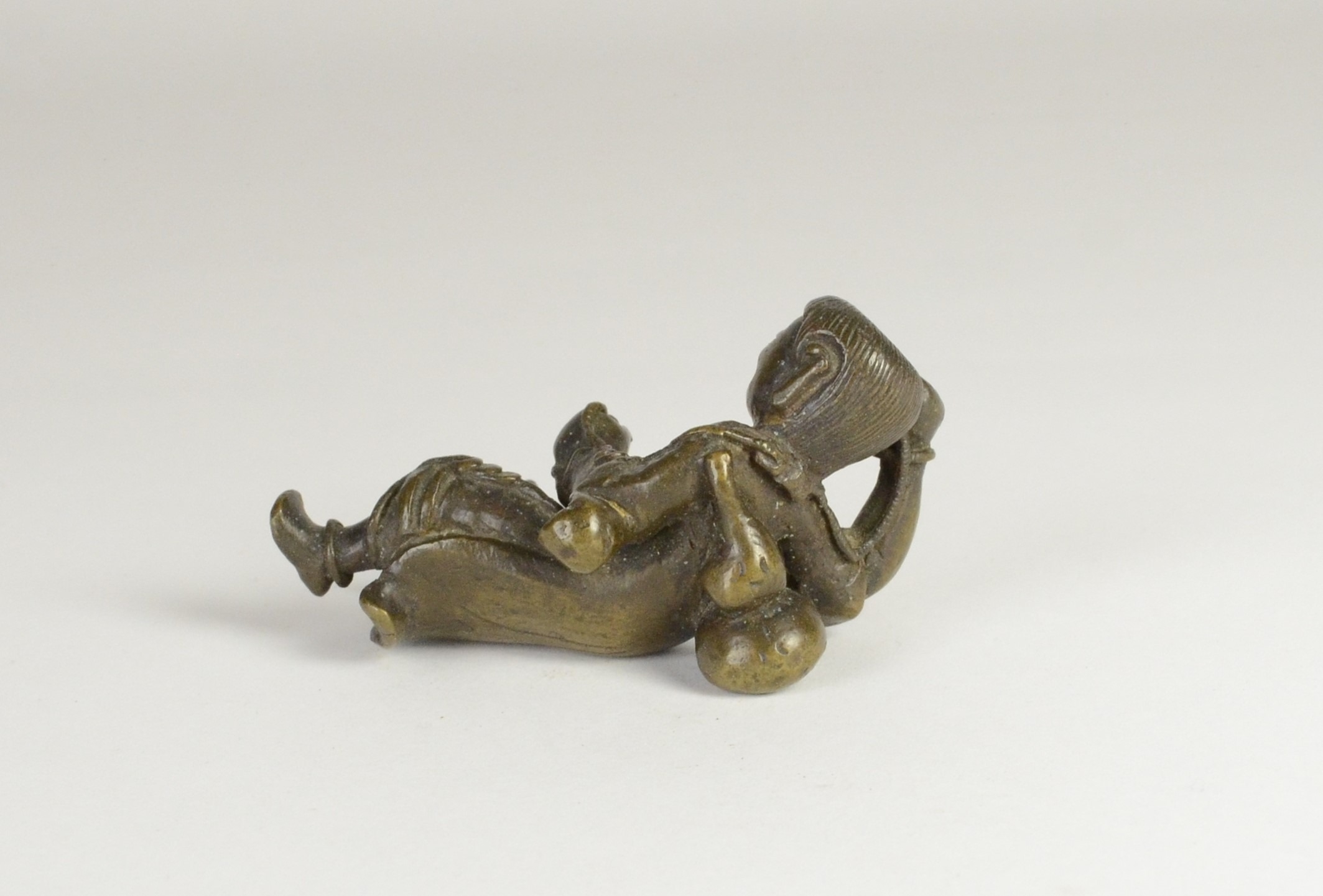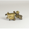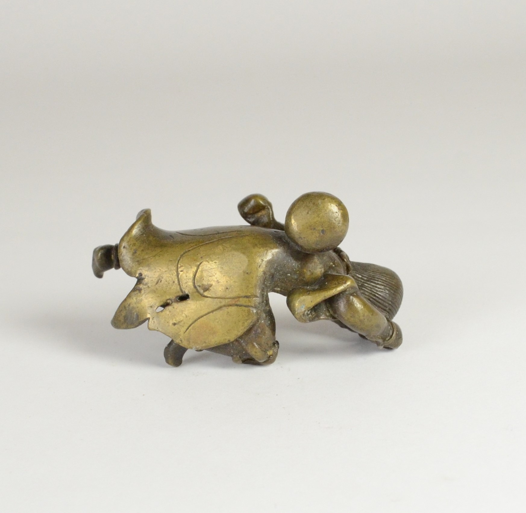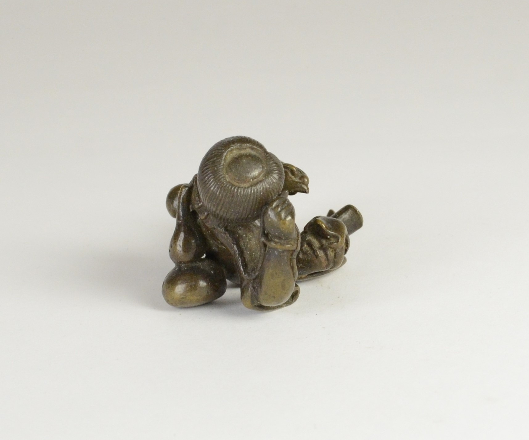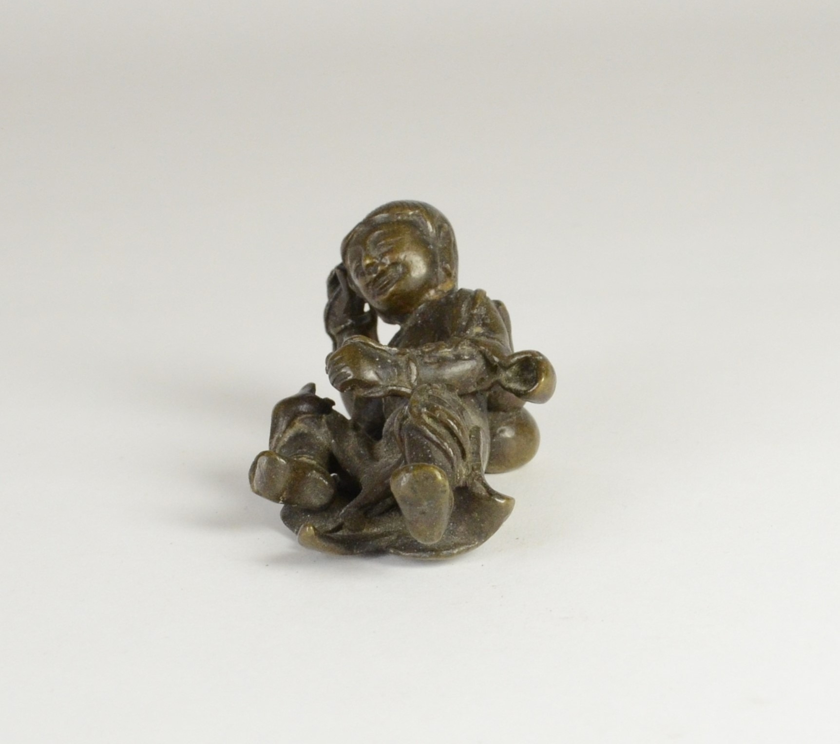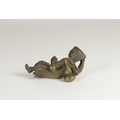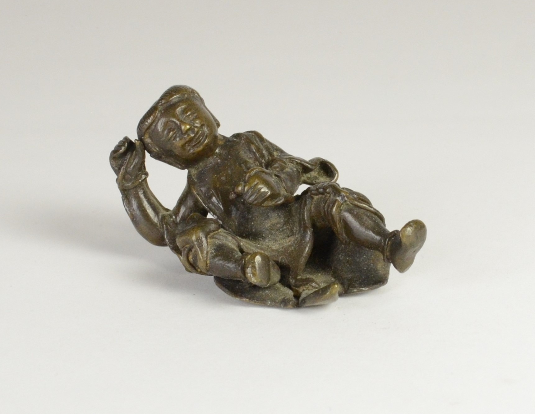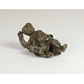 A Chinese bronze scroll weight of a recumbent Liu Hai with toad resting on knee7cm wide, 4cm deep and 3.4cm highProvenanceHenry Potter Stevens Collection