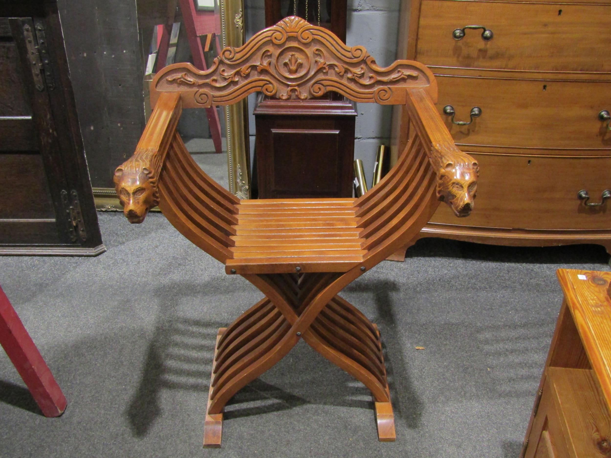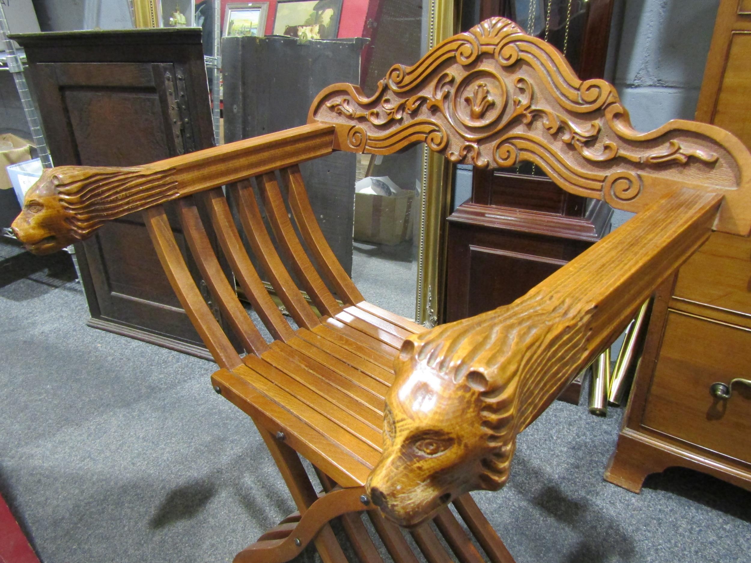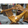 An Asian folding chair with lion mask arm rests