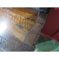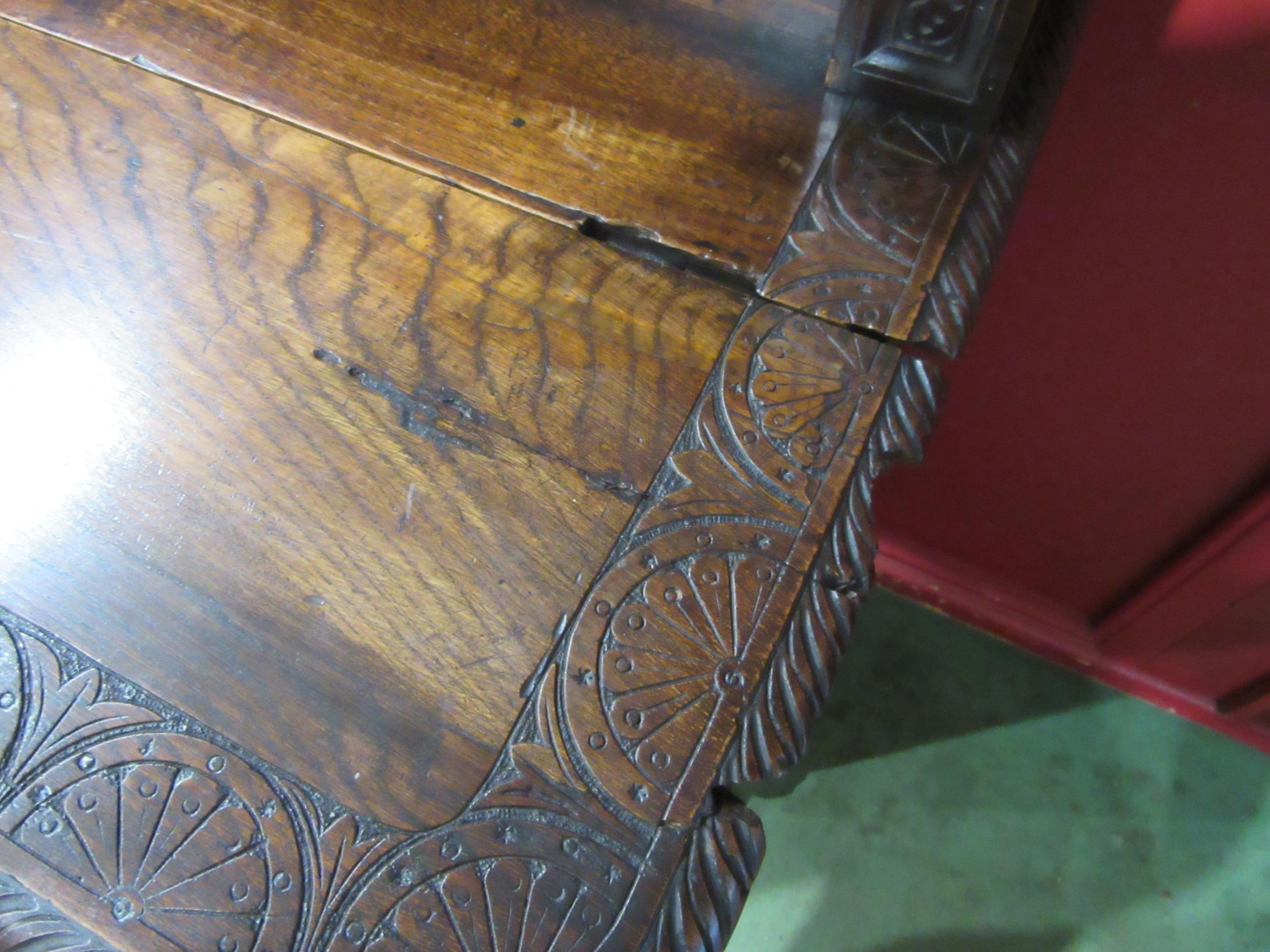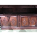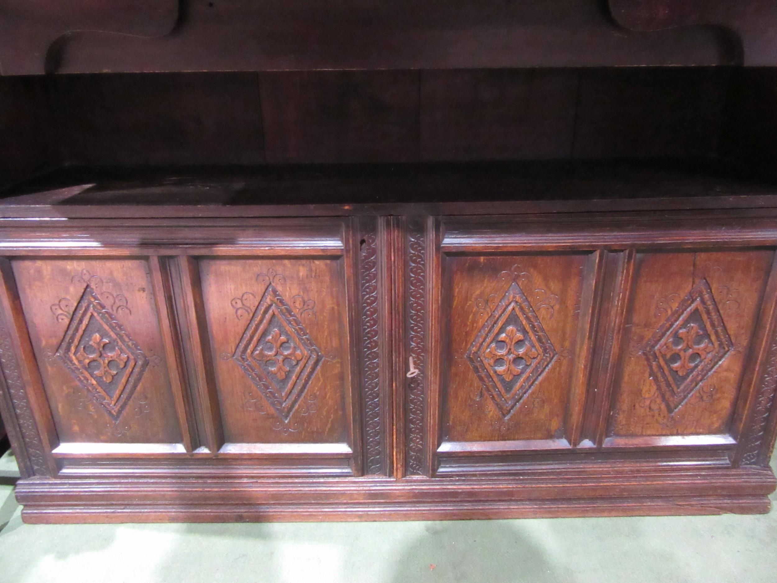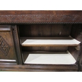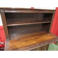 A Georgian "Bwyhyn" Welsh oak dresser of small proportions with carved decoration raised on open shelves over a rising table leaf and open shelf over a two door cupboard with key, 144cm tall x 126cm wide x 32cm deep (not including rising leaf)