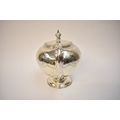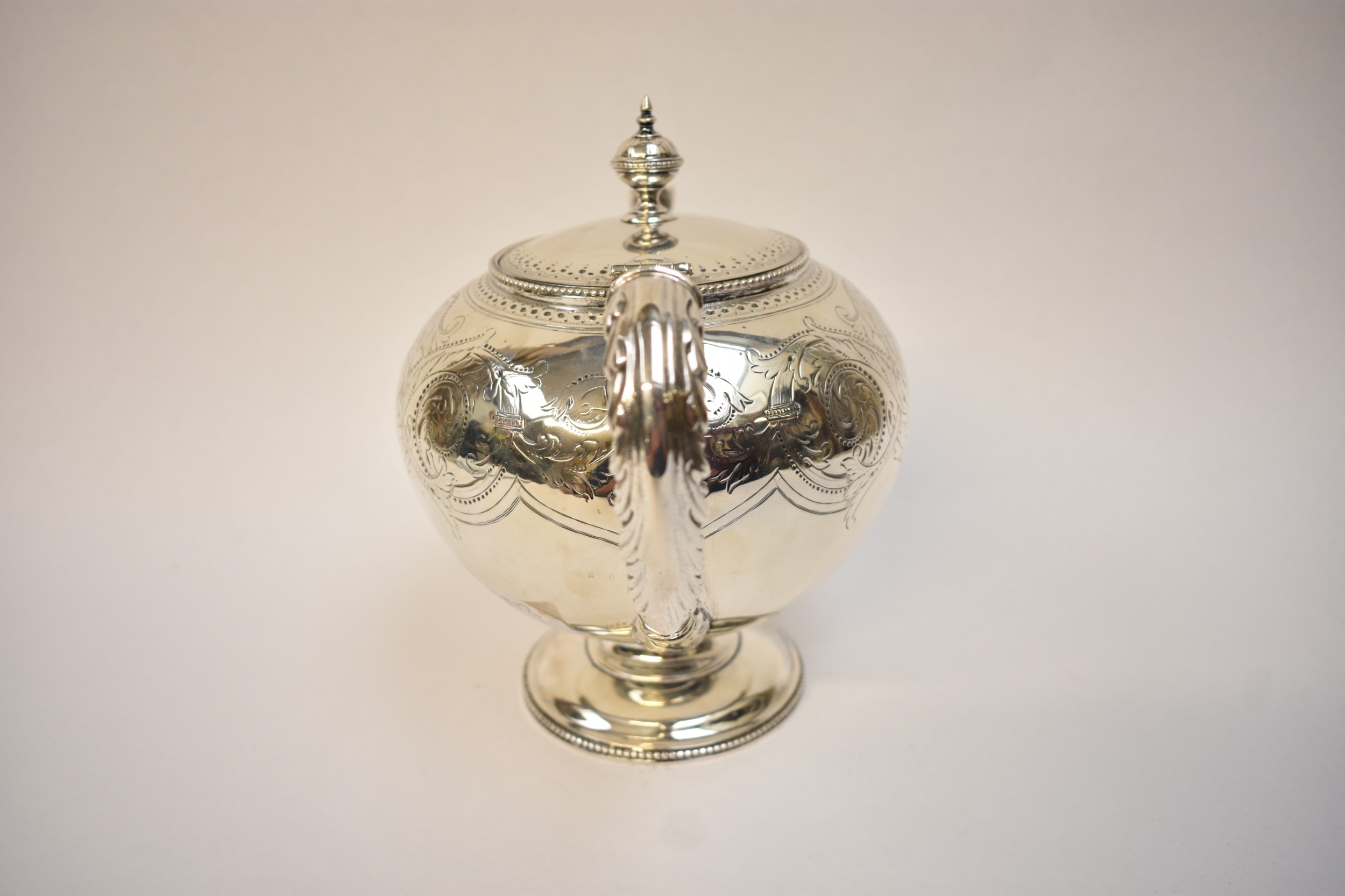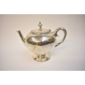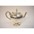 J.W. & Co., a Victorian silver teapot of pedestal form, ivory heat insulators, foliate repoussé to handle and scrolling design engraved around the body, "Deo Volente" to cartouche, Exeter 1875, 18cm tall x 24cm long. 682g.