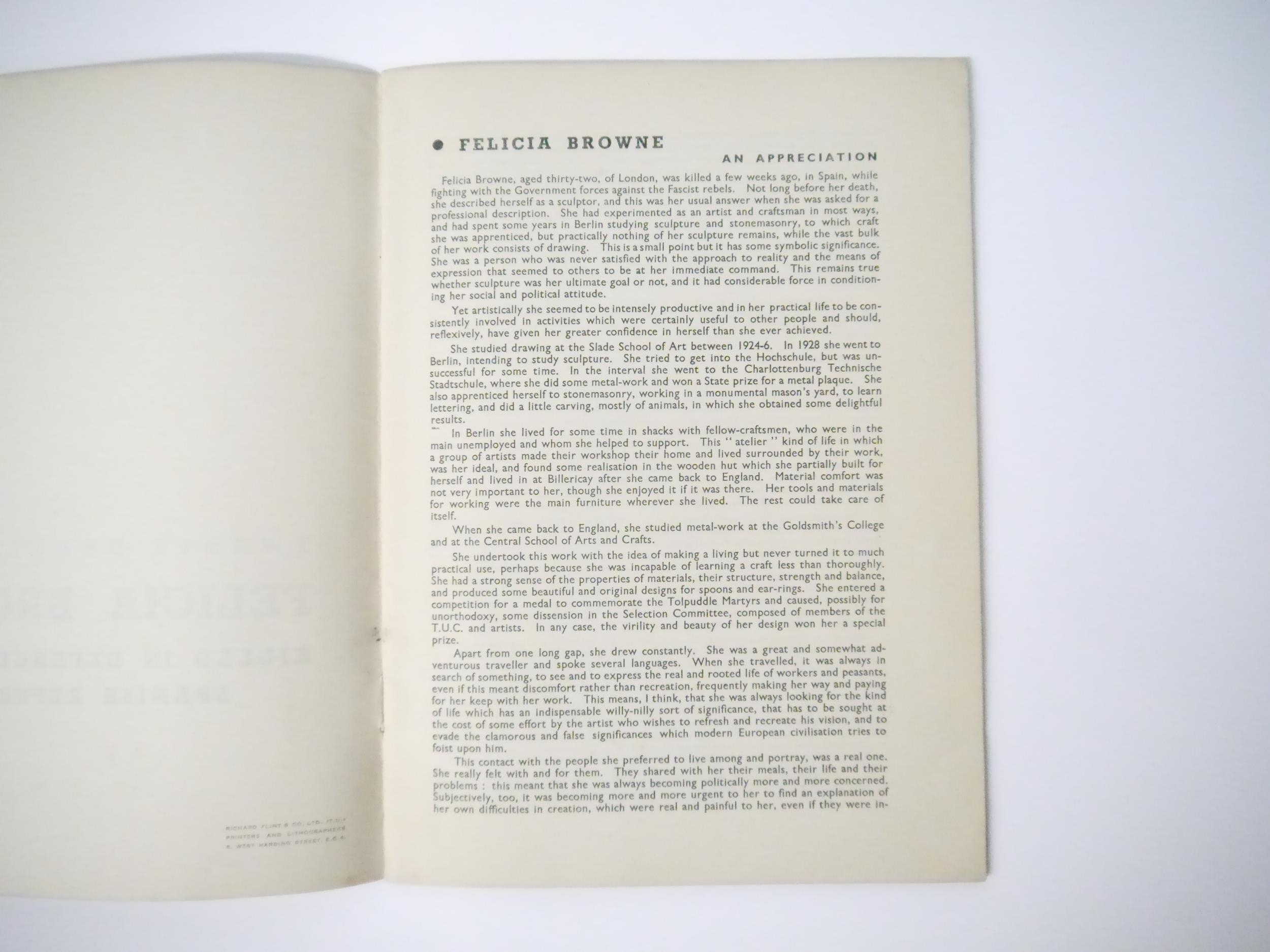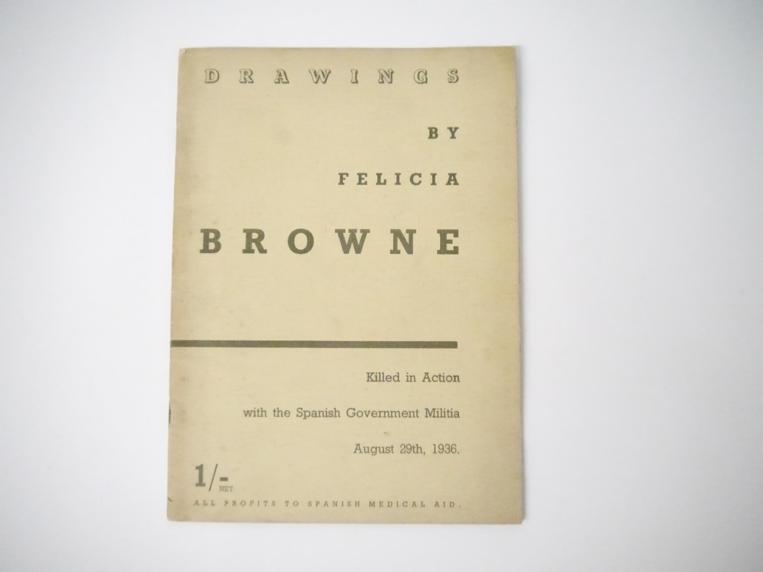 Felicia Browne: 'Drawings by Felicia Browne. Killed in Action with the Spanish Government Militia', London, Lawrence & Wishart, 1936, 1st edition, [28]pp, 20 full page b/w illustrations, 4to (24.5 x 18cm), original stapled printed wraps. Felicia Mary Browne (1904–1936) was an English artist and communist. She was the only British woman combatant and first British volunteer to die in the Spanish Civil War. On 25 August 1936 Browne was killed in action on the Aragón front near Tardienta, while part of a band of raiders that attempted to dynamite a Fascist munitions train. The party was itself ambushed and Browne was shot dead while assisting an injured Italian comrade. Browne's body had to be left there but comrades retrieved a sketchbook from her possessions filled with drawings of her fellow fighters. These made their way to Tom Wintringham, a journalist for the Daily Worker, who suggested to Harry Pollitt that they be sold by the Artists' International Association to raise money for Spanish relief.