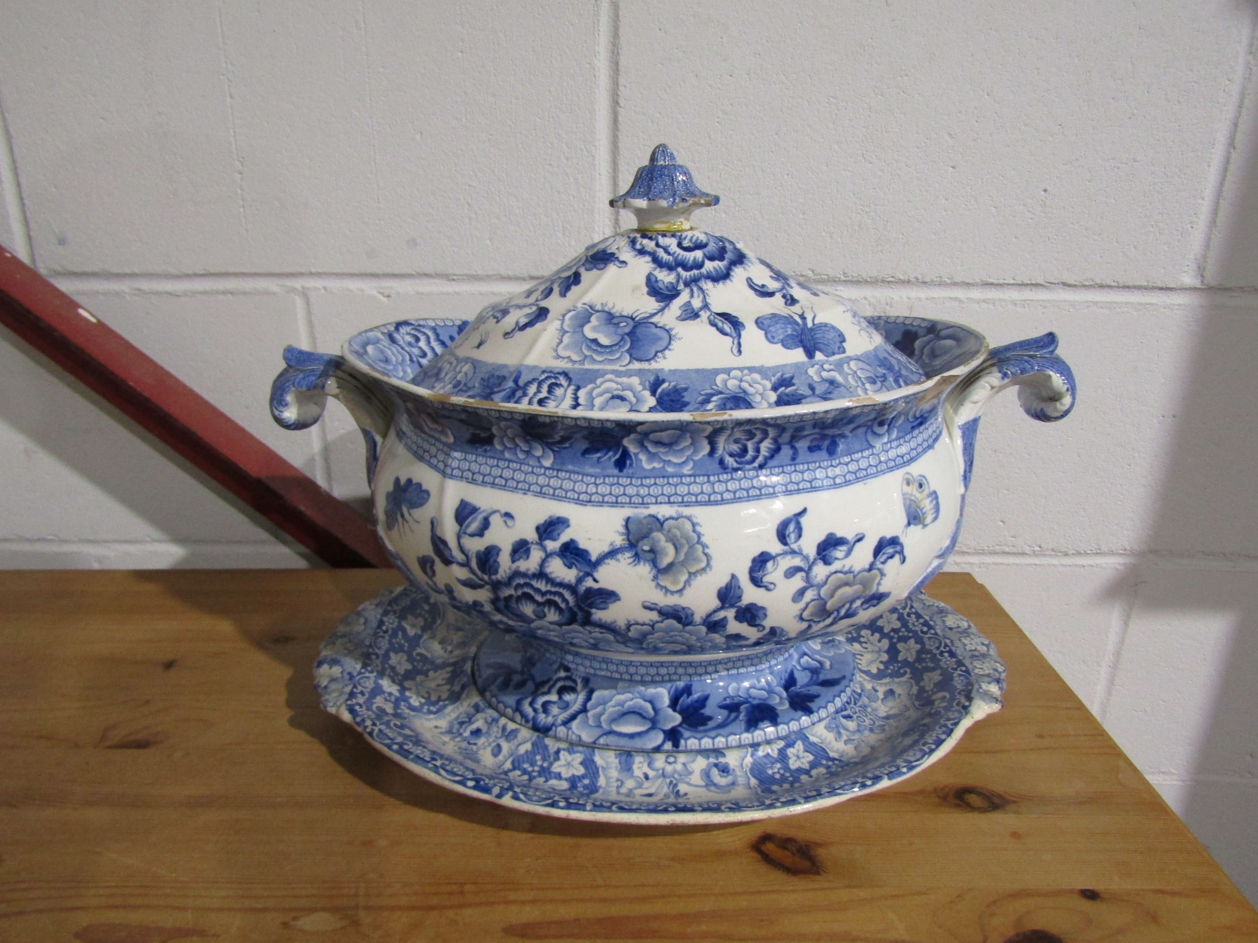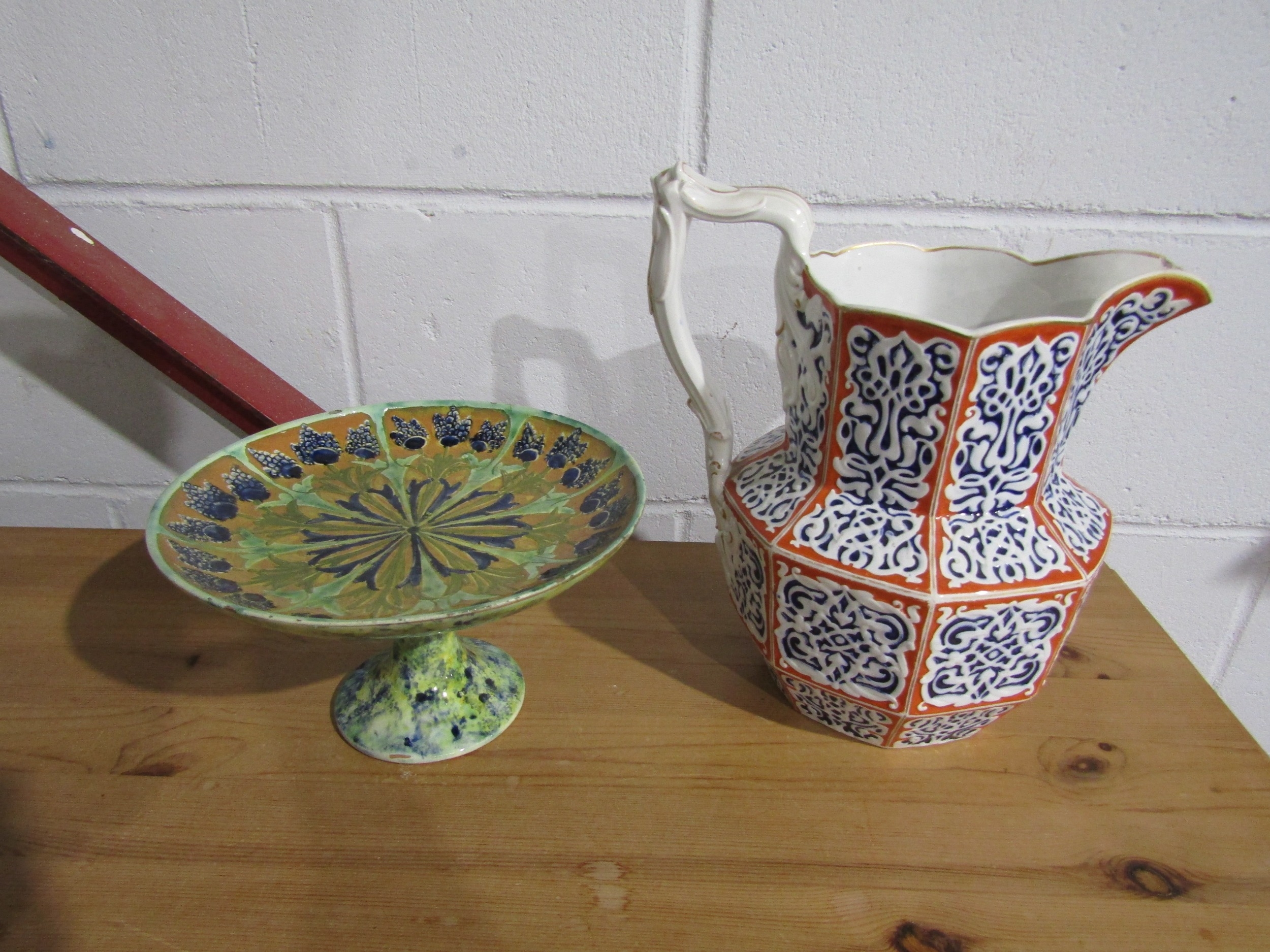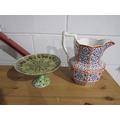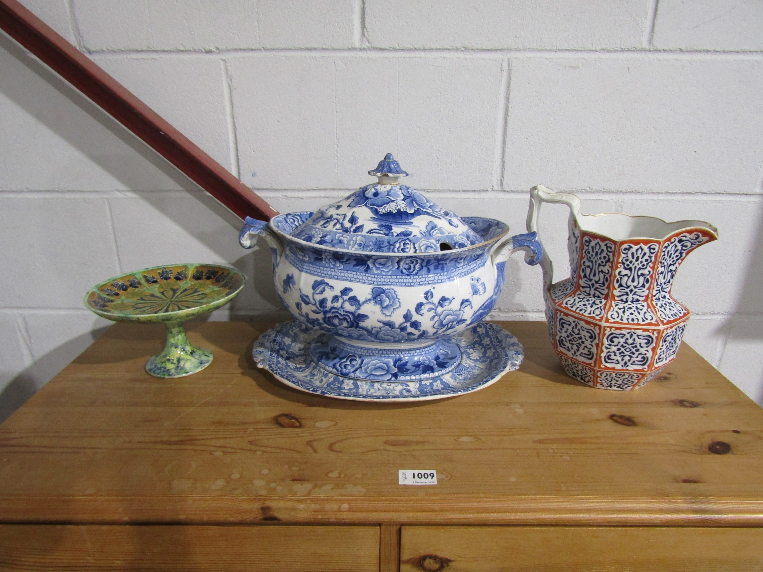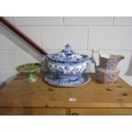 A collection of ceramics and glassware to include a blue and white tureen and cover, sponge ware decorated pedestal dish and a red white and blue jug (3) a/f