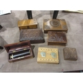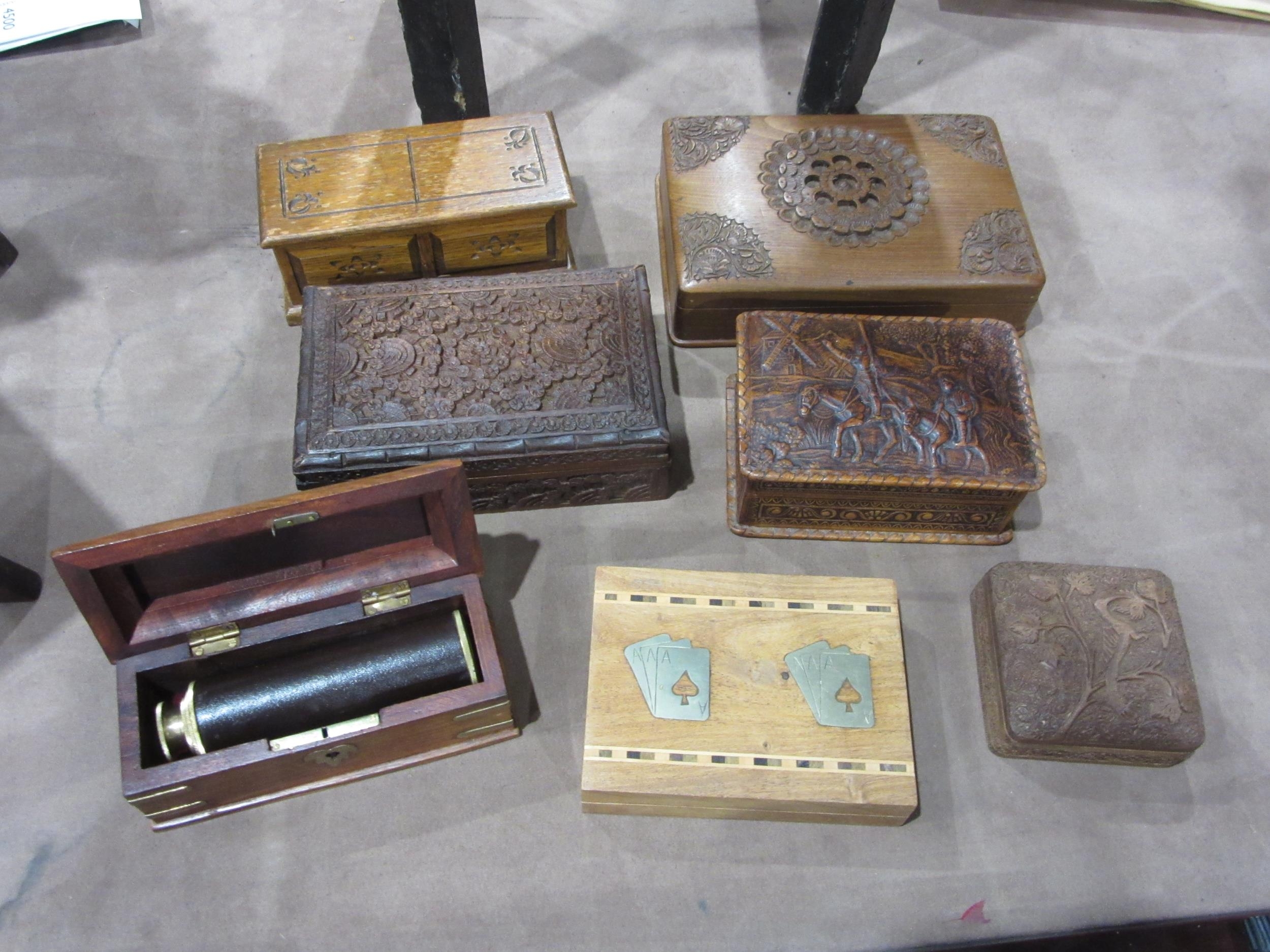 Seven assorted wooden boxes including carved examples, games boxes, brass inlaid etc.