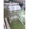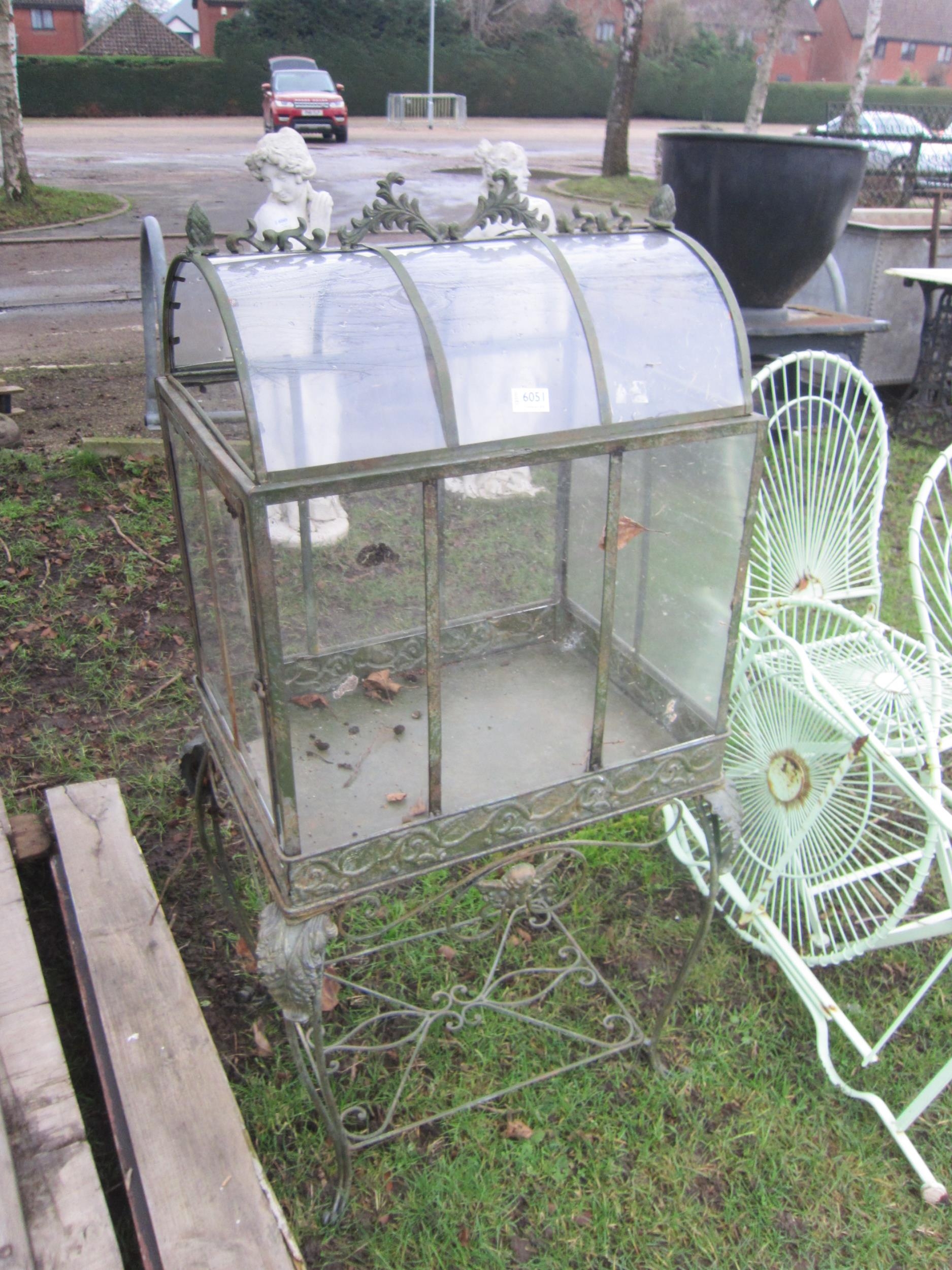 A decorative metal and glass terrarium on stand, perspex arched top panels, 125cm high