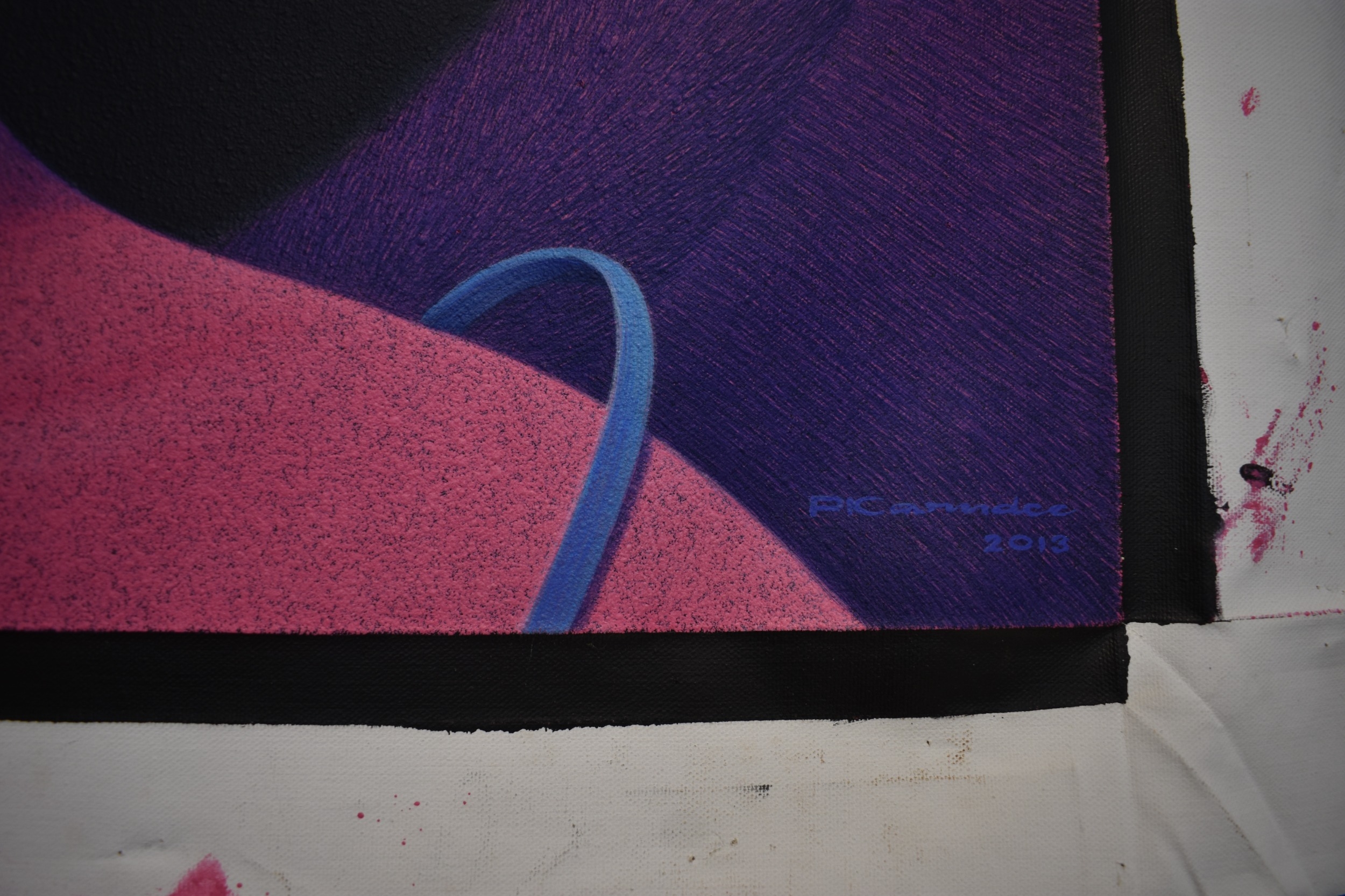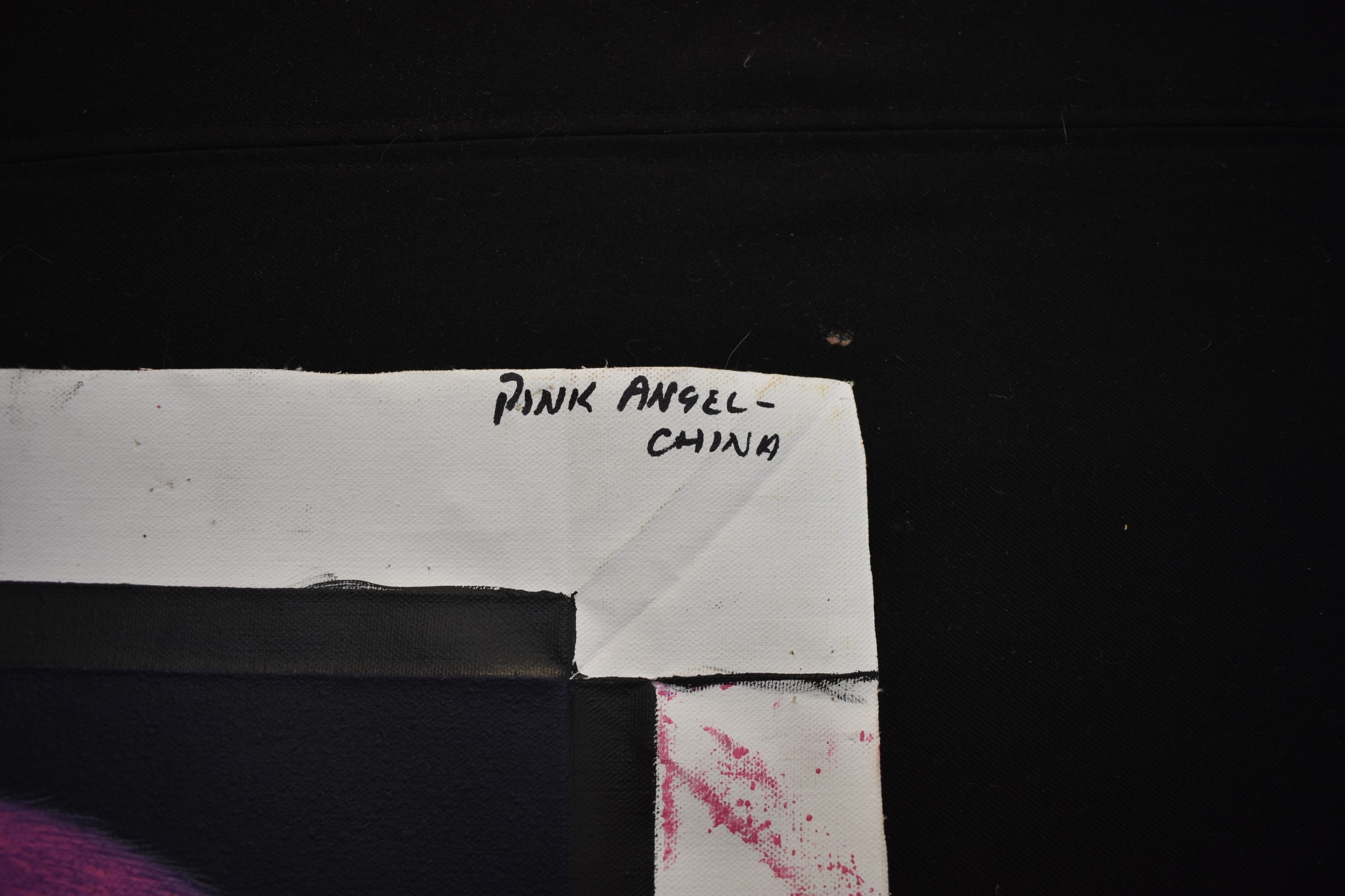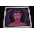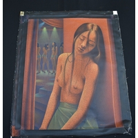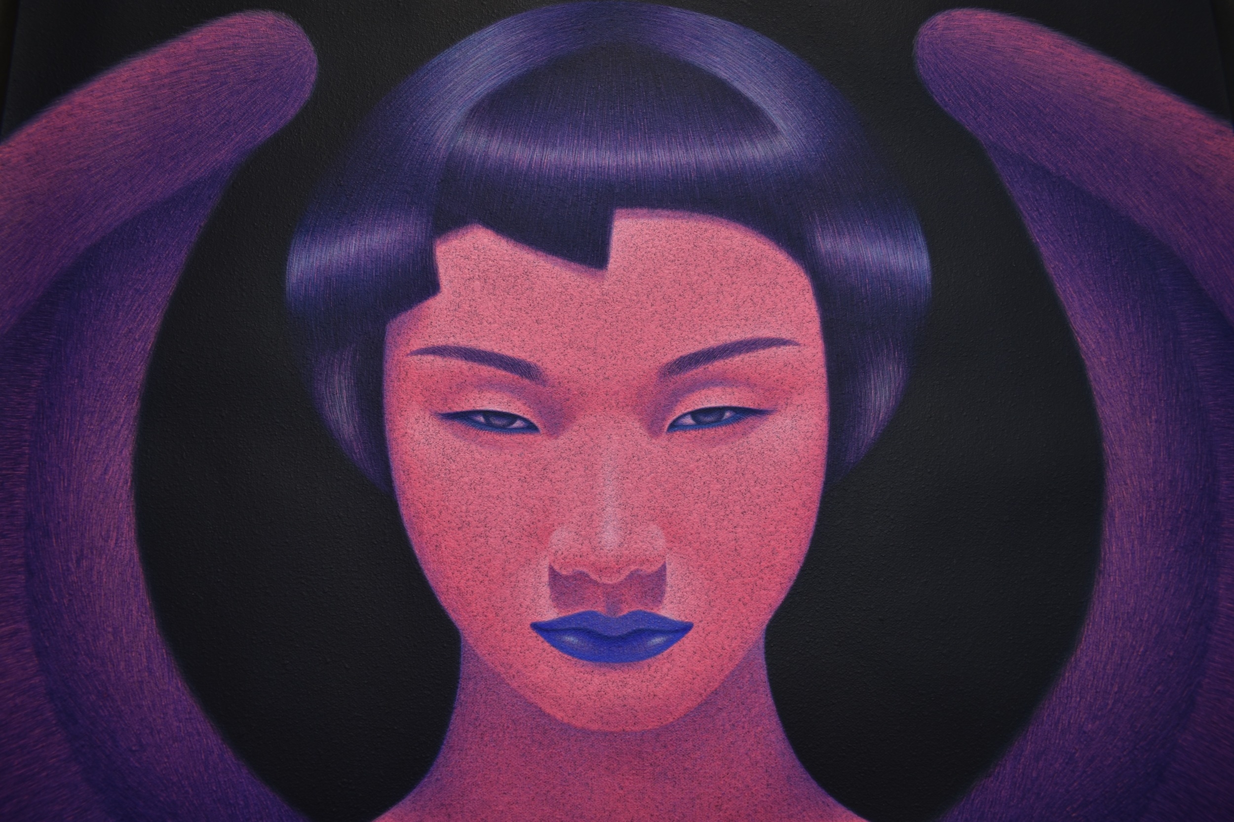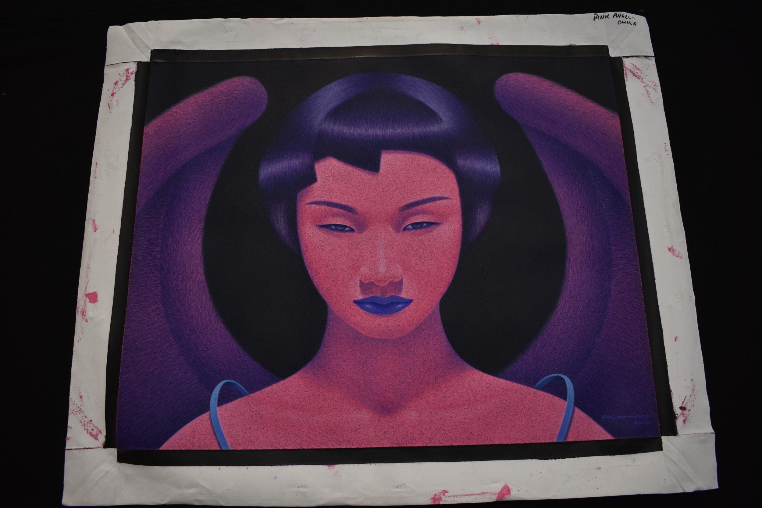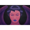 PAIROJ KARNDEE Thai Contemporary Artist: Portrait female in Angel form, titled " Pink Angel China" shoulder & head image with blue lips, pink tonal skin, acrylic on canvas. The artist has been influenced by the mysterious Apsaras - the celestial maidens of ancient Asian culture depicted in the galleries of Cambodia's Angkor Wat. His techniques painstakingly recreate the stone textures of those images with a time-consuming rendering of acrylic on linen canvas. His figures show a notable range of emotions. Signed and dated, 2013, image size 59.5cm x 74.5cm