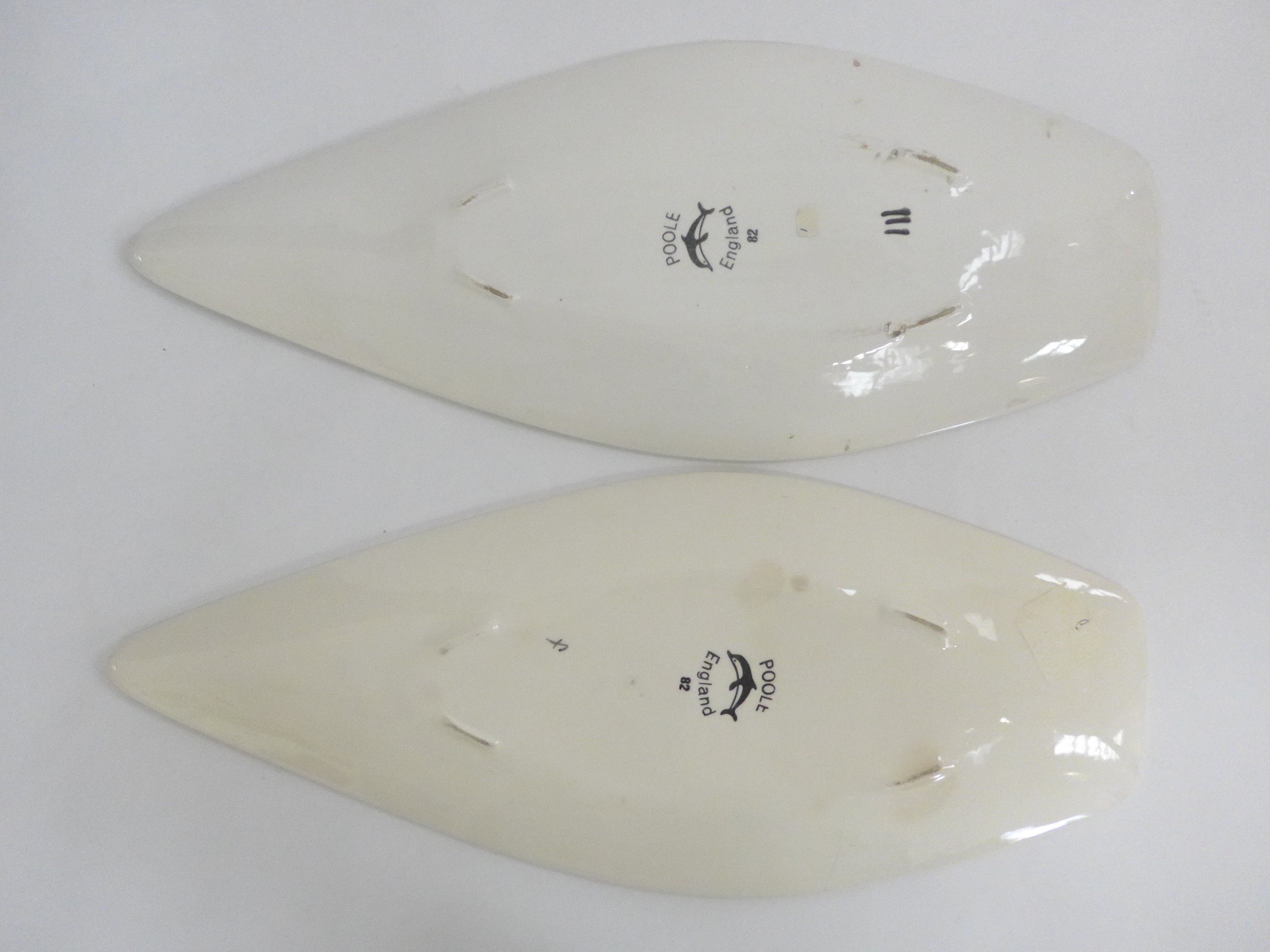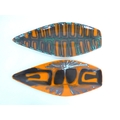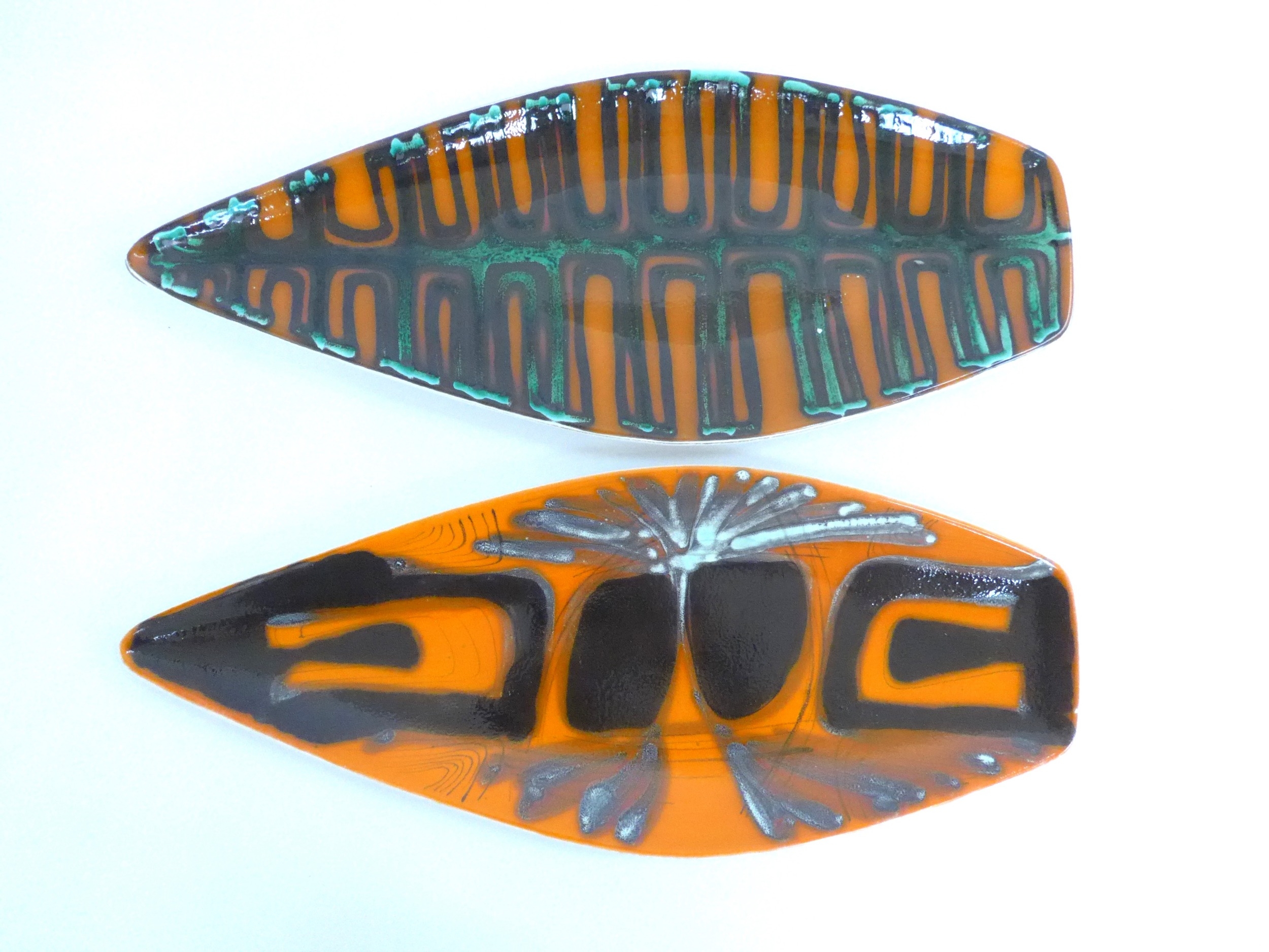 Two Poole Pottery Delphis range spear form dishes, shape 82, orange, green and colours. Black backstamps. 43cm long