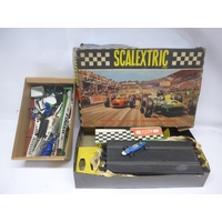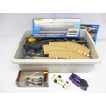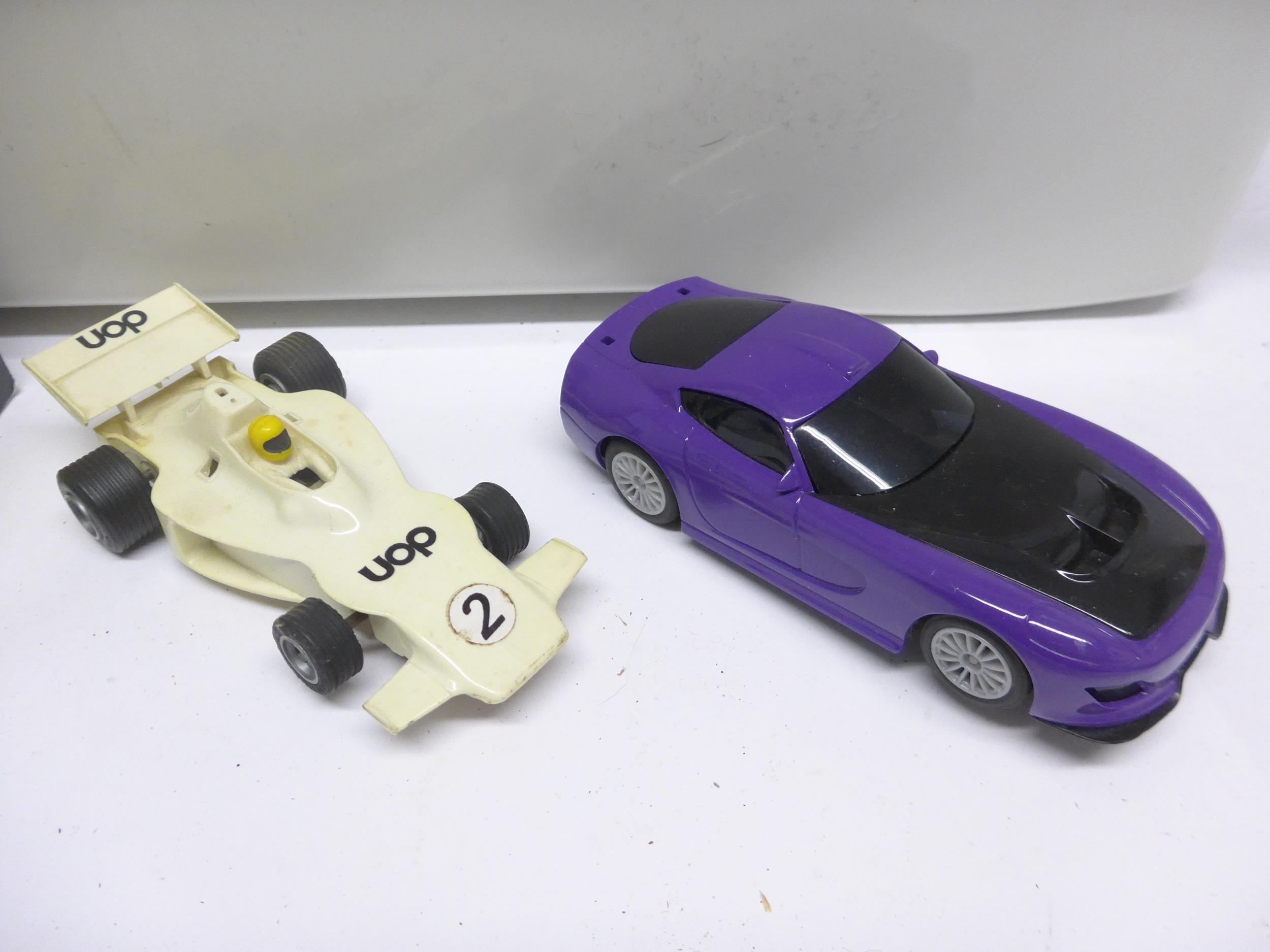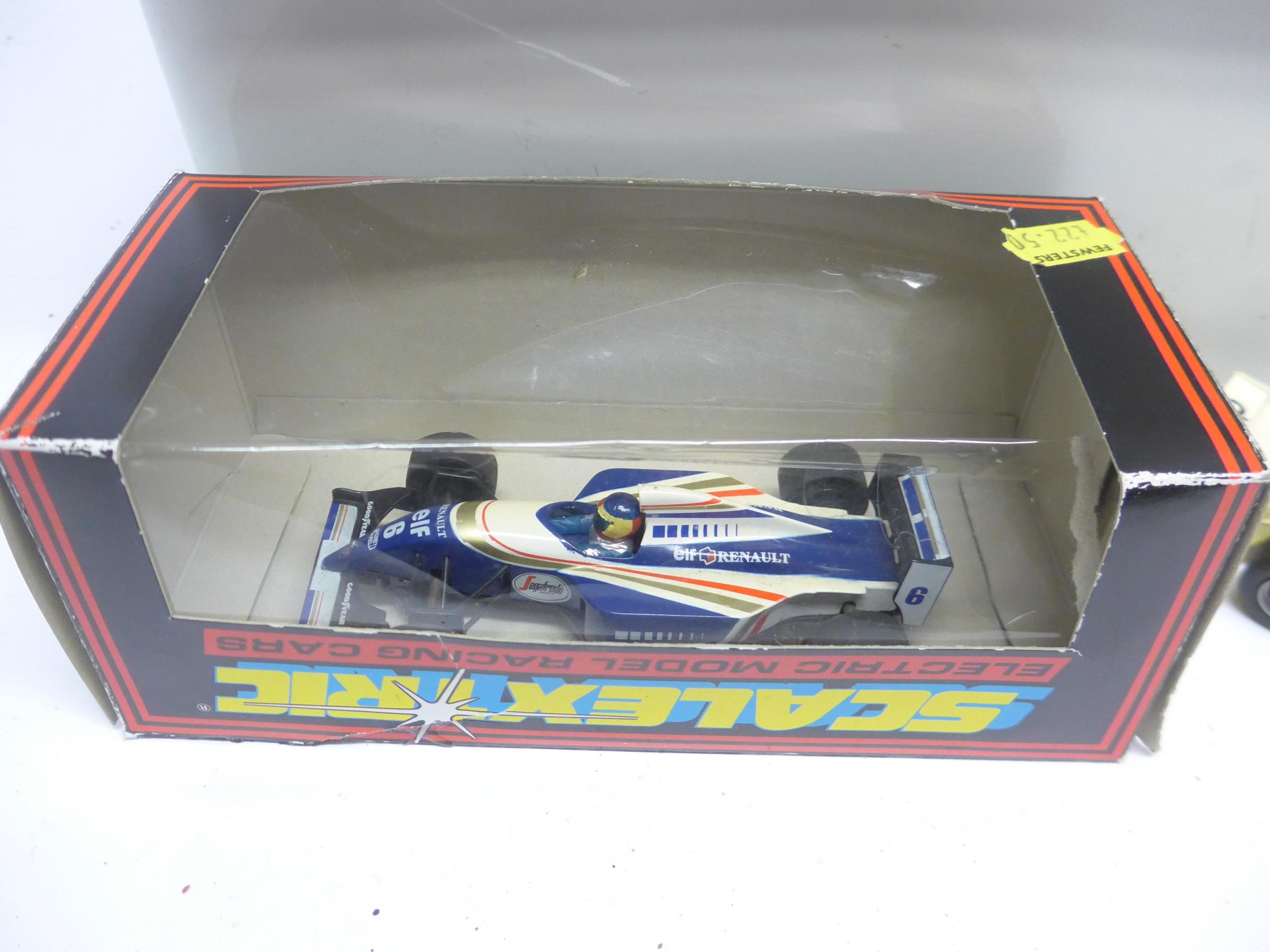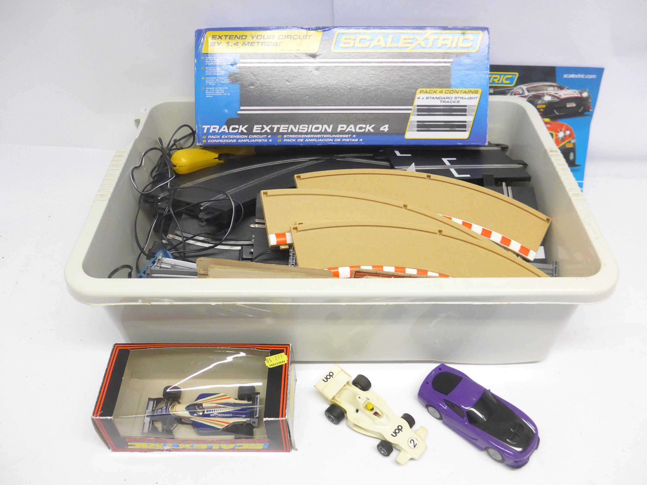 Three Scalextric slot racing cars to include C584 Williams Renault (loose in box) and unboxed Team Pro GT and UOP Shadow. Together with a boxed extension pack, loose track, etc.