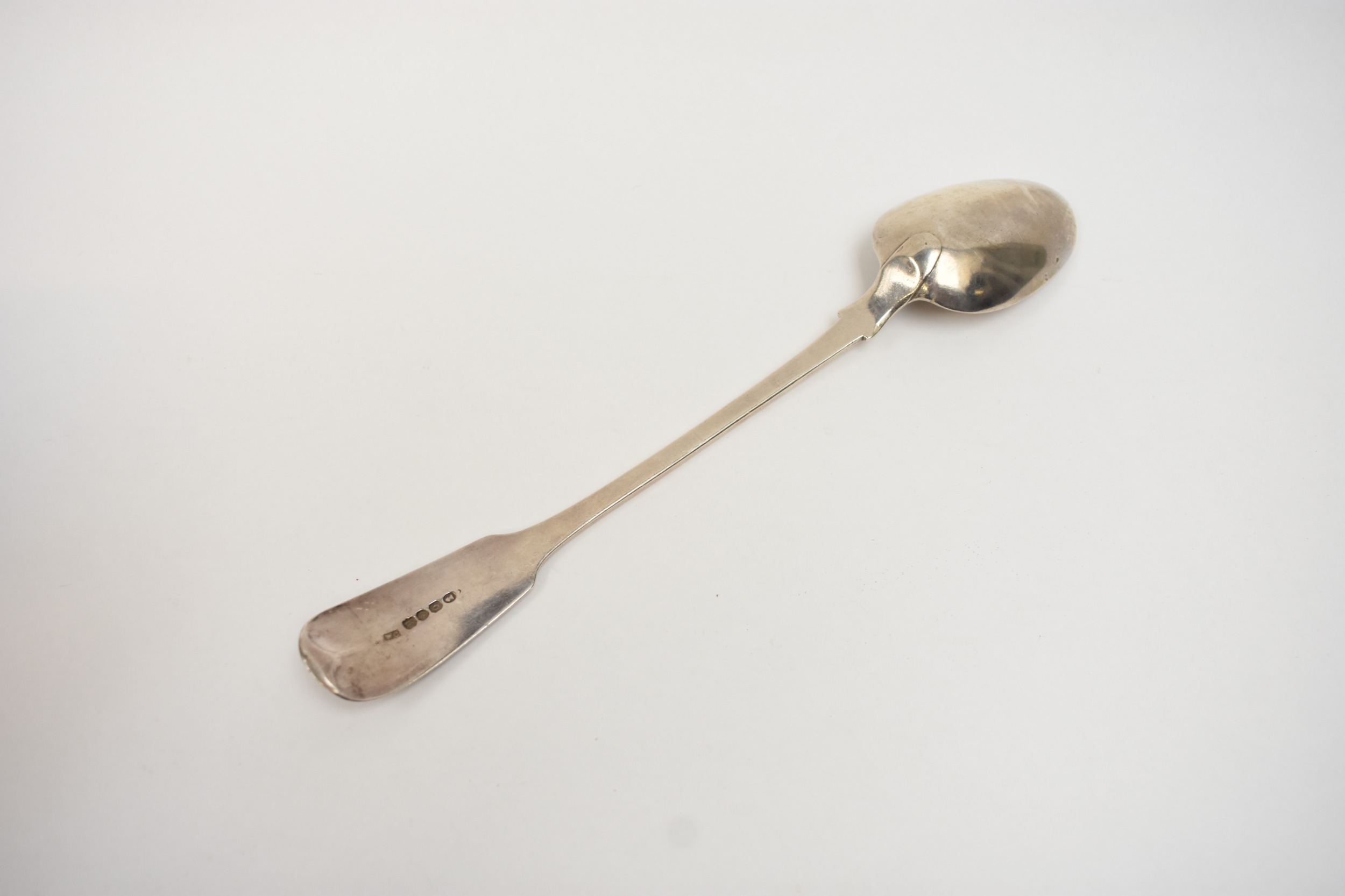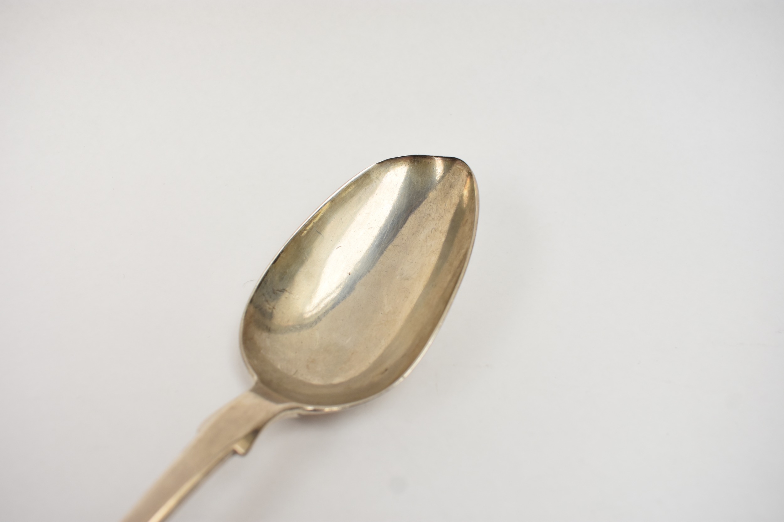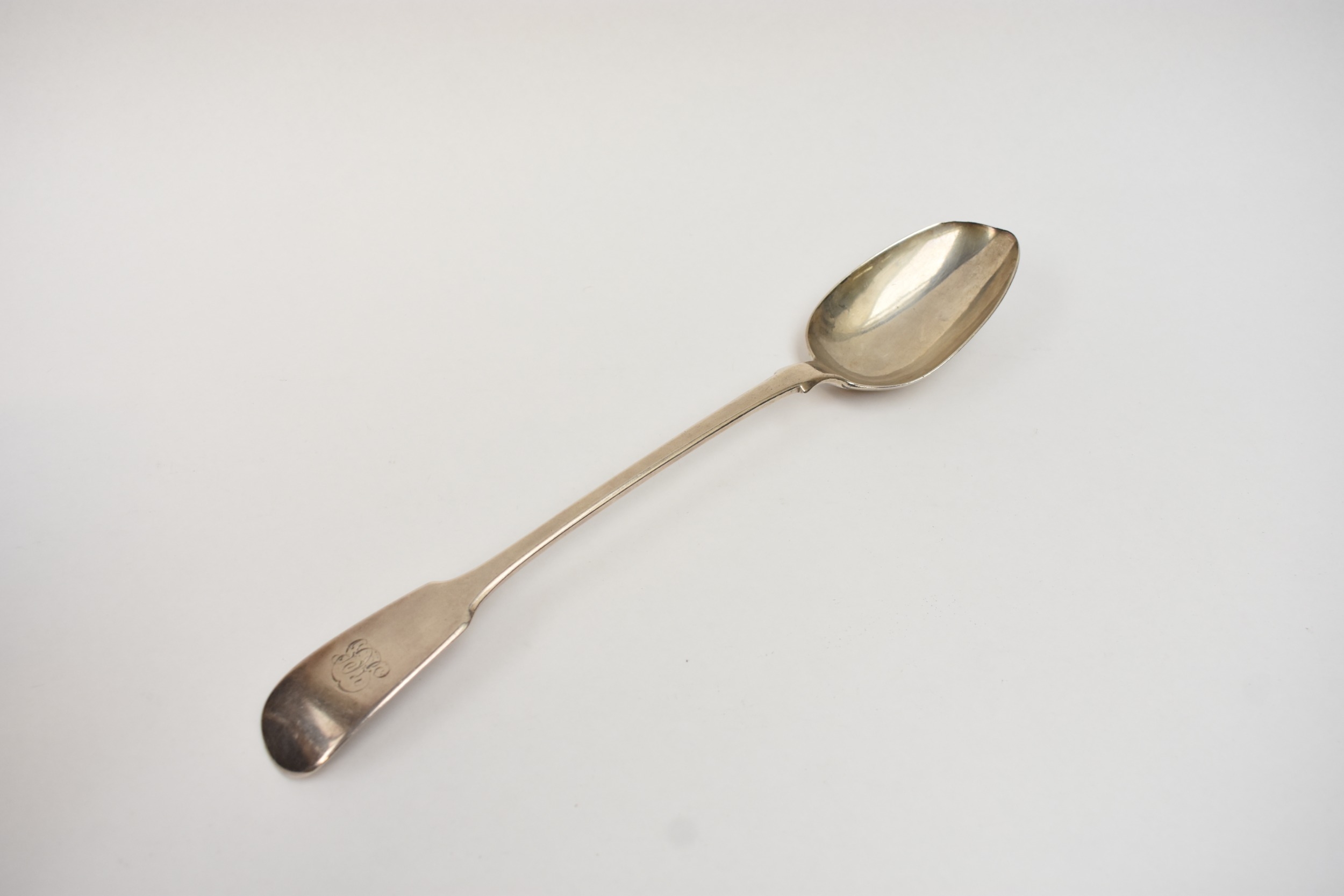 A silver basting spoon with worn bowl, monogram to handle, maker WC, London 1829, 30.3cm long. 130g