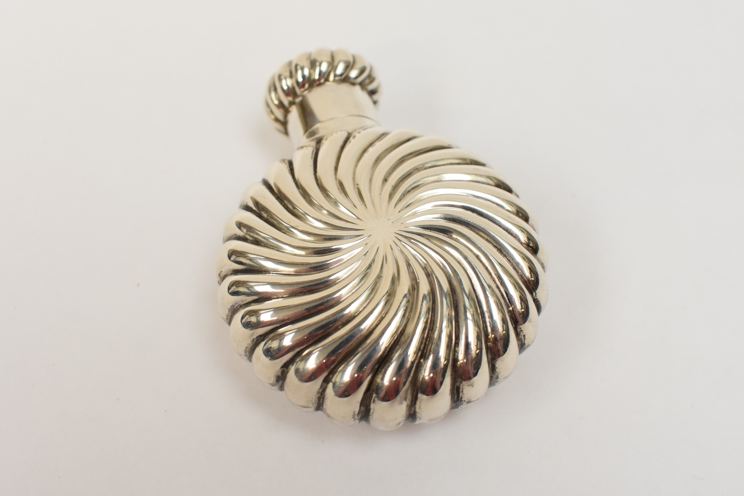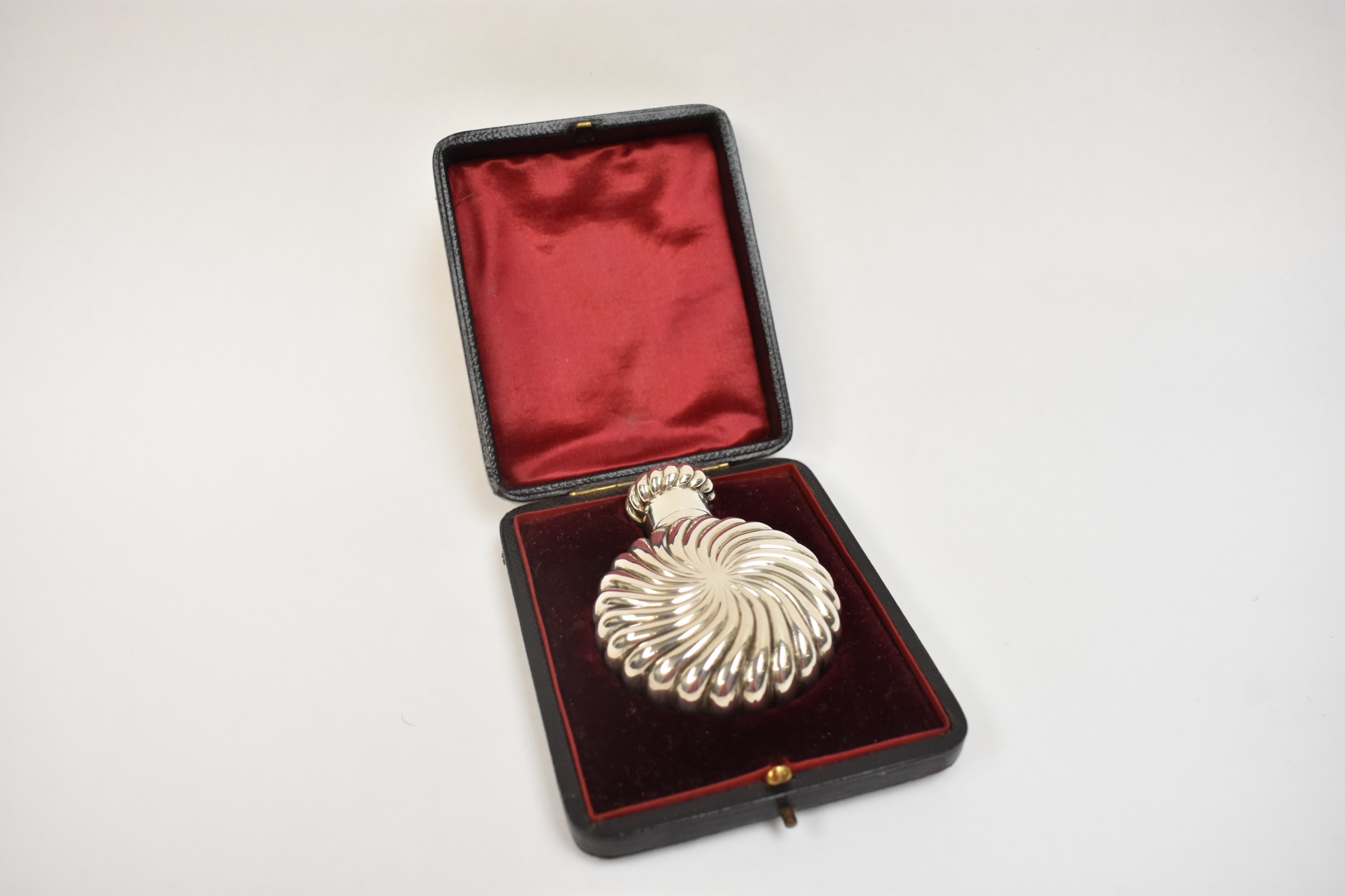 A Victorian Marples & Co silver scent bottle of wrythen circular form in fitted case, London 1894, 6.5cm long. 37g