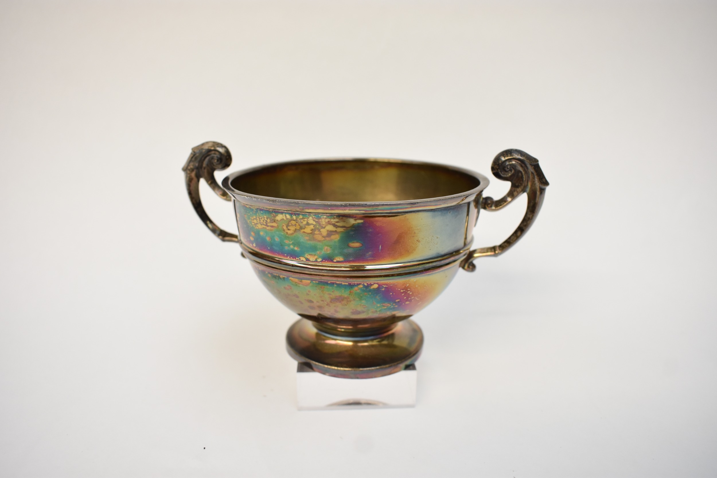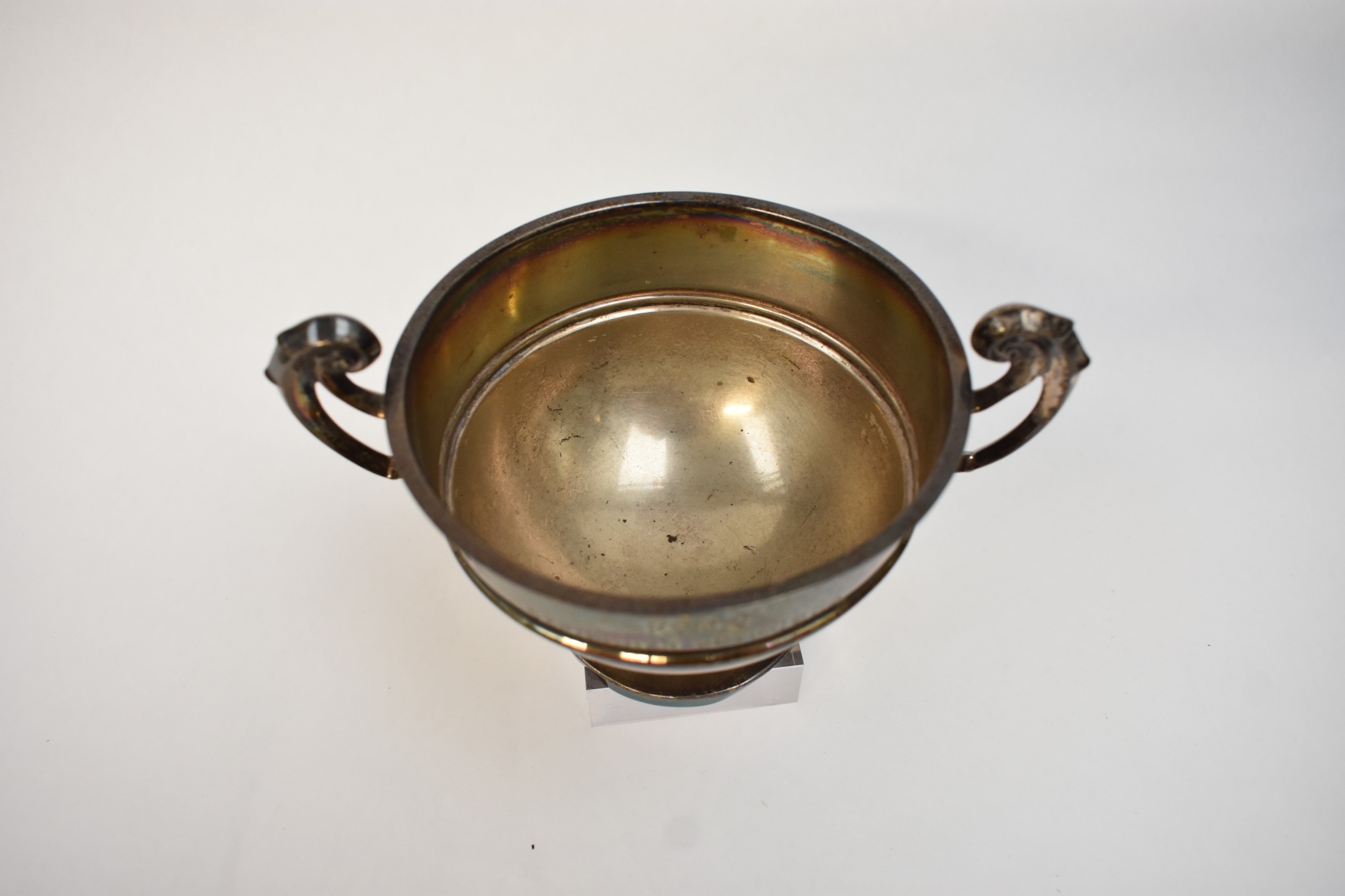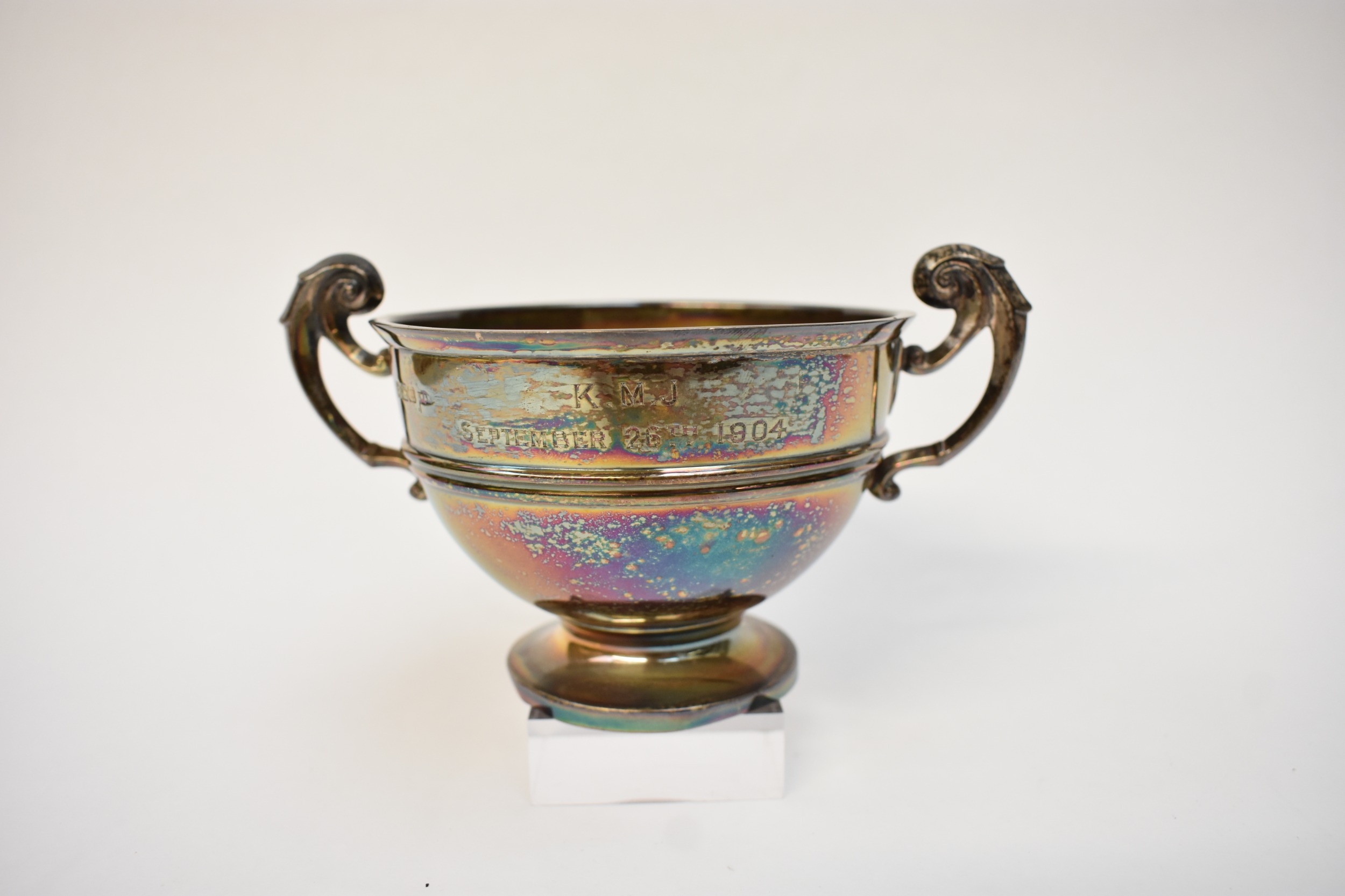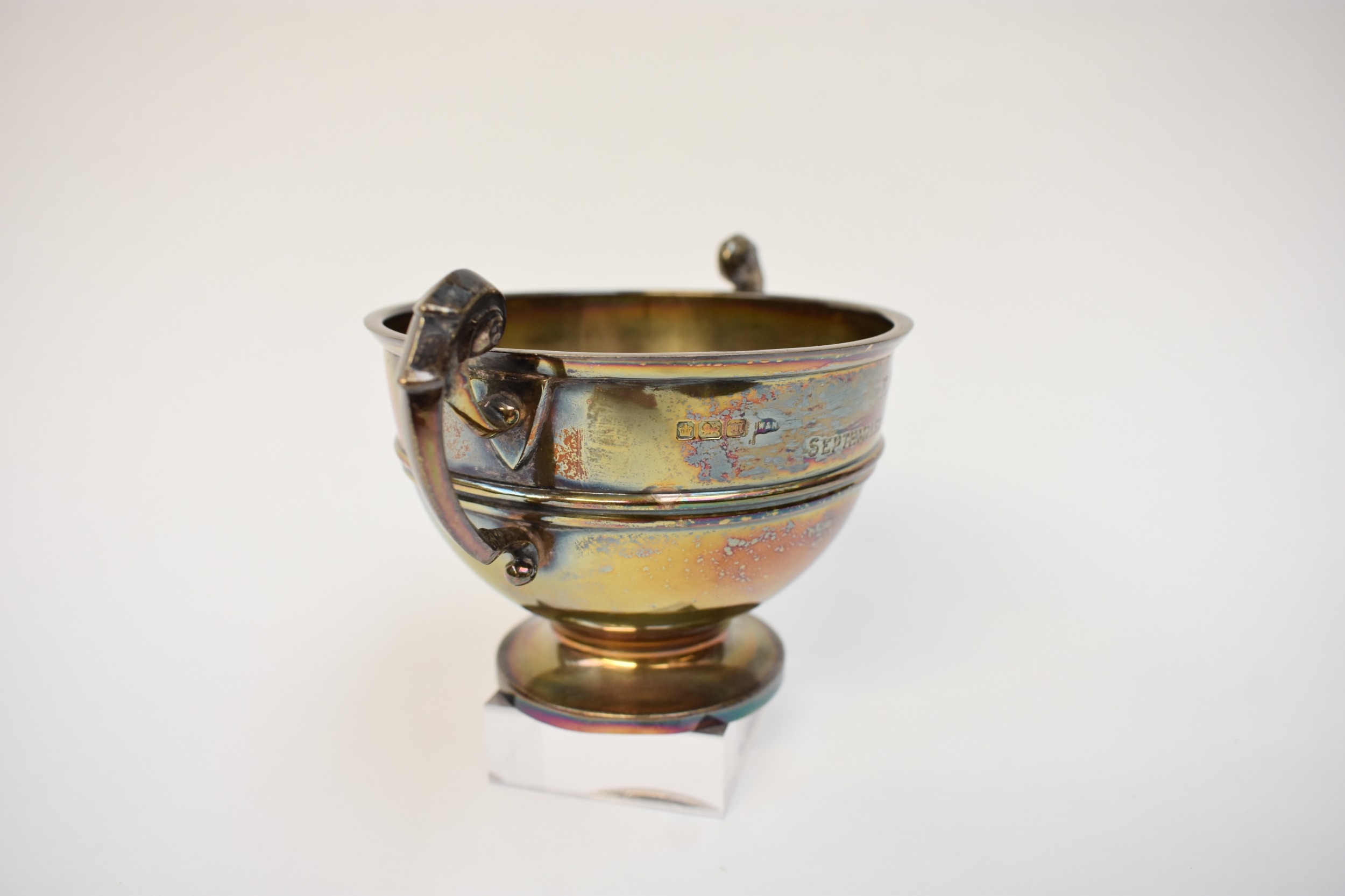 A Walker & Hall twin handled trophy bowl engraved K M J September 26th 1904, Sheffield 1904, 9cm tall x 10.5cm diameter, 204g