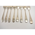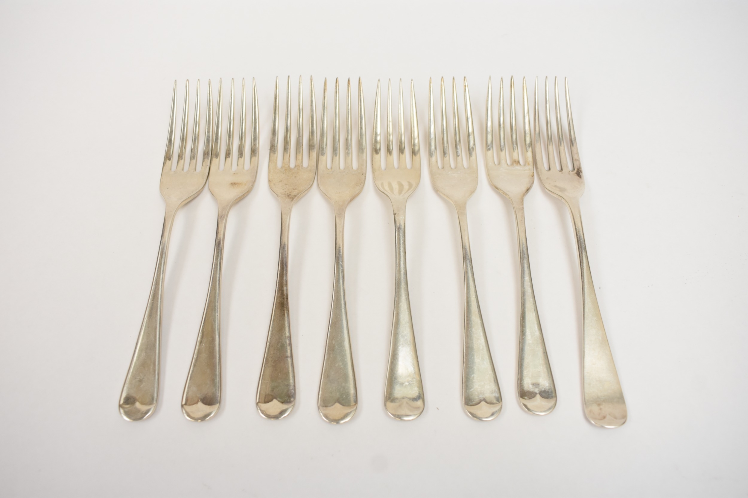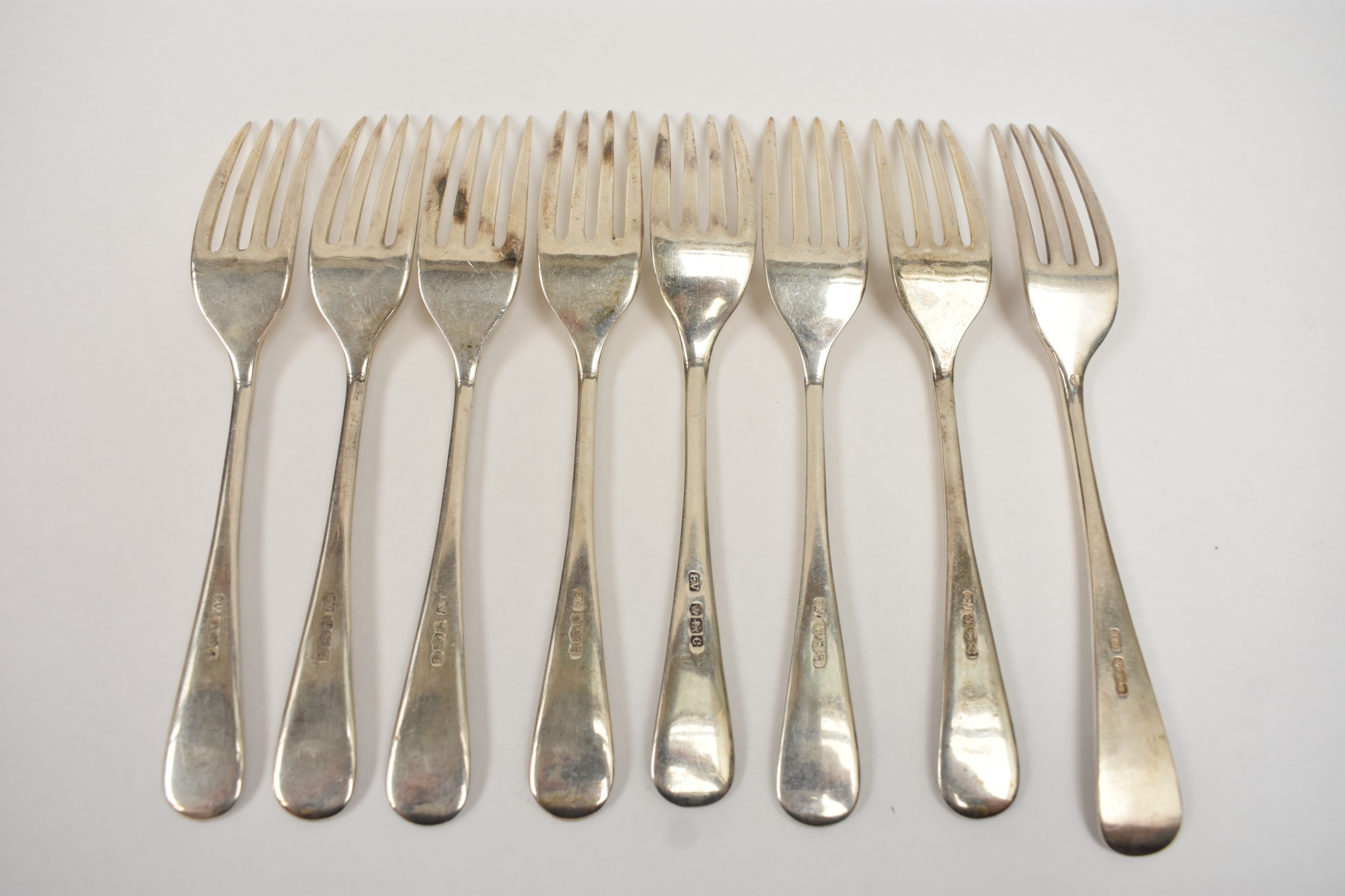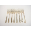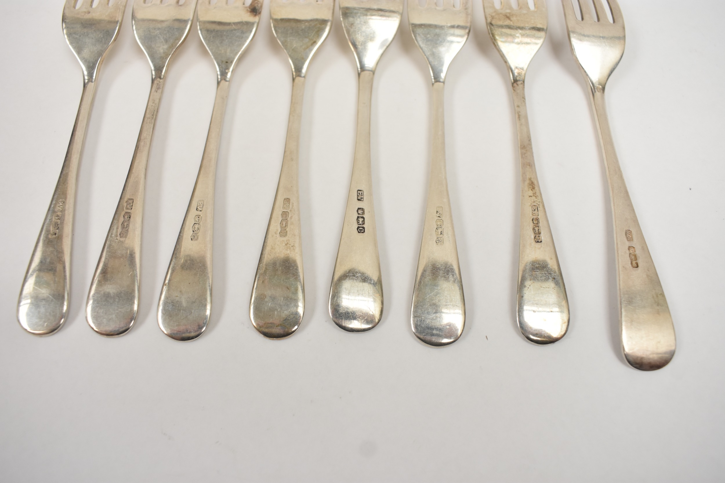 Eight silver "Old English" pattern small forks, seven by Emile Viner, Sheffield 1959, one 1945 and similar fork by Roberts & Belk 1934, 17.5cm long. 367g