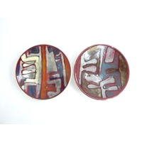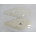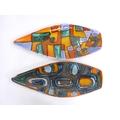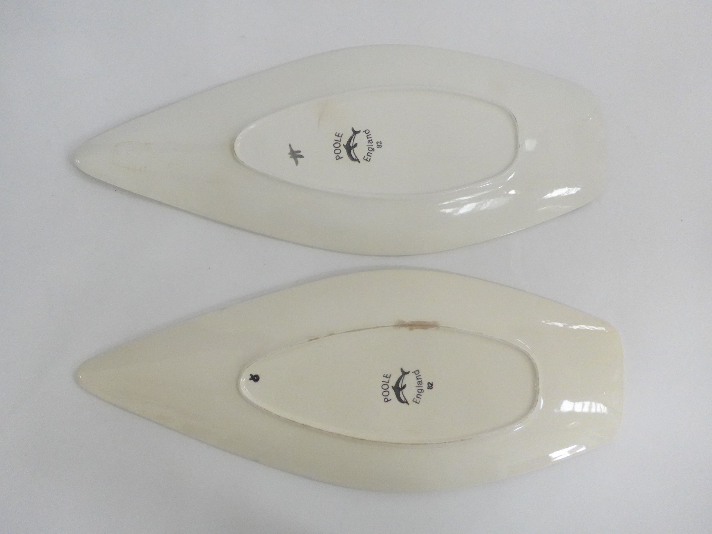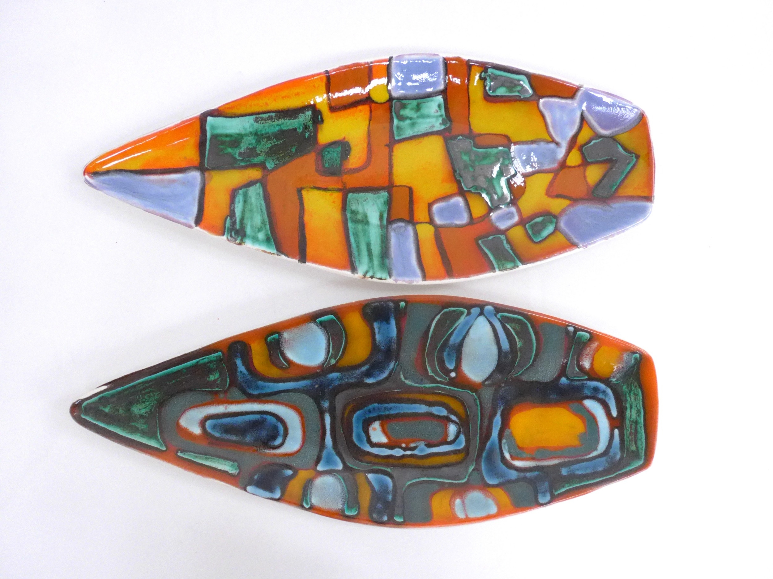 Two Poole Pottery Delphis range spear form dishes, shape 82, orange, blue, red and green colours. Black backstamps. 43cm long