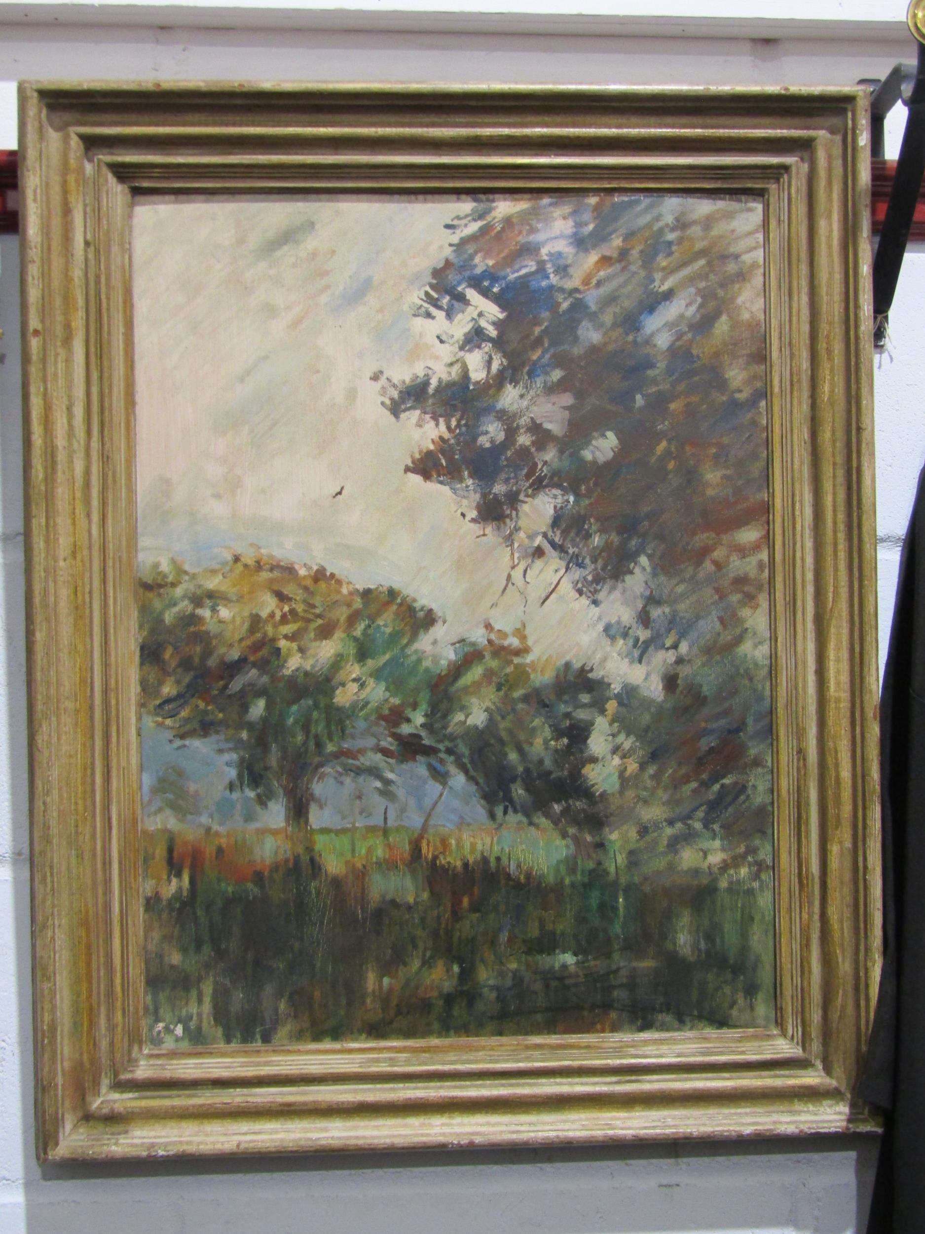 HAZEL LOVE (1923): An oil on board 'Suffolk Landscape', 59cm x 44.5cm image size, Royal Institute of Oil Painters label verso, framed