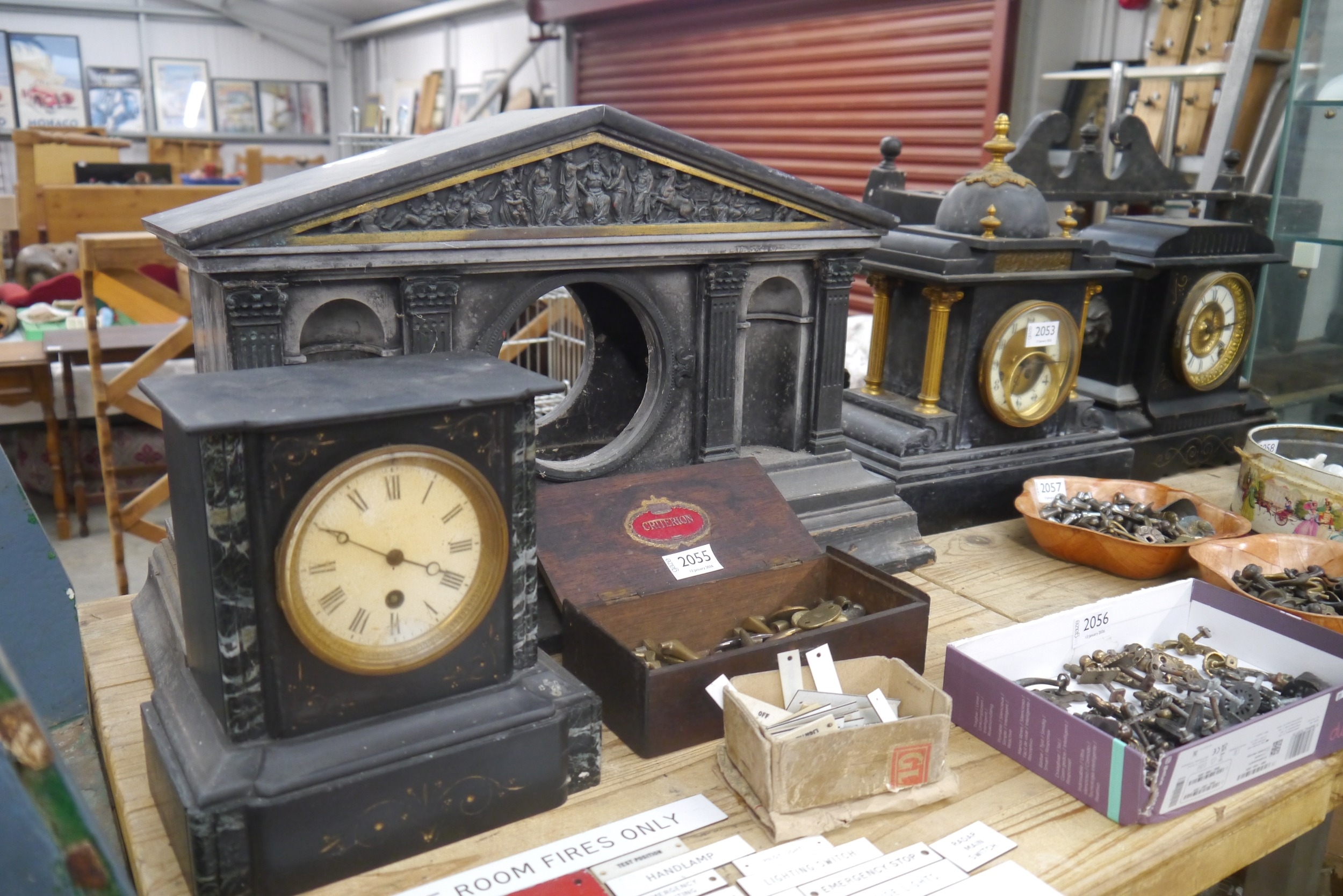 A group of slate mantel clocks for repairs/restoration including a large architectural example with theological panel to top