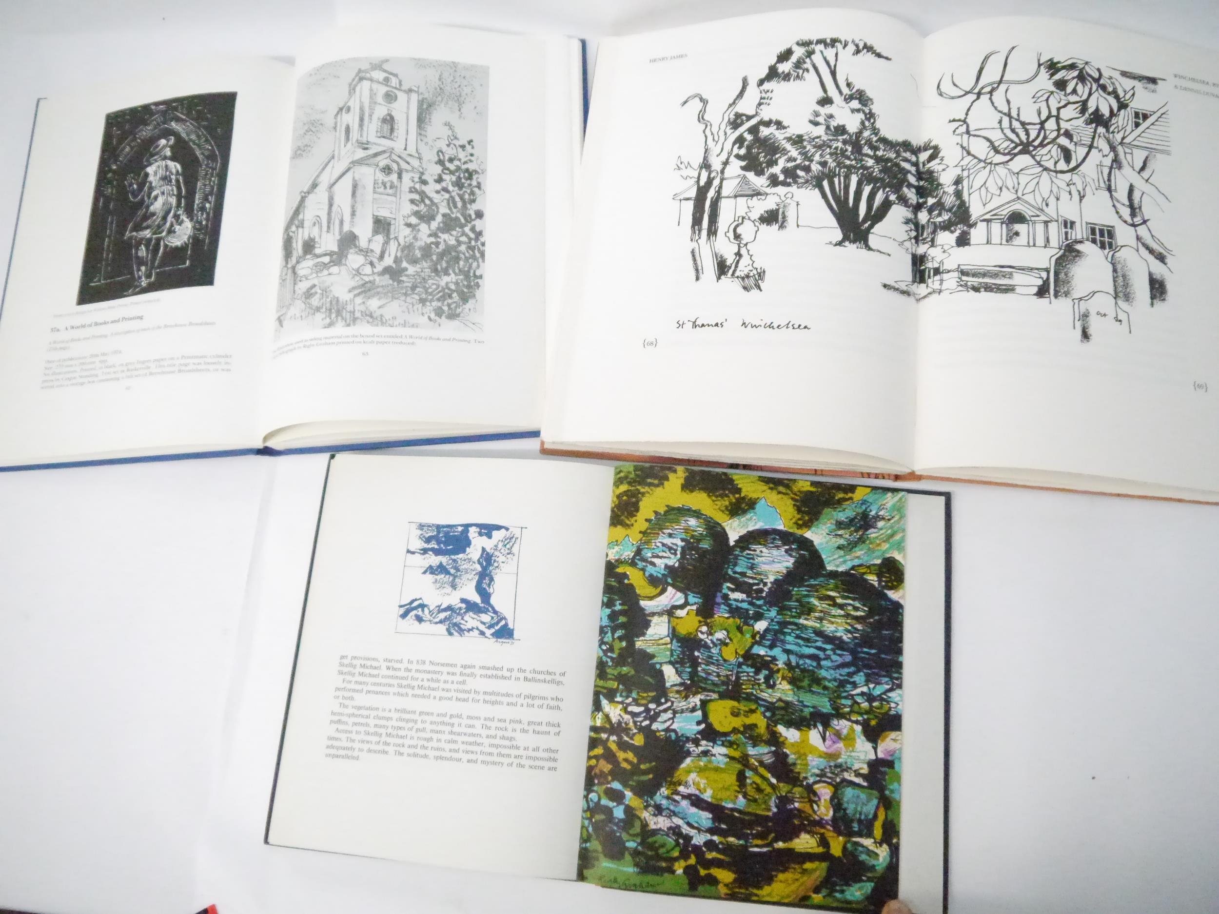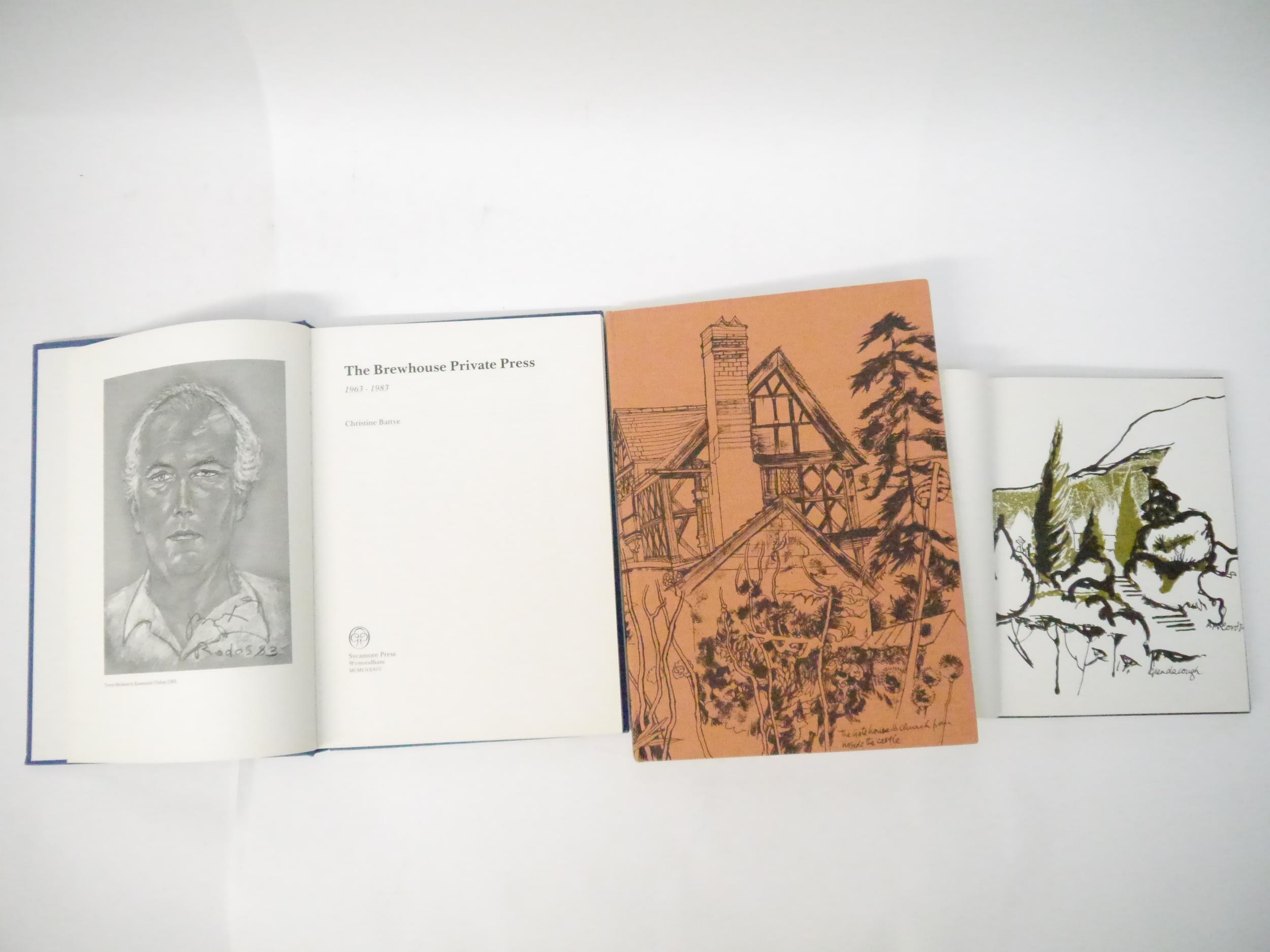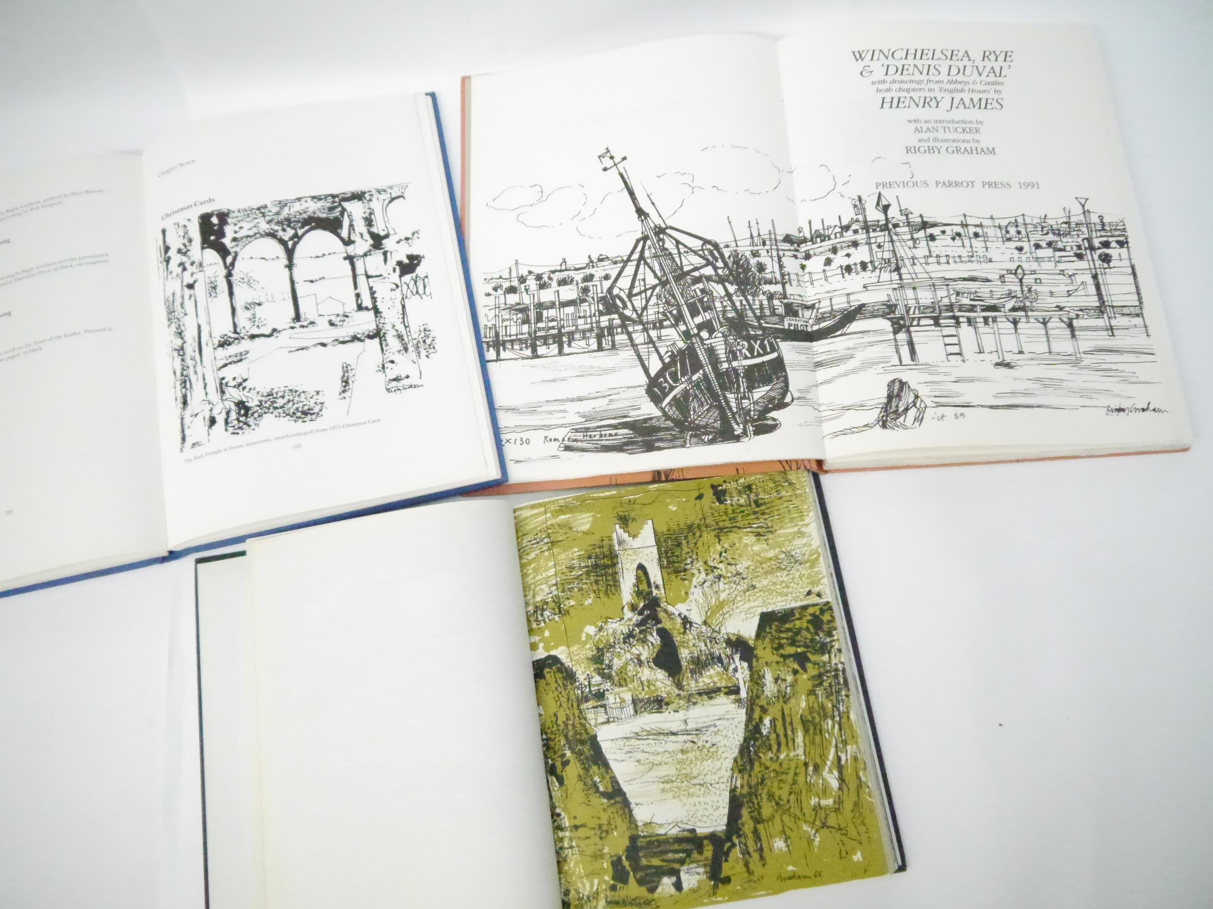 Rigby Graham (illustrated); Alan Tucker (intro.): 'Winchelsea, Rye & 'Denis Duval', with drawings from Abbeys & Castles both chapters in 'English Hours' by Henry James', Previous Parrot Press, 1991, limited edition, Number 92 of an edition 192 copies, signed on the colophon by Alan Tucker and Rigby Graham, further signed & inscribed by Alan Tucker to Ian Rogerson, 82pp, [6], numerous double page black & white illustrations by Rigby Graham, double page illustrated end papers/pastedowns, large 4to (33 x 23.5cm), original pictorial paper covered boards by Rigby Graham; Margaret McCord and Rigby Graham: 'Abbeys & Churches', Belfast, the Crannog Press, 1971, limited edition, number 28 of 100 copies only, approximately 155pp with colour and black and white illustrations by Rigby Graham to almost every page, 4to (25 x 20cm), original cloth gilt; together with Christine Battye: 'The Brewhouse Private Press 1963-1983', Wymondham, Sycamore Press, 1984, 1st edition, limited edition, number 16 of 120 copies, 180pp, ills. throughout, folio, original cloth gilt (3)