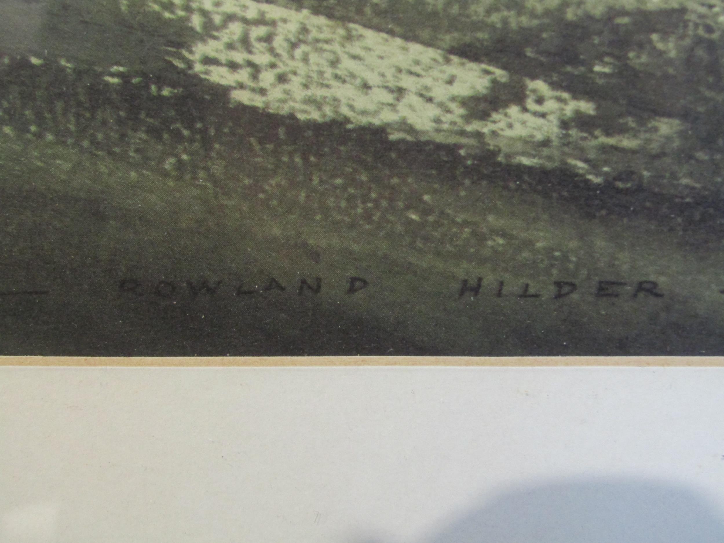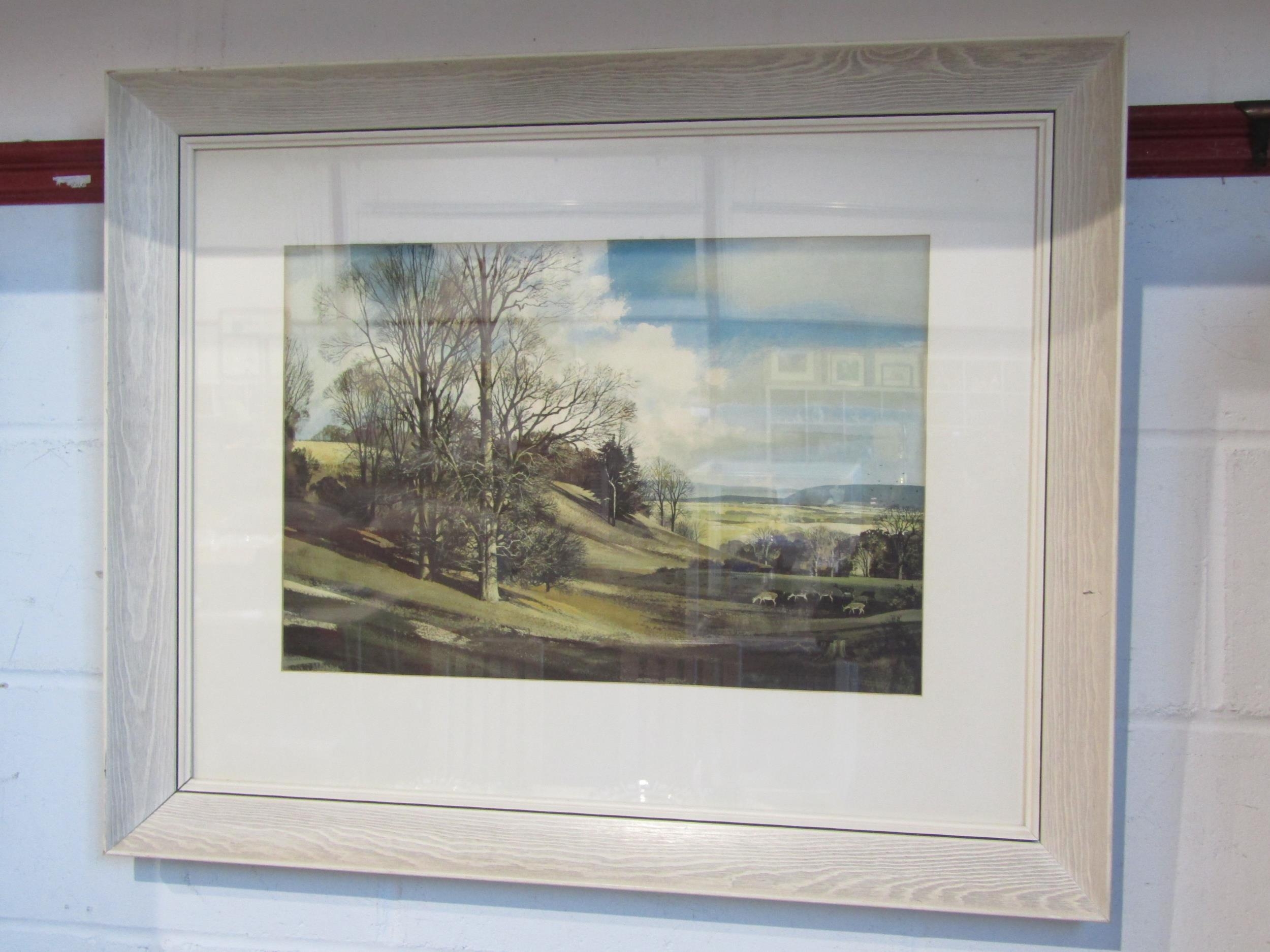 After Rowland Hilder (1903-1995) a framed and glazed print, landscape with deer. Signed in the print only. Image size 37cm x 55cm
