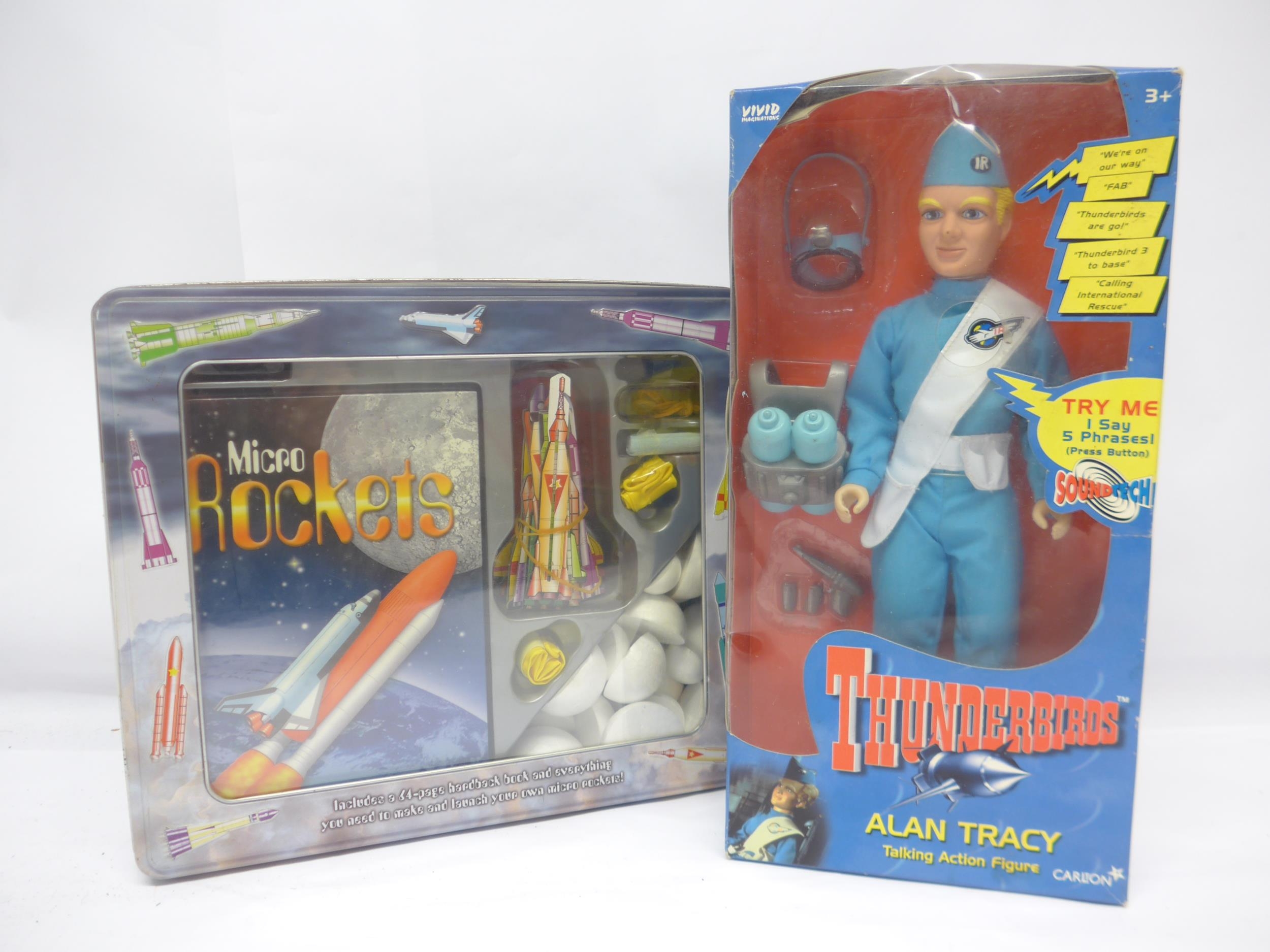 A boxed Vivid Imaginations Thunderbirds Alan Tracy talking action figure, together with a Micro Rockets playset (2)