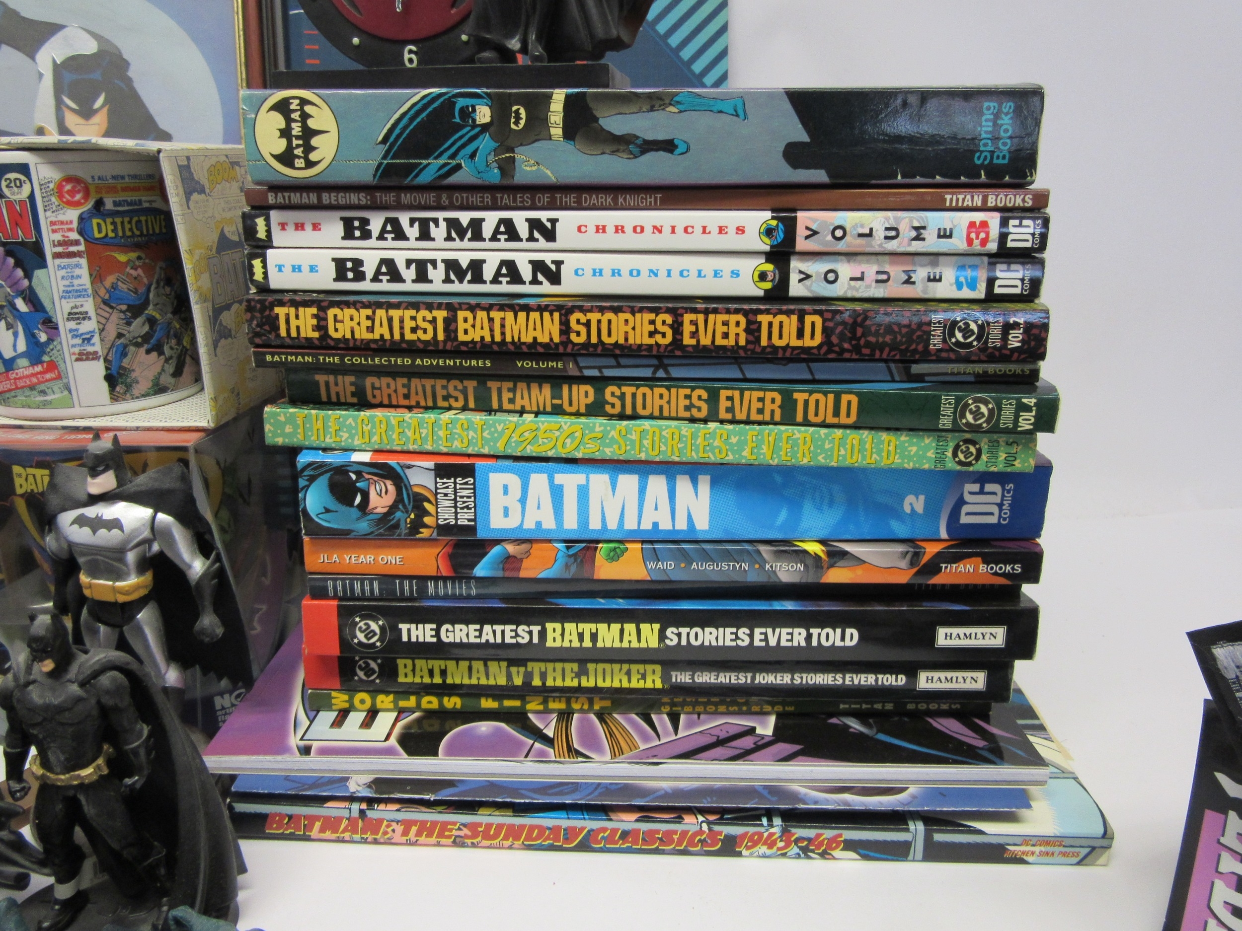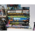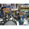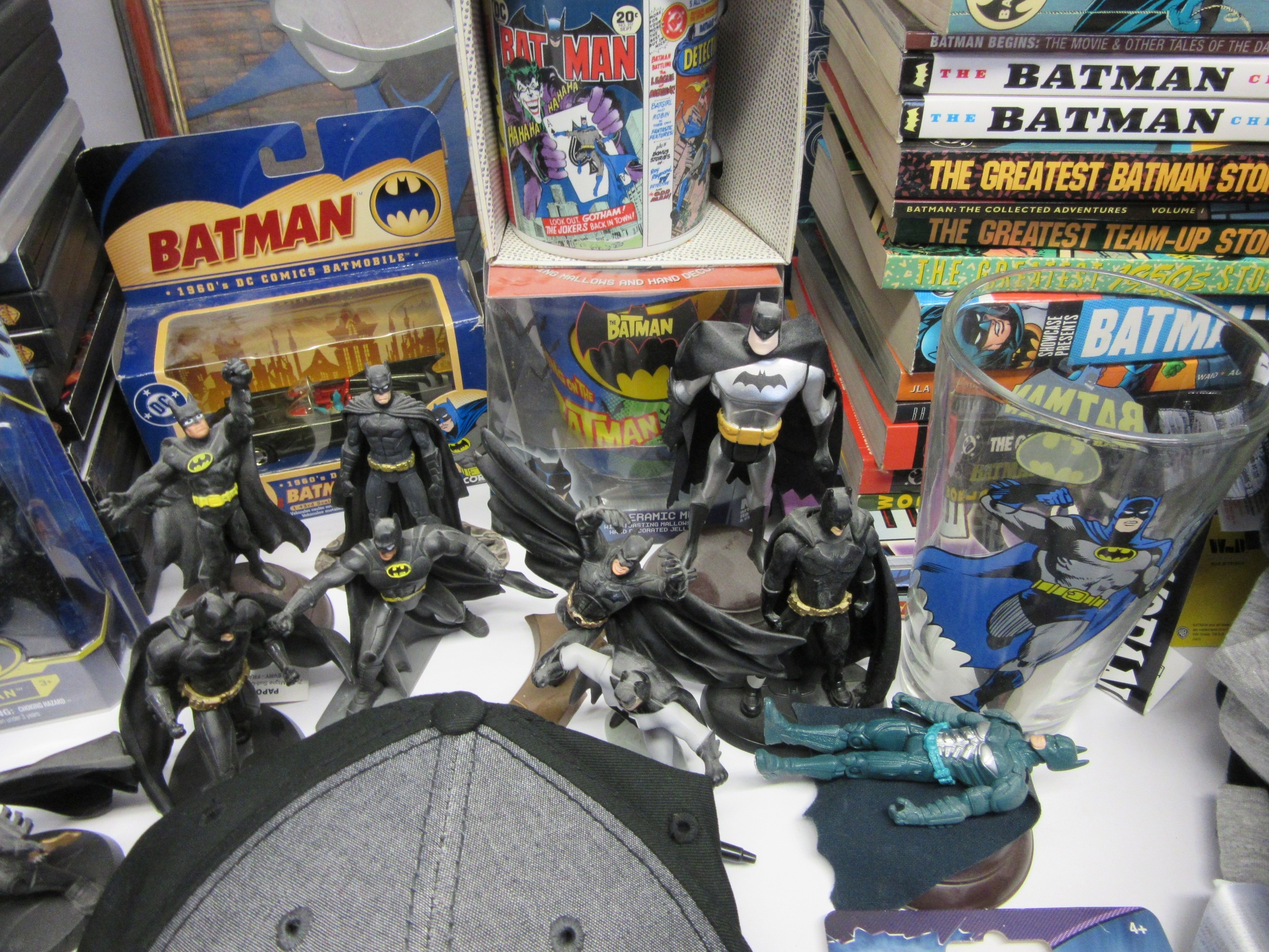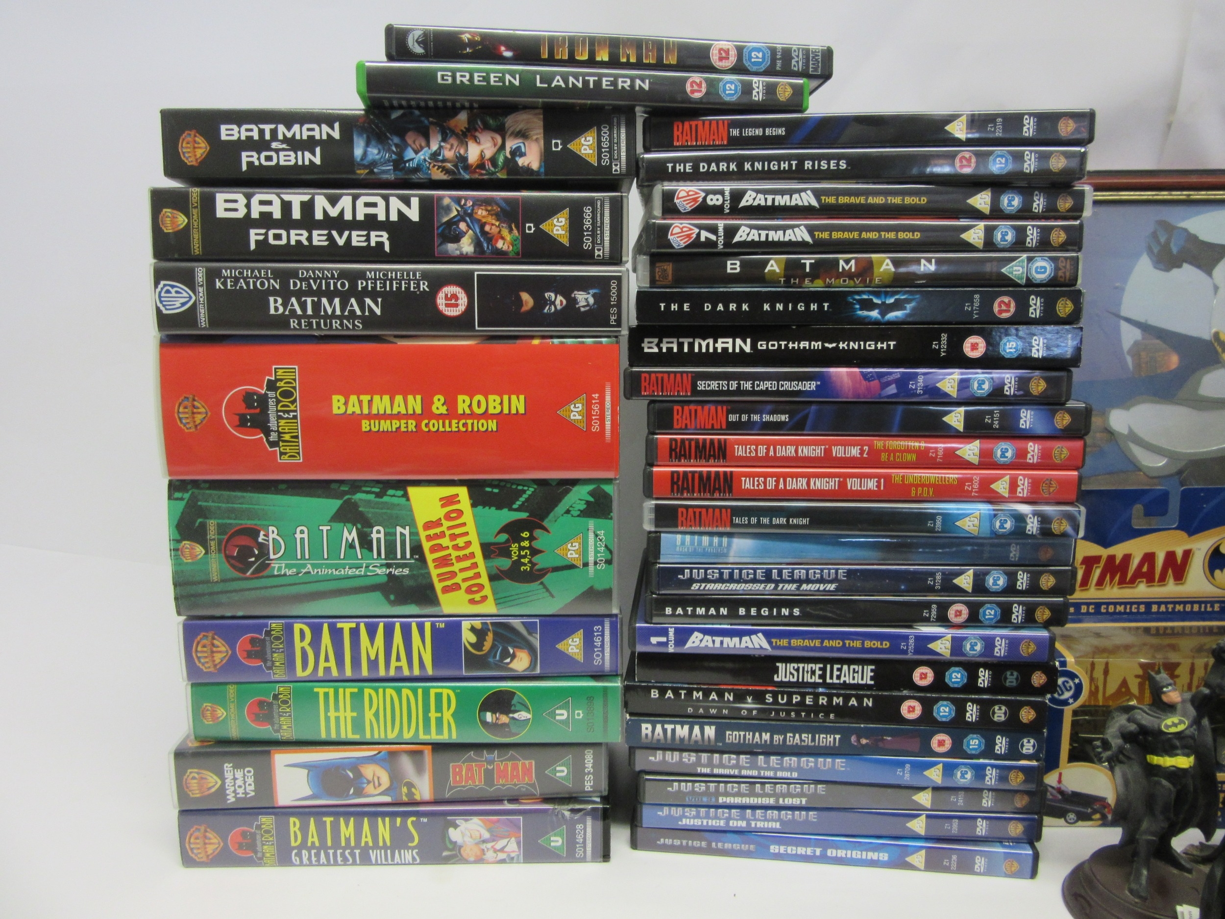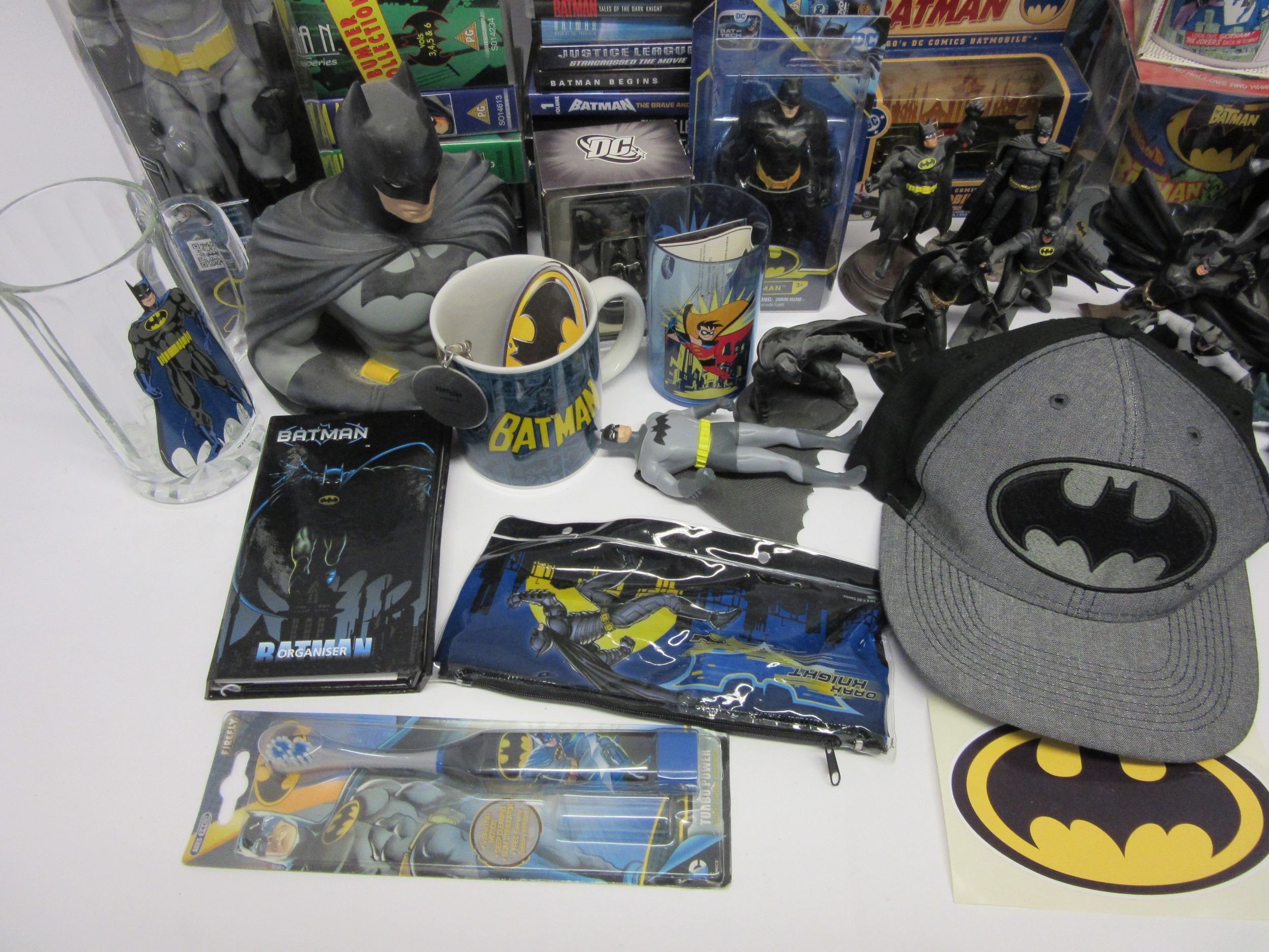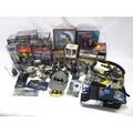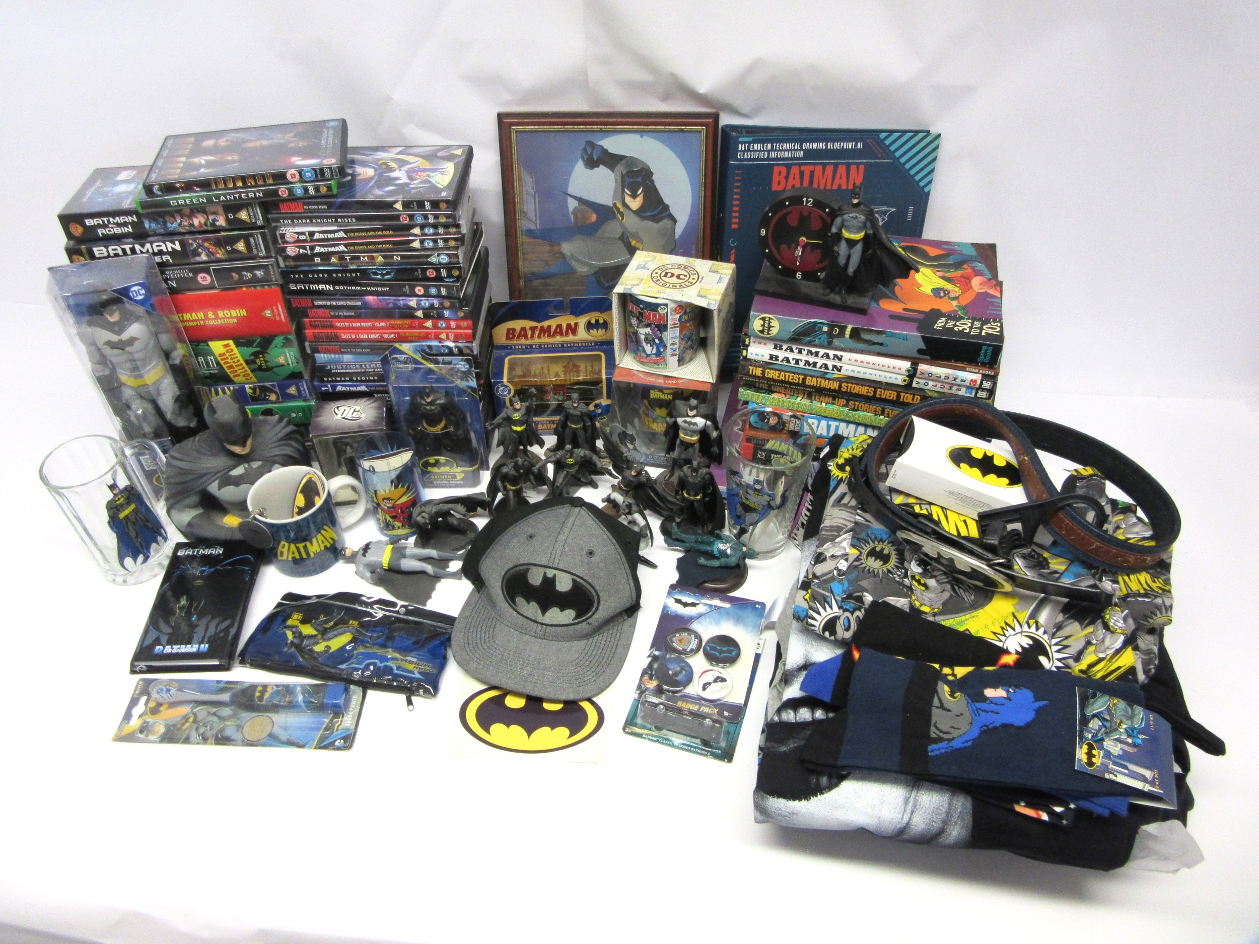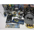 A collection of Batman memorabilia to include figures, clothing, DVDs and videos, Corgi Batmobile, etc.