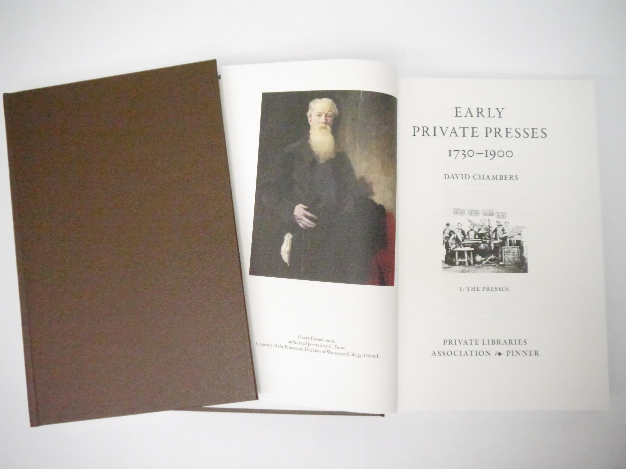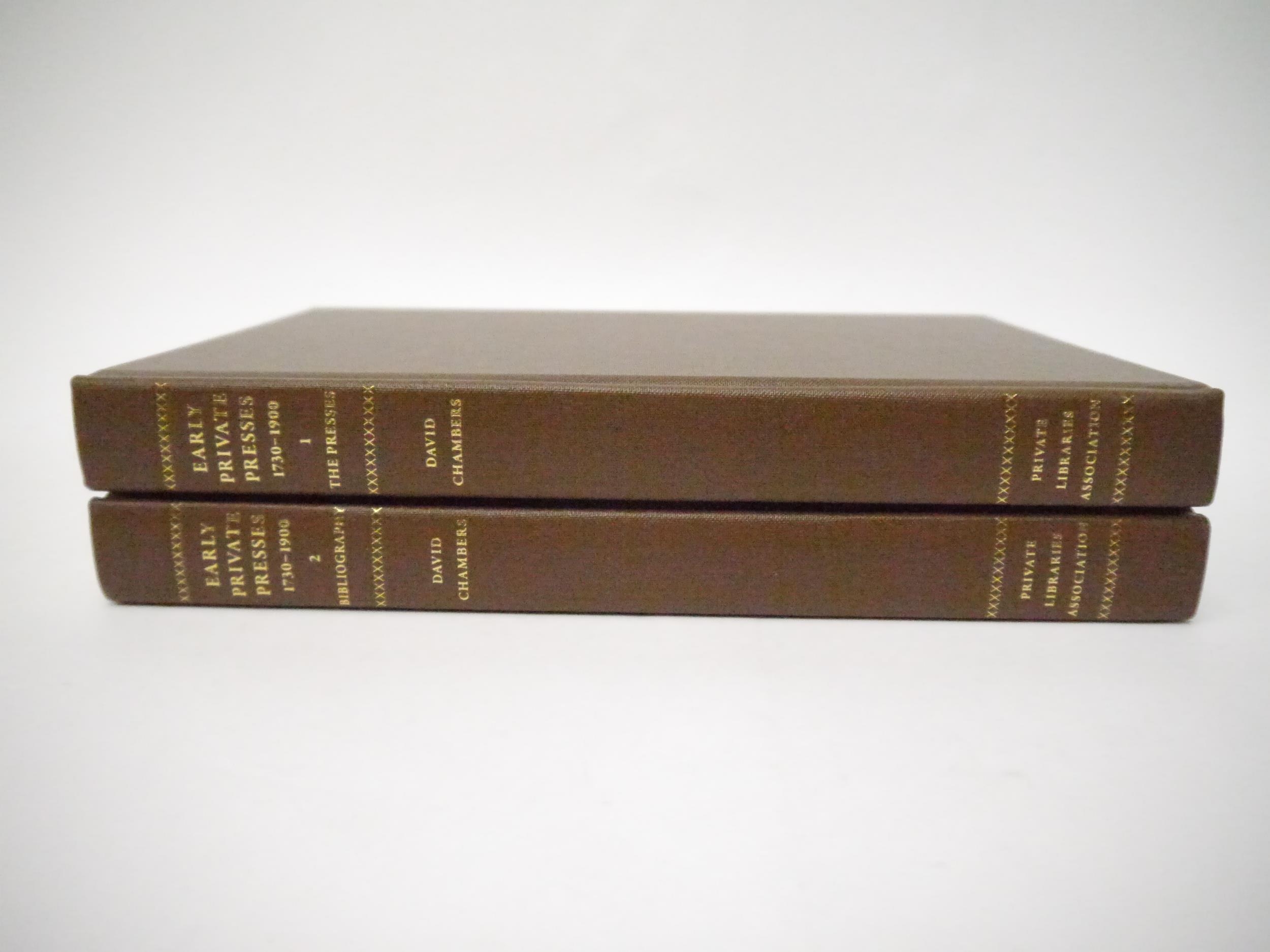 ‘EARLY PRIVATE PRESSES 1730-1900’, by David Chambers, published in 2025 by The Private Libraries Association. Vol 1: The Presses, 308pp, 130+ illus. Vol 2: Bibliography, 295pp. Hardbacks. Cloth covered boards. A two-volume account of the early private presses active in the British Isles in the 18th and 19th centuries. The publication also includes details of presses worked from domestic premises, where the press was worked at home, or in some cases within a school. It does not include commercial enterprises. There are over 130 reproductions along with a bibliography of around 1,750 books and 850 pieces of ephemera printed at the presses. In fine condition as new. (2)