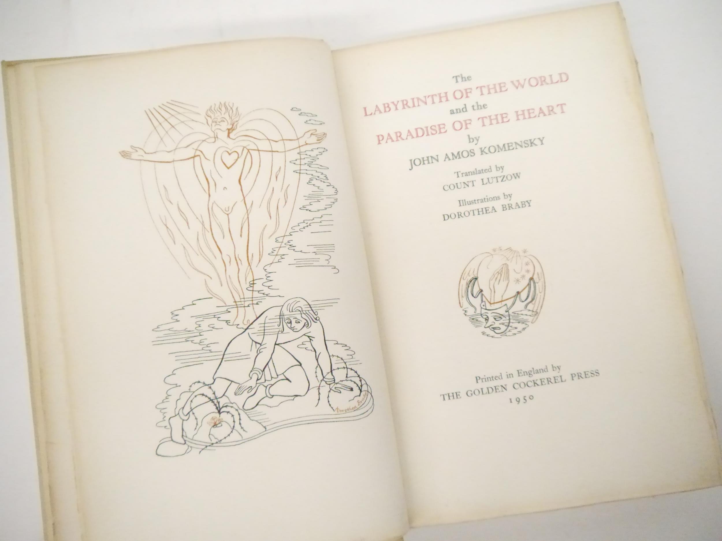 (Golden Cockerel Press.) John Amos Komensky; Dorothea Braby (illustrated): 'The Labyrinth of the World and the Paradise of the Heart', Golden Cockerel Press, 1950, limited edition, number 288 of 300 copies, frontis + numerous head and tailpiece illustrations by Dorothea Braby complete, 271pp, original pictorial polished buckram gilt, top edge gilt, others uncut