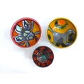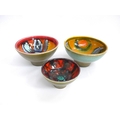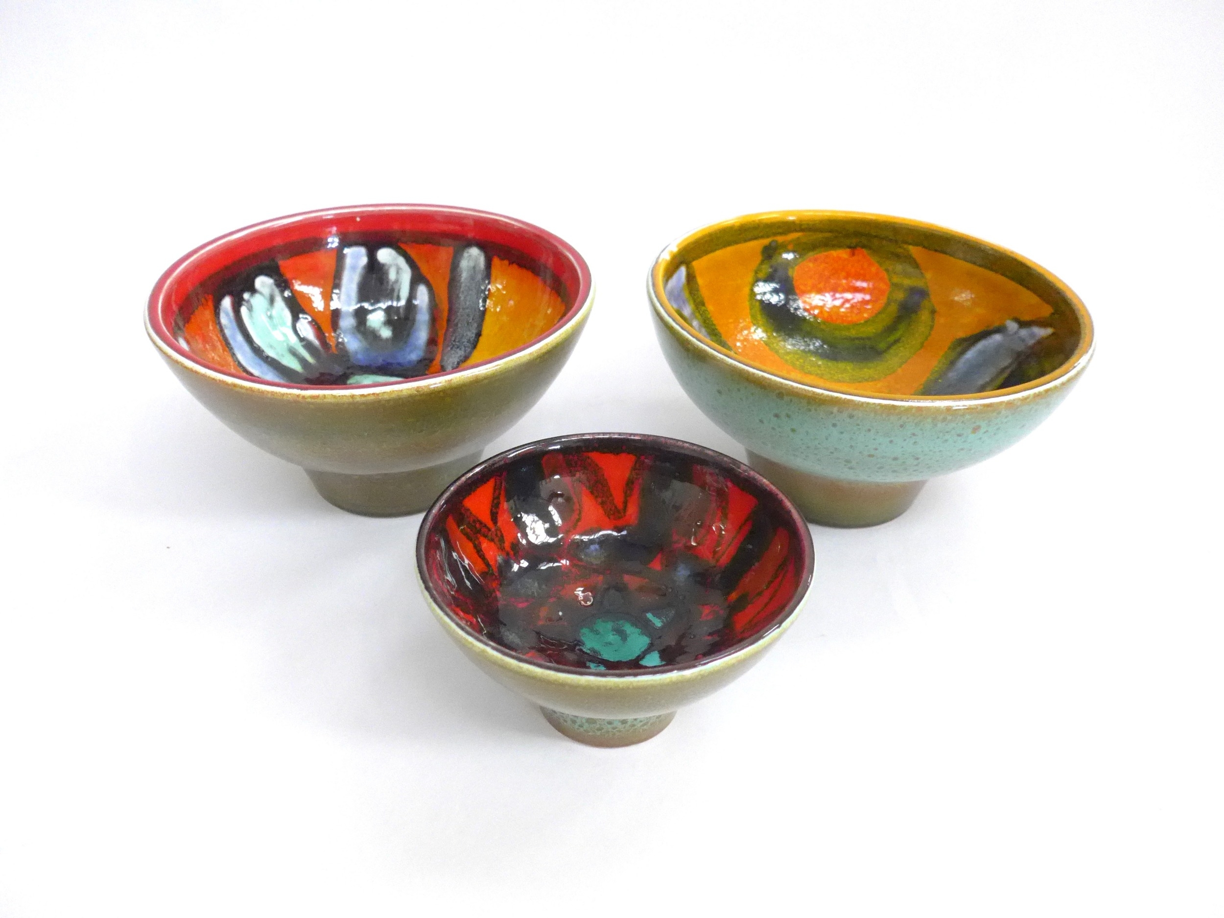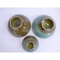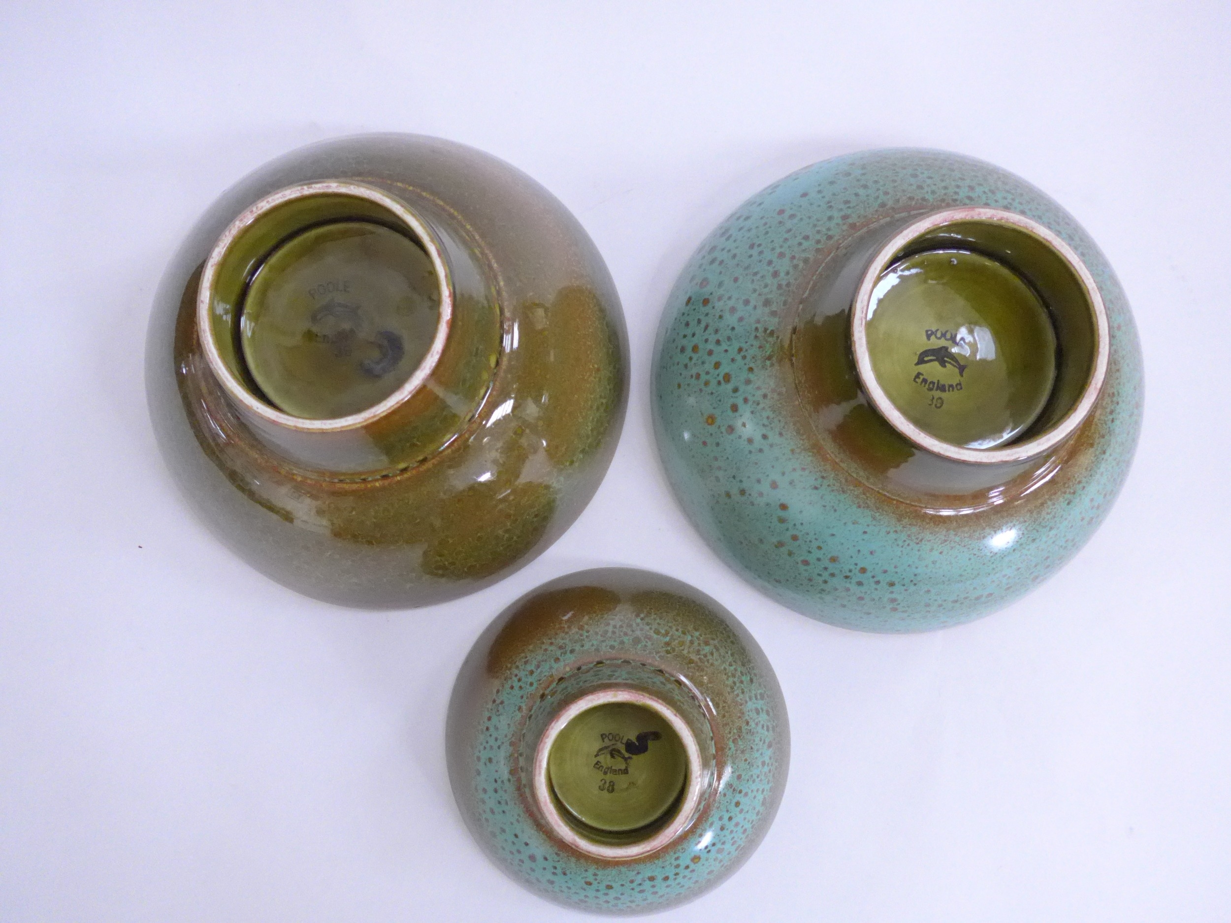 Three Poole Pottery Delphis range pedestal bowls, shapes 38/39. Black backstamps. Largest 9.5cm high x 18cm diameter