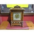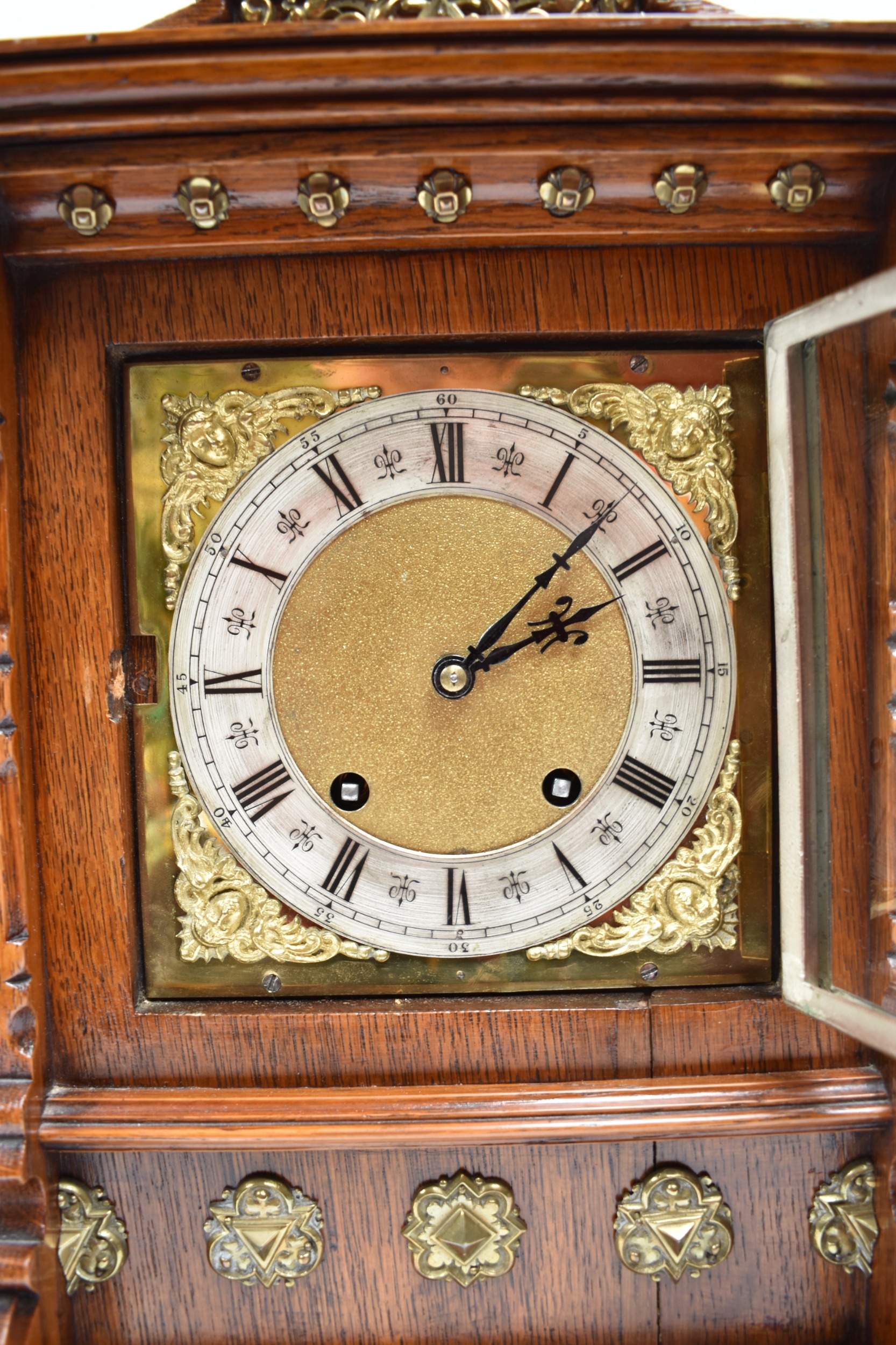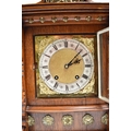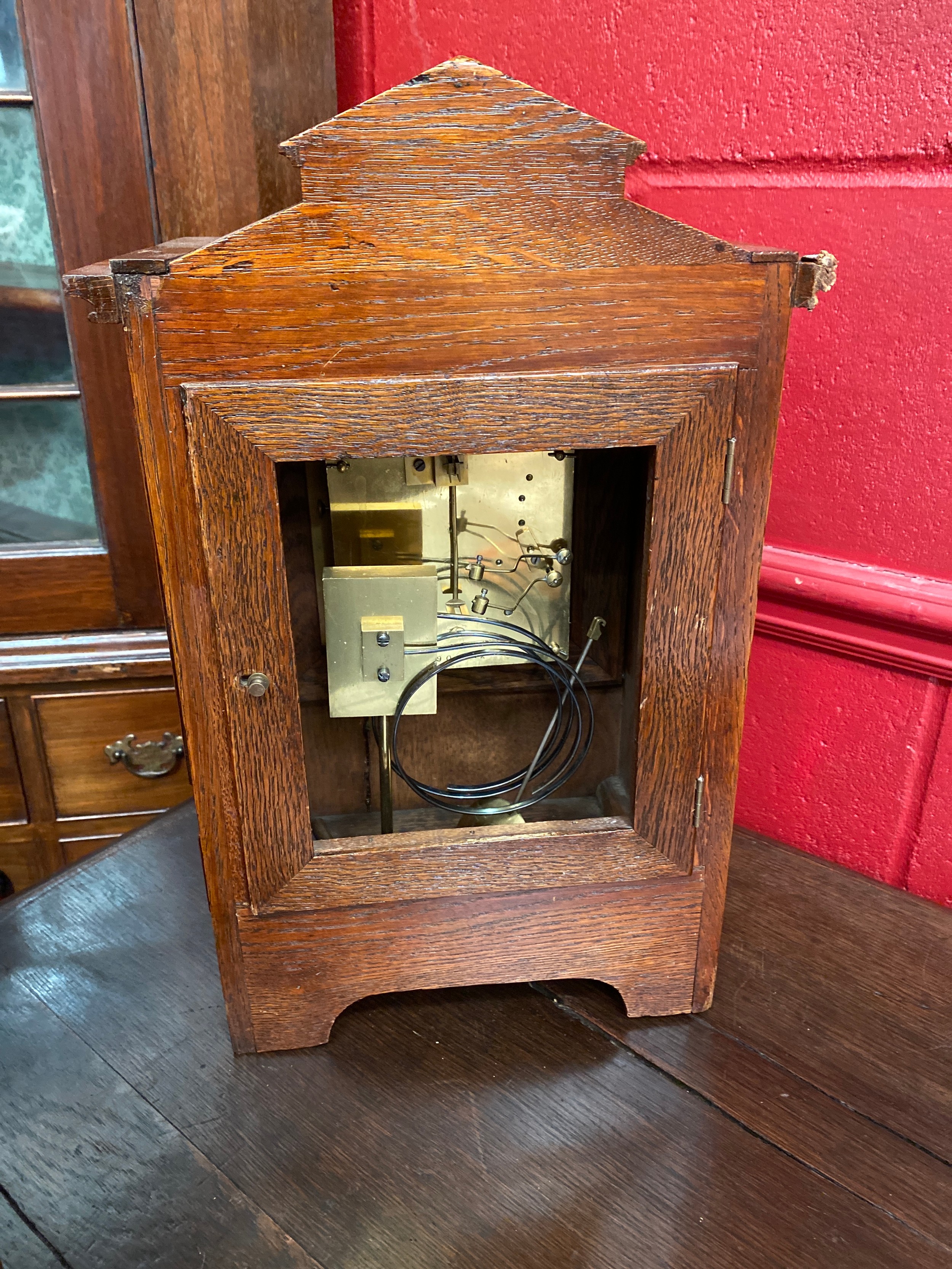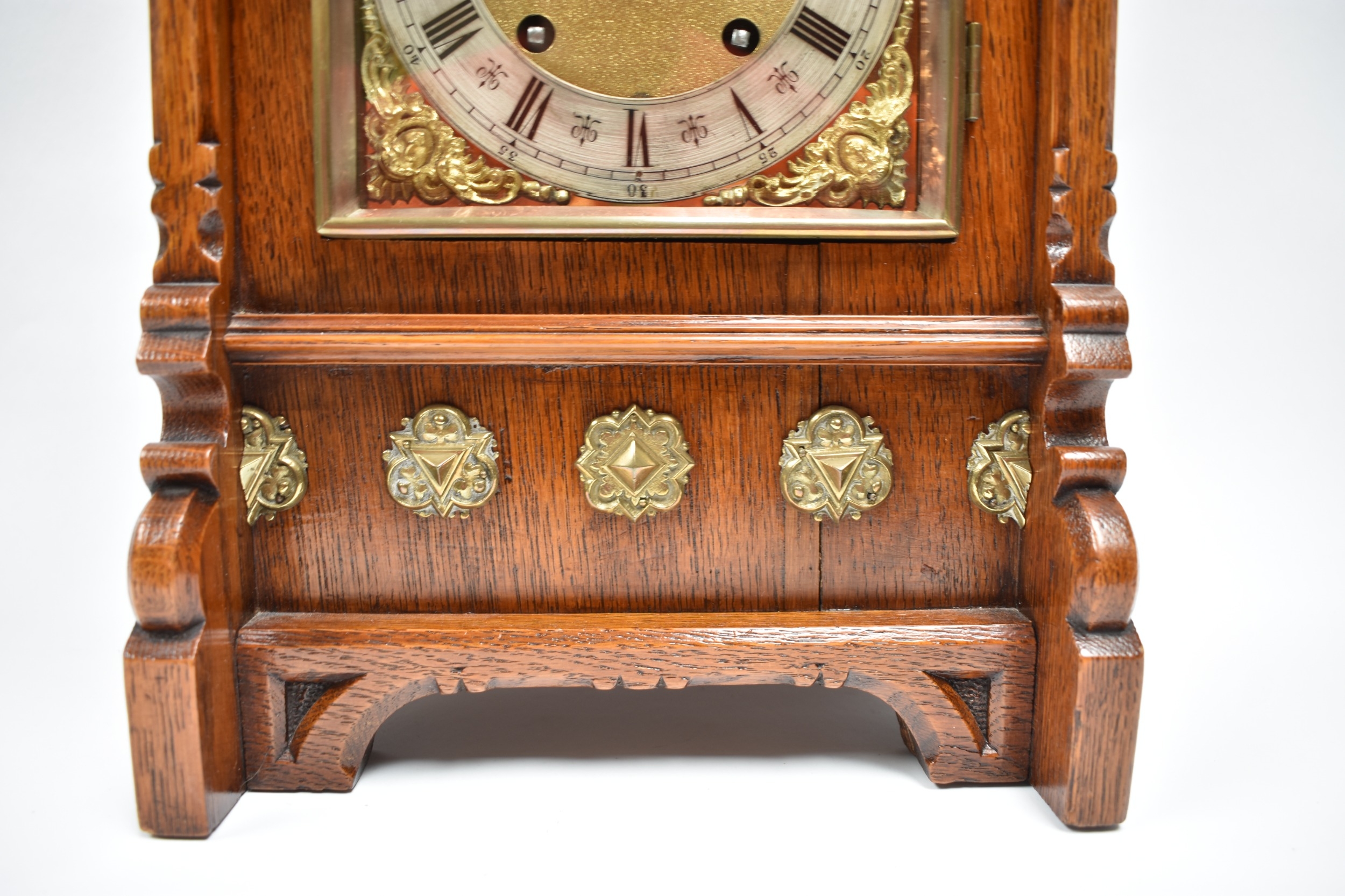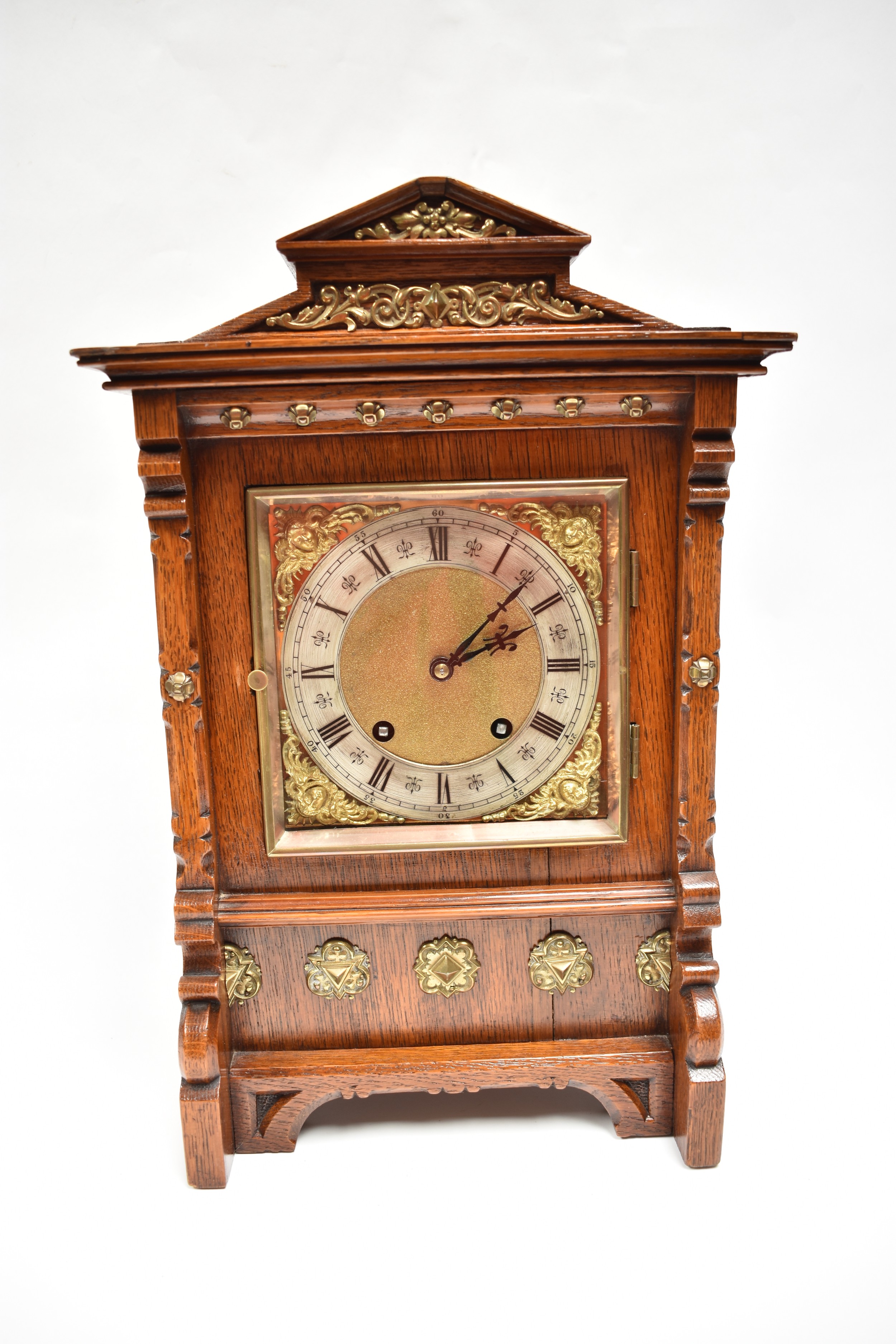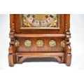 A German two train bracket clock striking on two coiled gongs in decorative light oak architectural form case with brass embellishment, 43cm x 29cm x 19cm. Case a/f, back panel missing