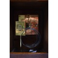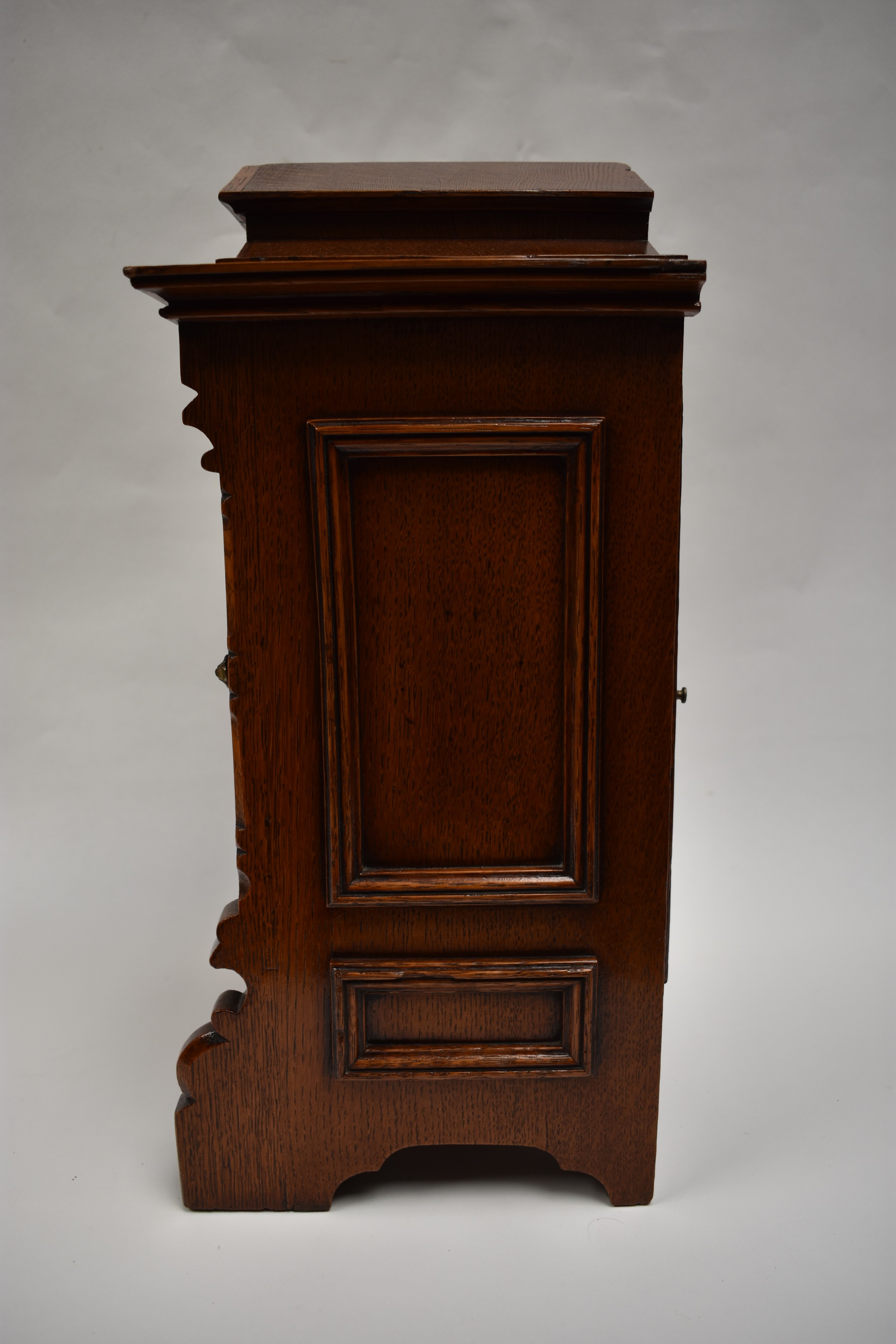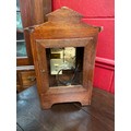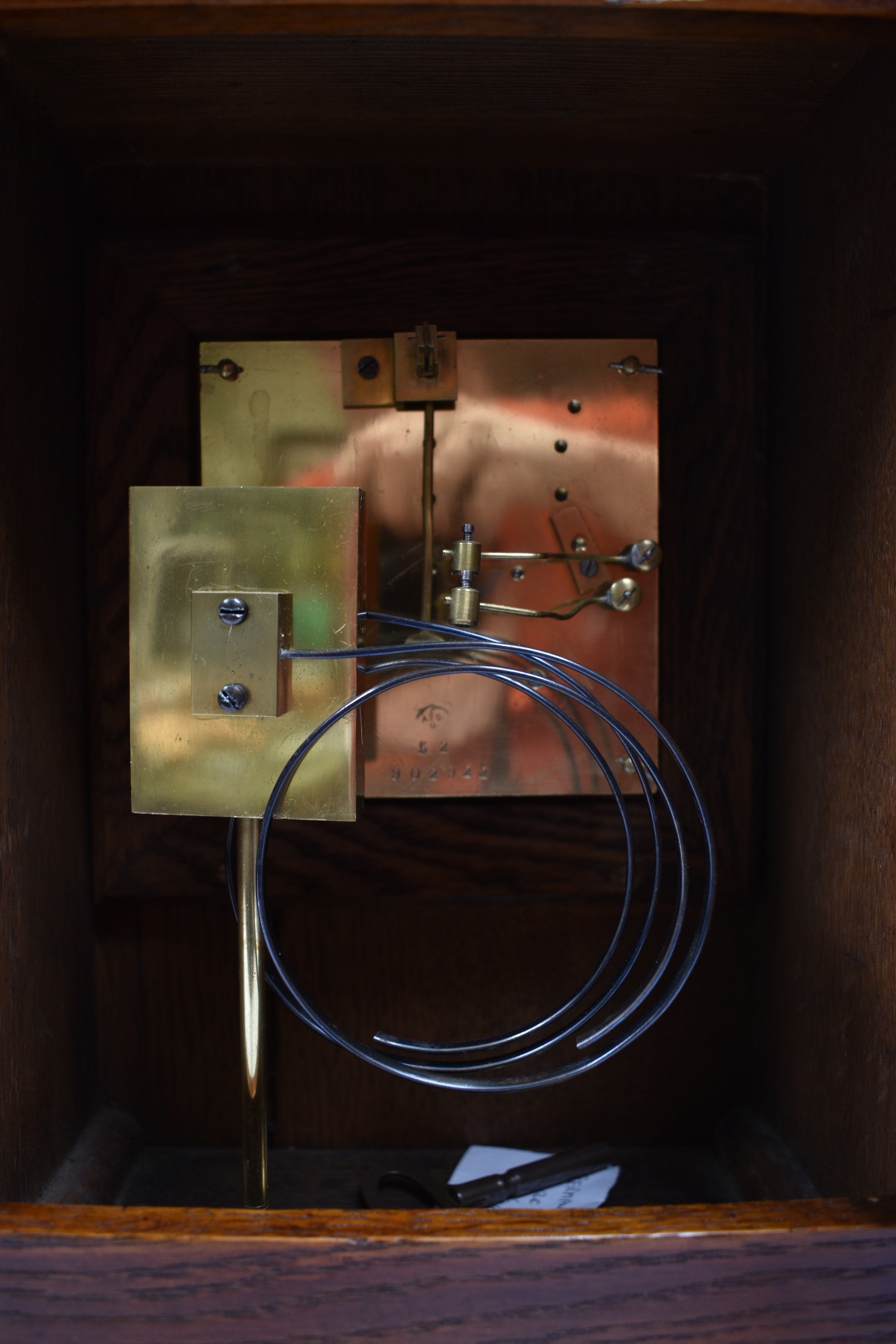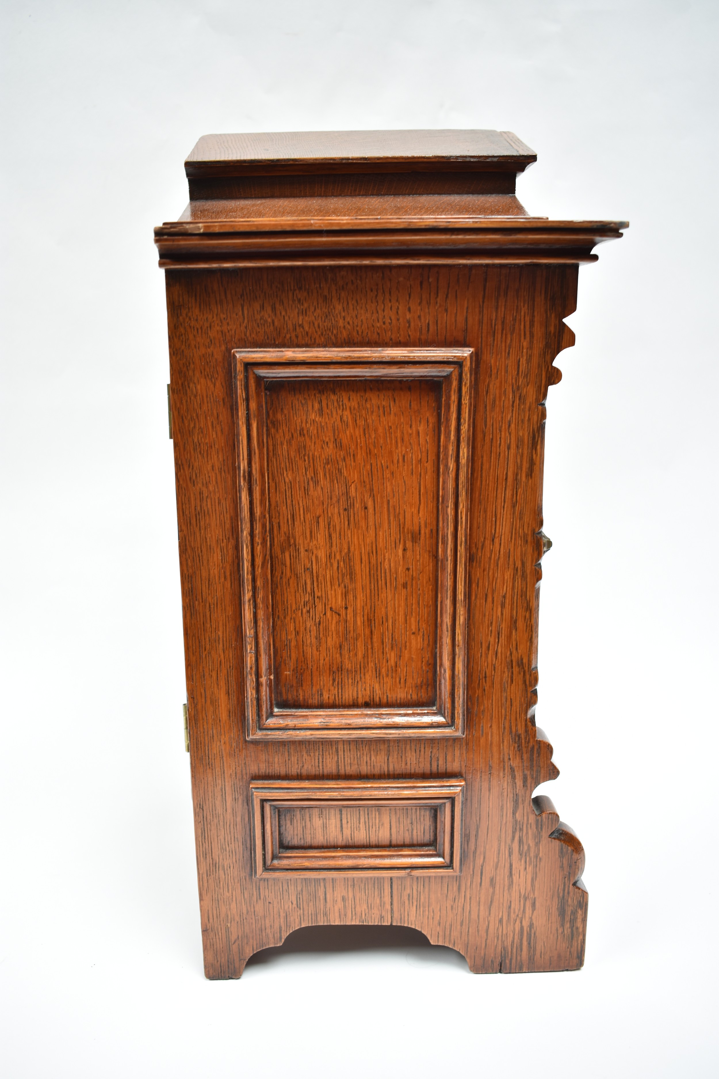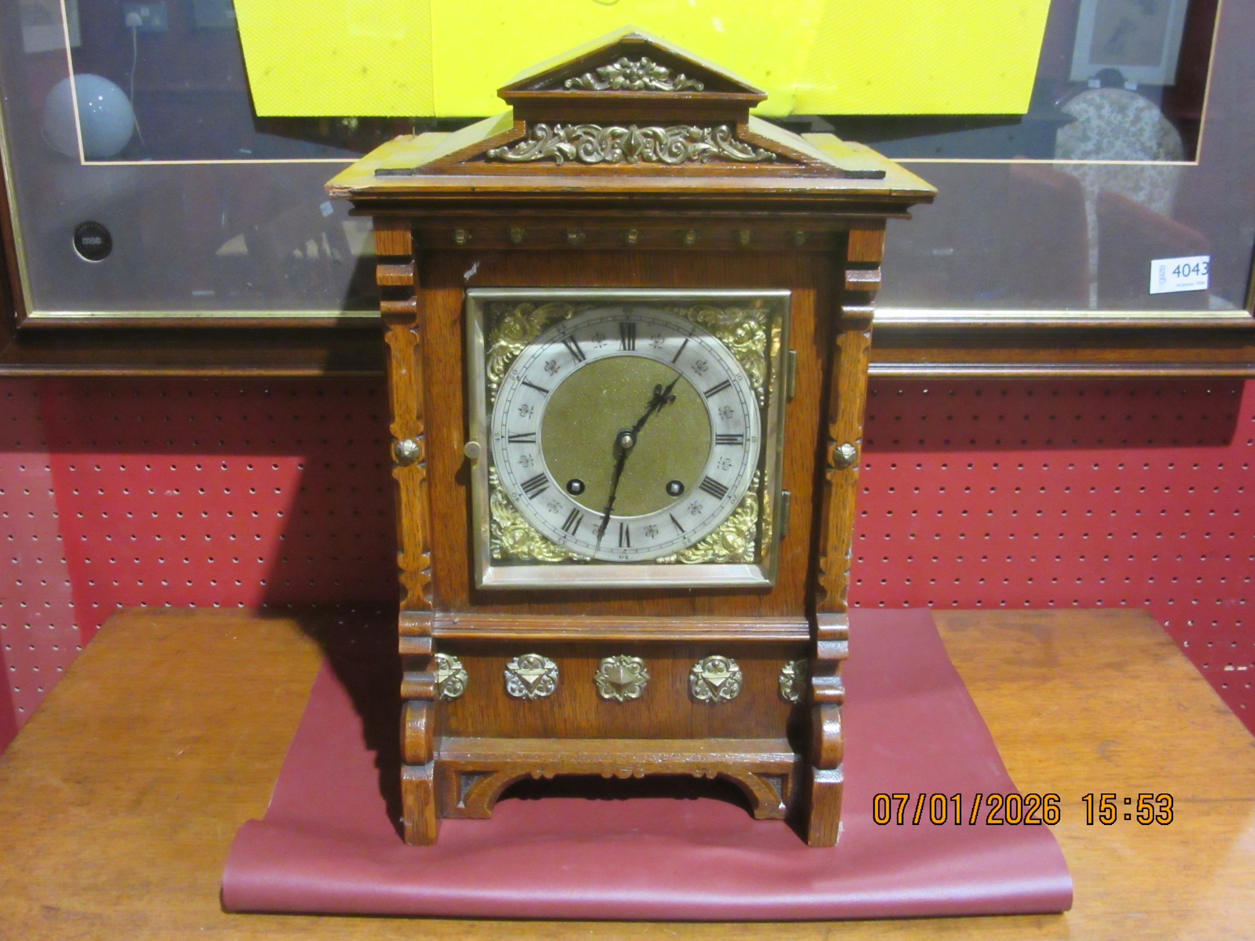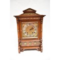 A German two train bracket clock striking on two coiled gongs in decorative light oak architectural form case with brass embellishment, 43cm x 29cm x 19cm. Case a/f, back panel missing