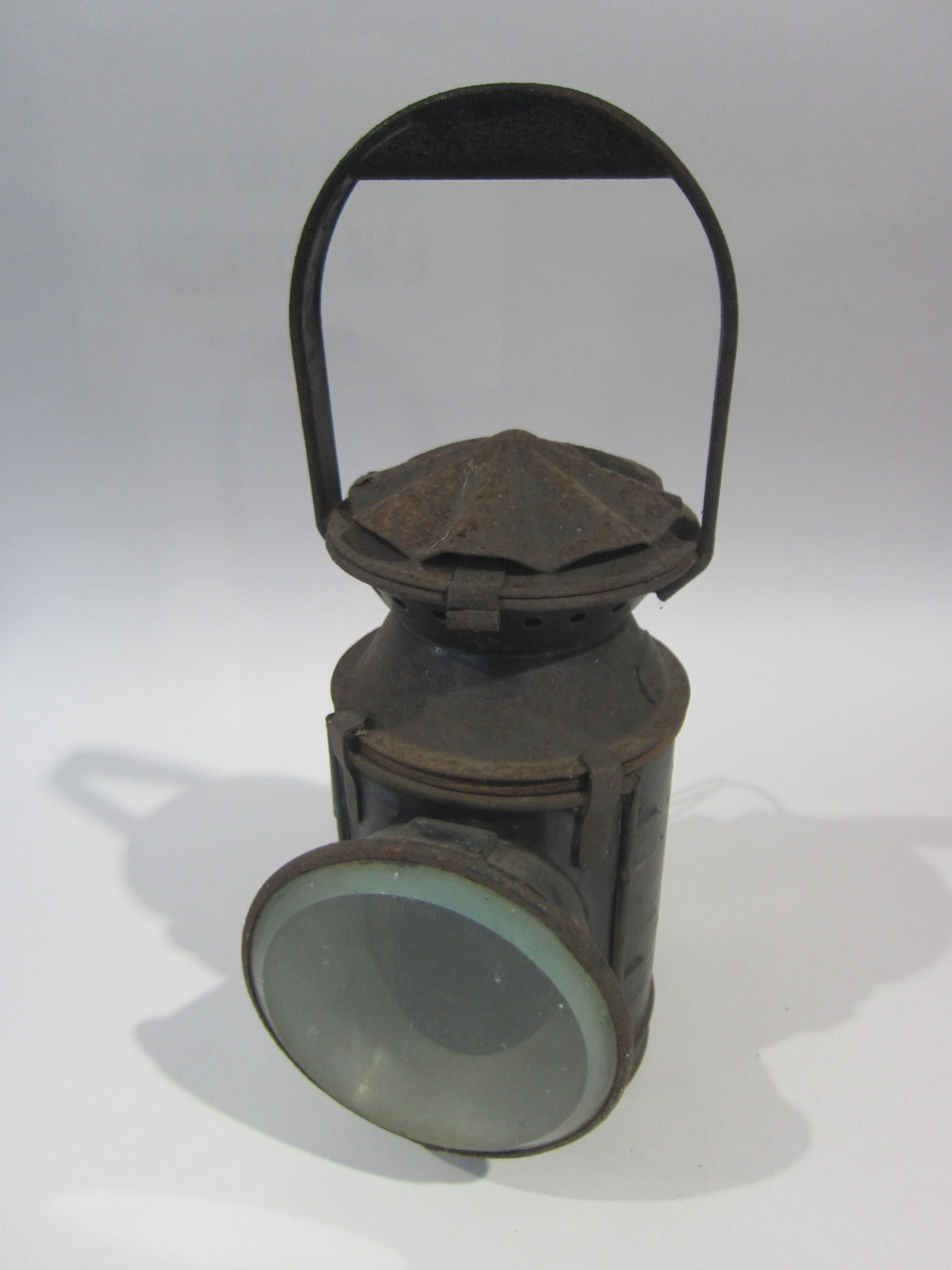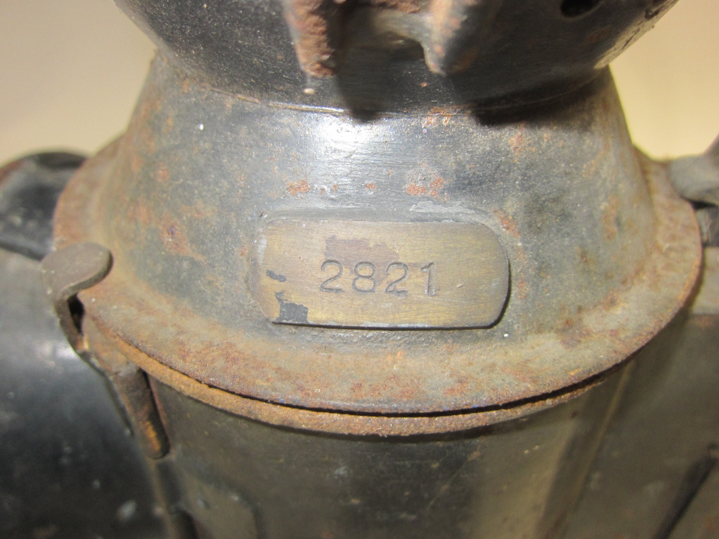 An SR three aspect hand lamp with internal reservoir and burner, brass plaque numbered 2821