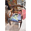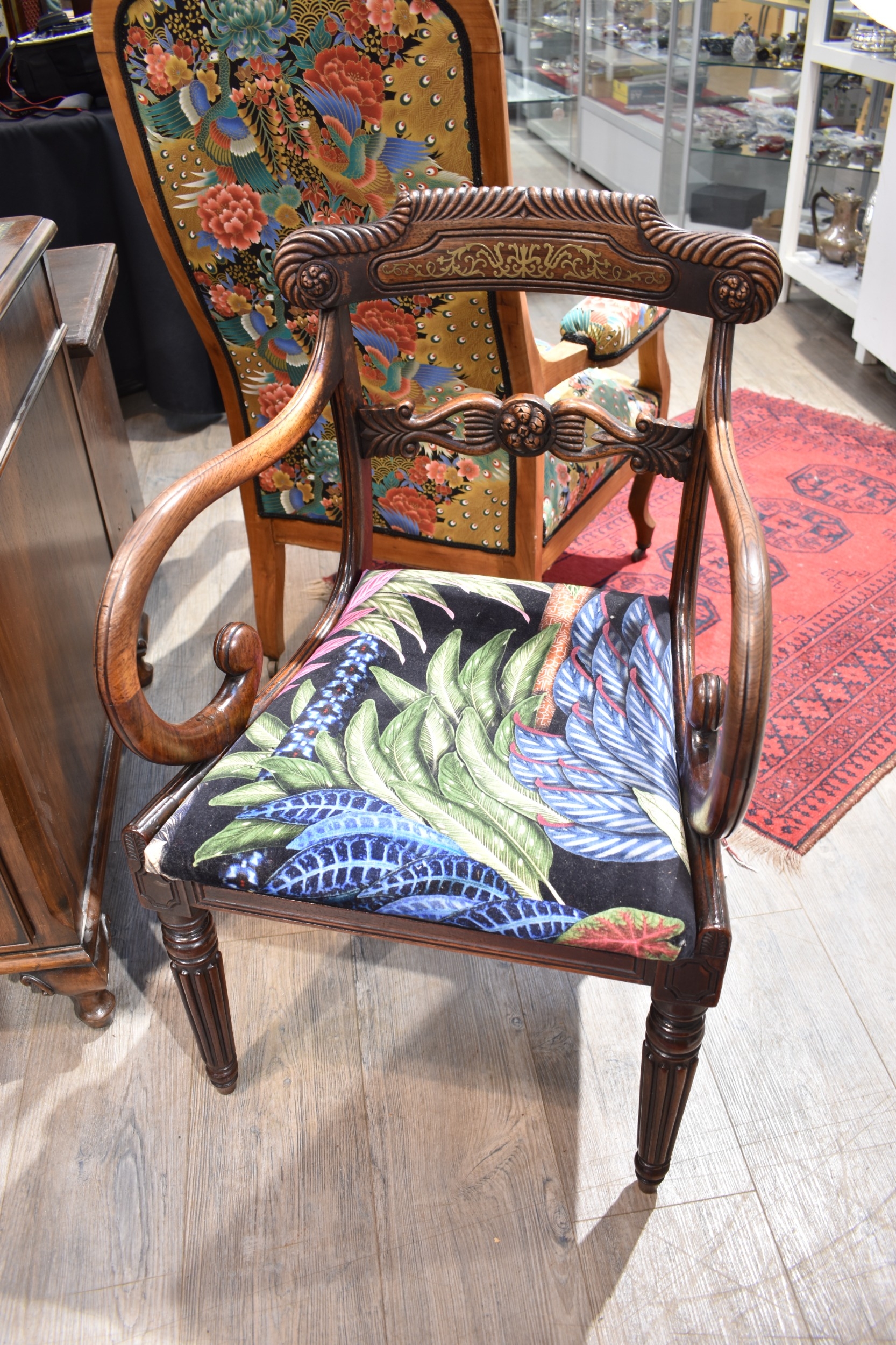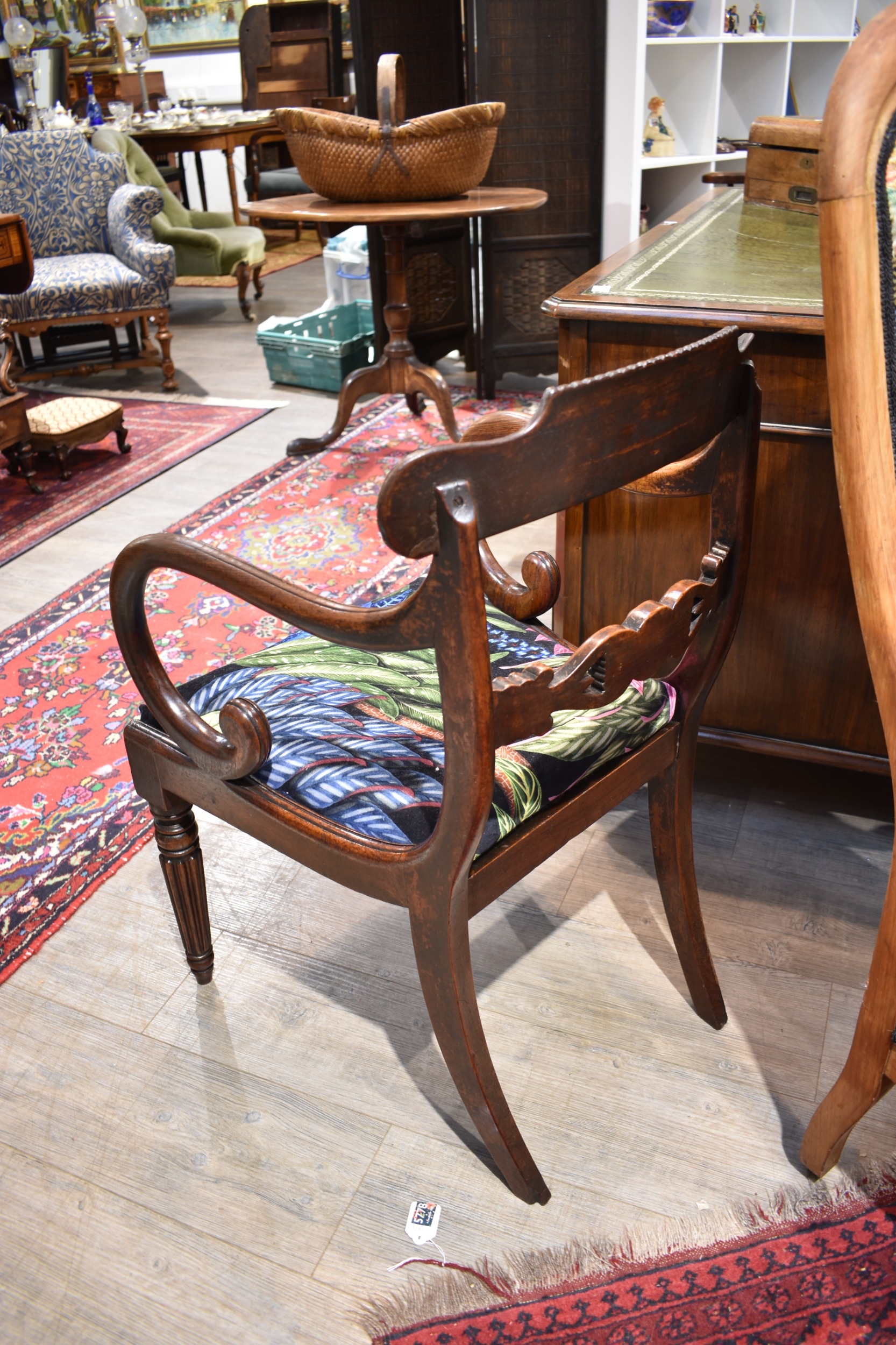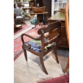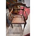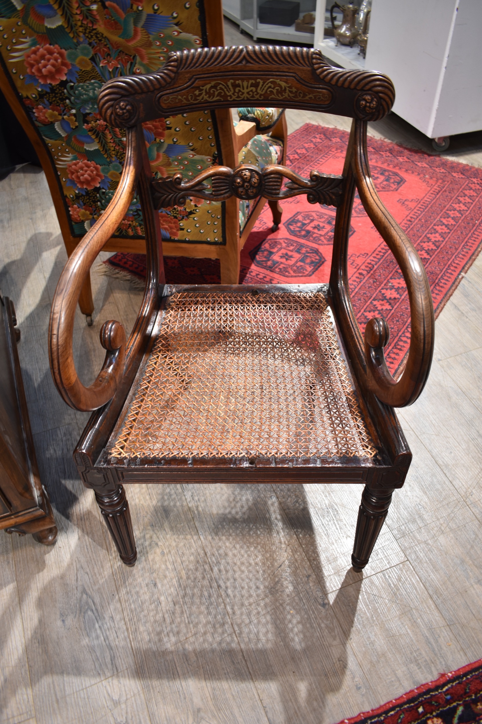 A Regency brass inlaid Cuban mahogany cane seat open armchair with carved and fluted decoration, the scroll arms and drop-in seat over turned and fluted tapering fore legs. 86cm tall x 53cm wide