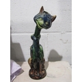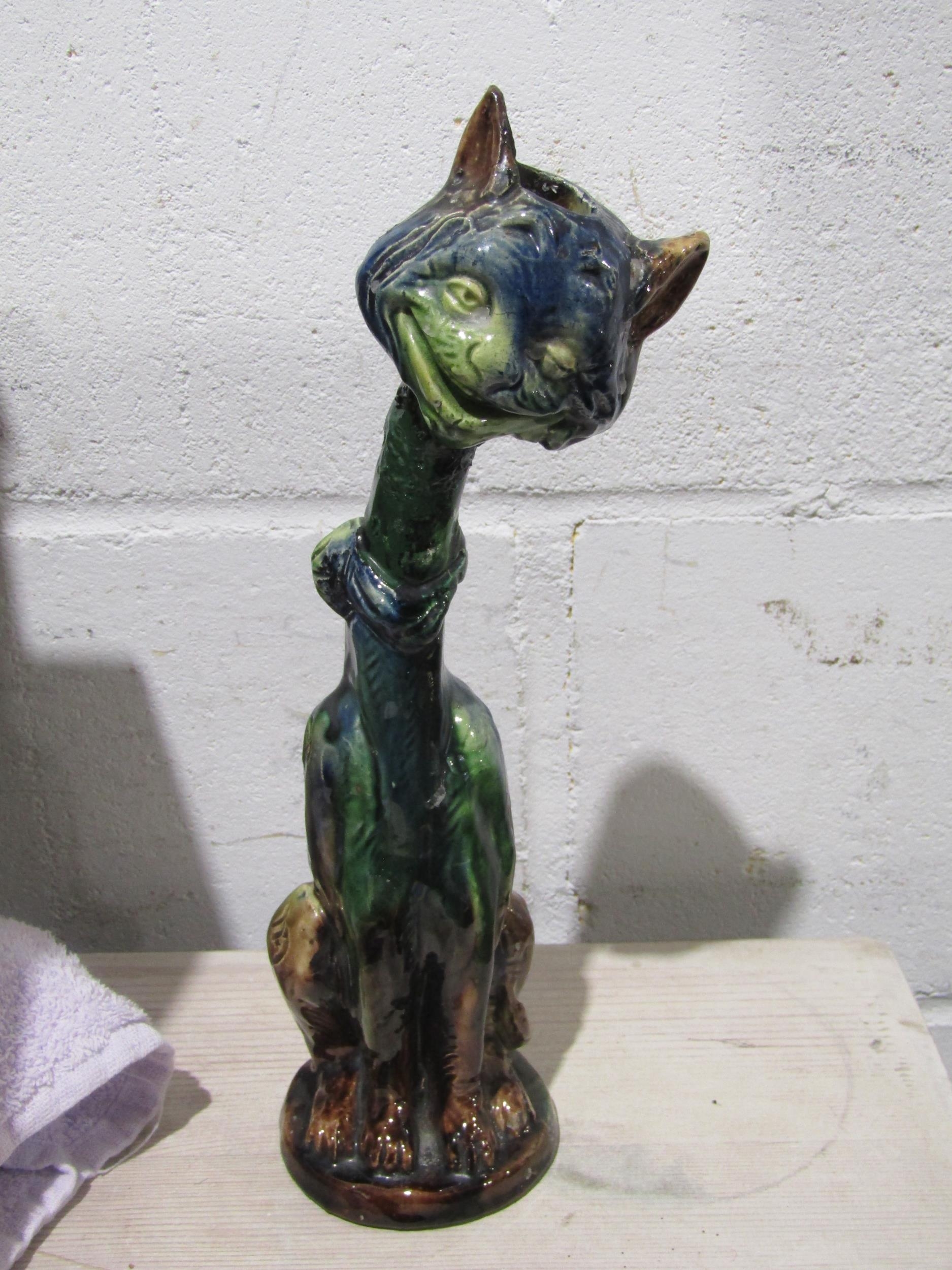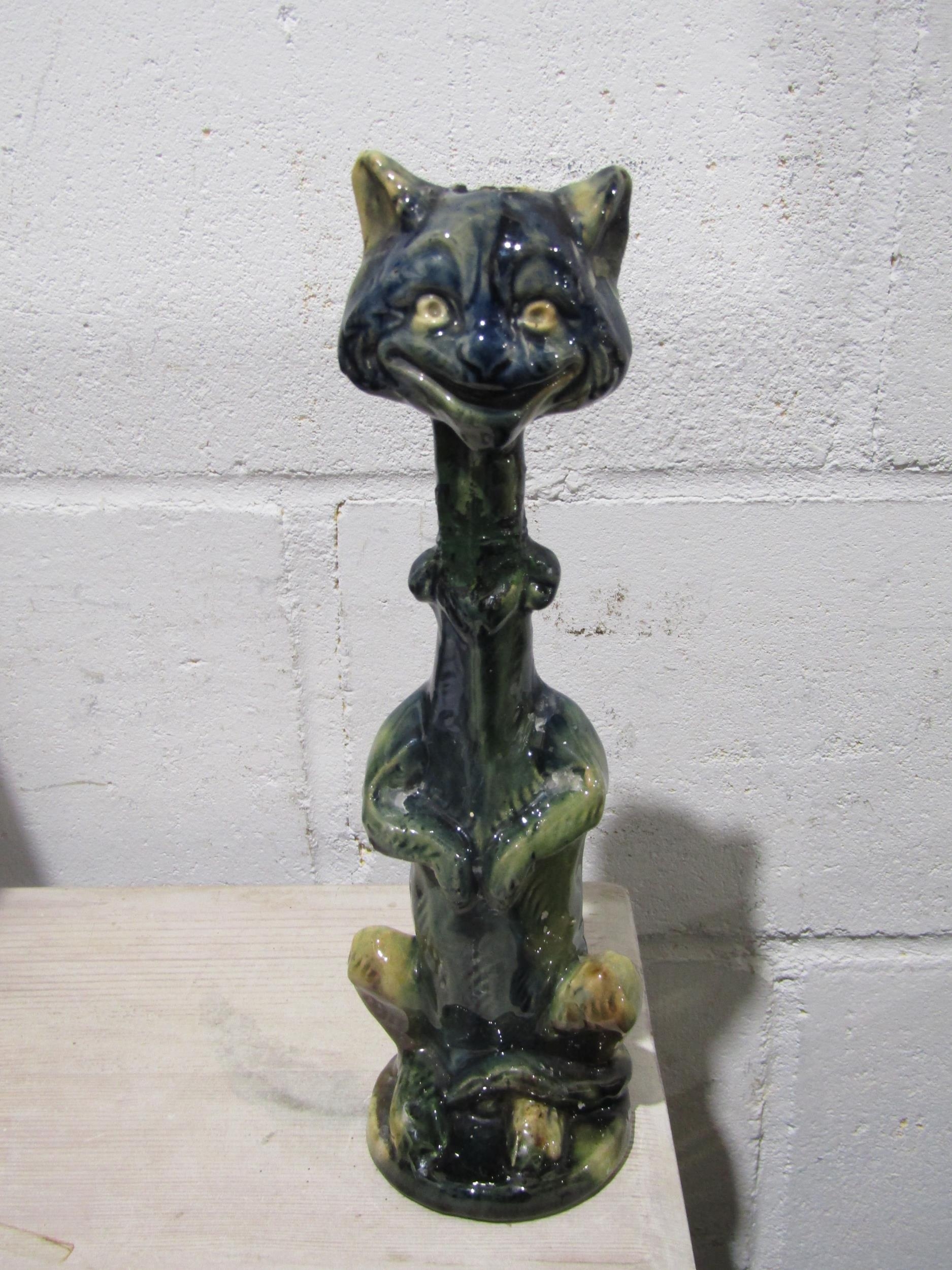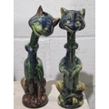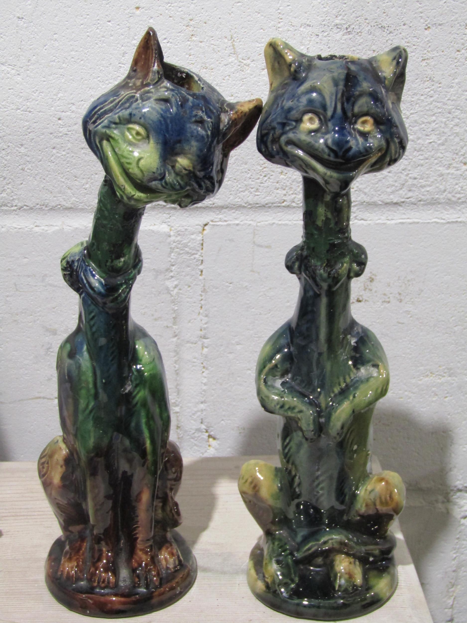 A pair of pottery cat candlesticks, necks a/f