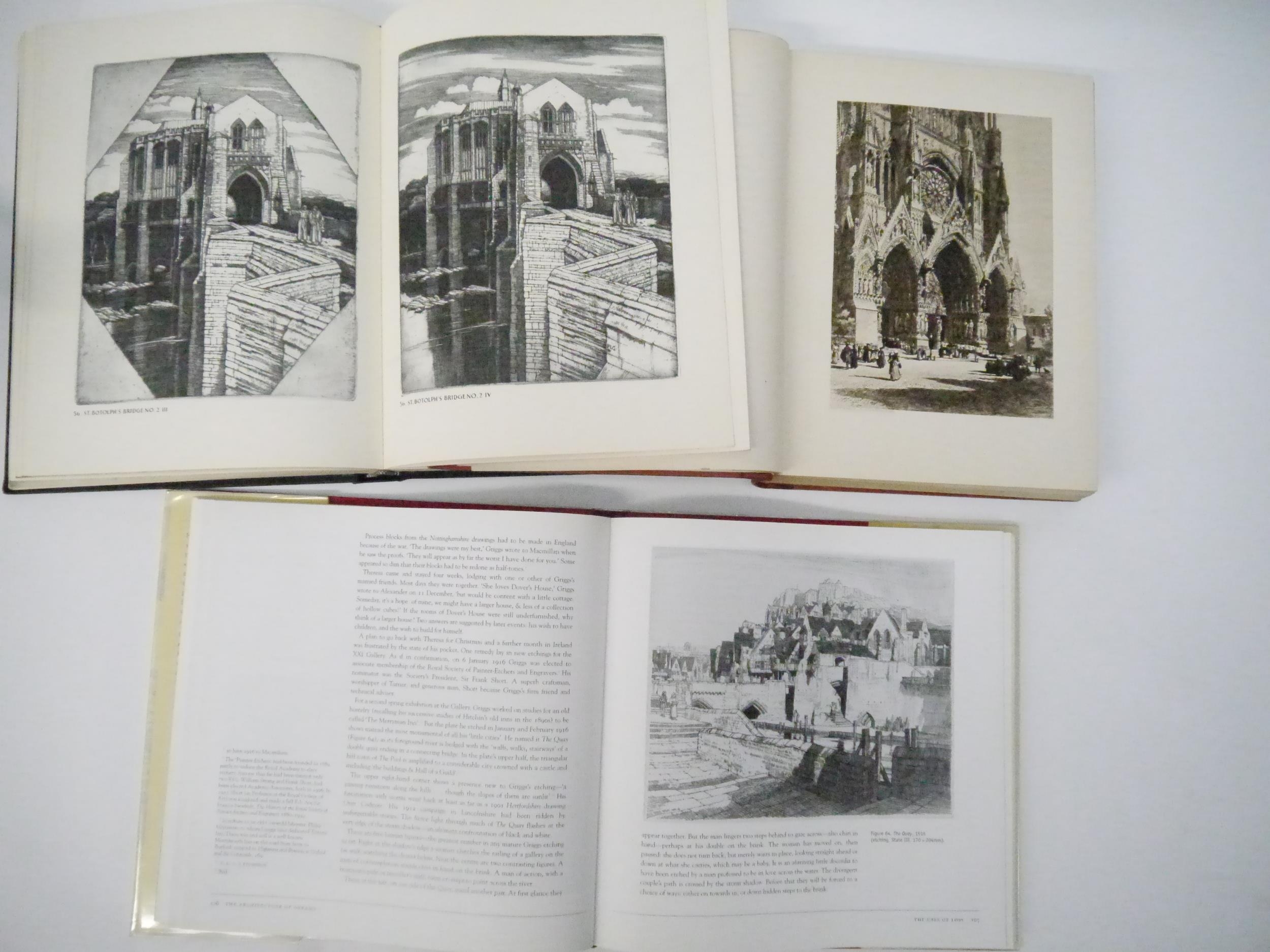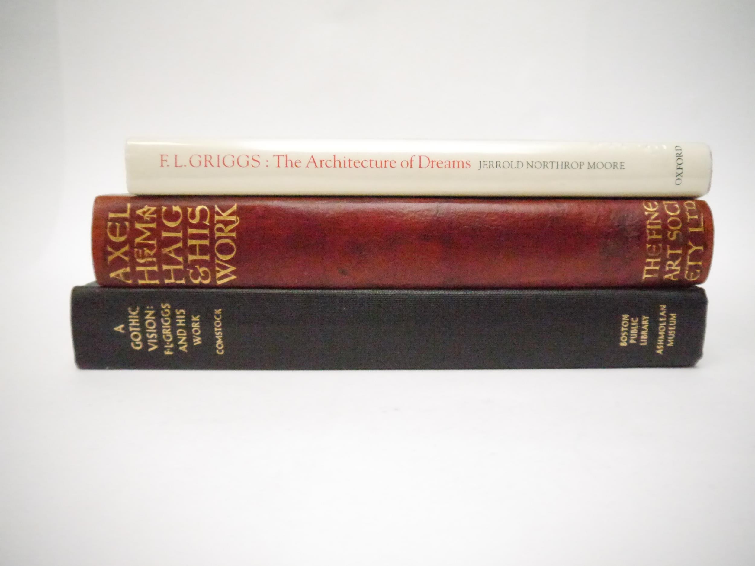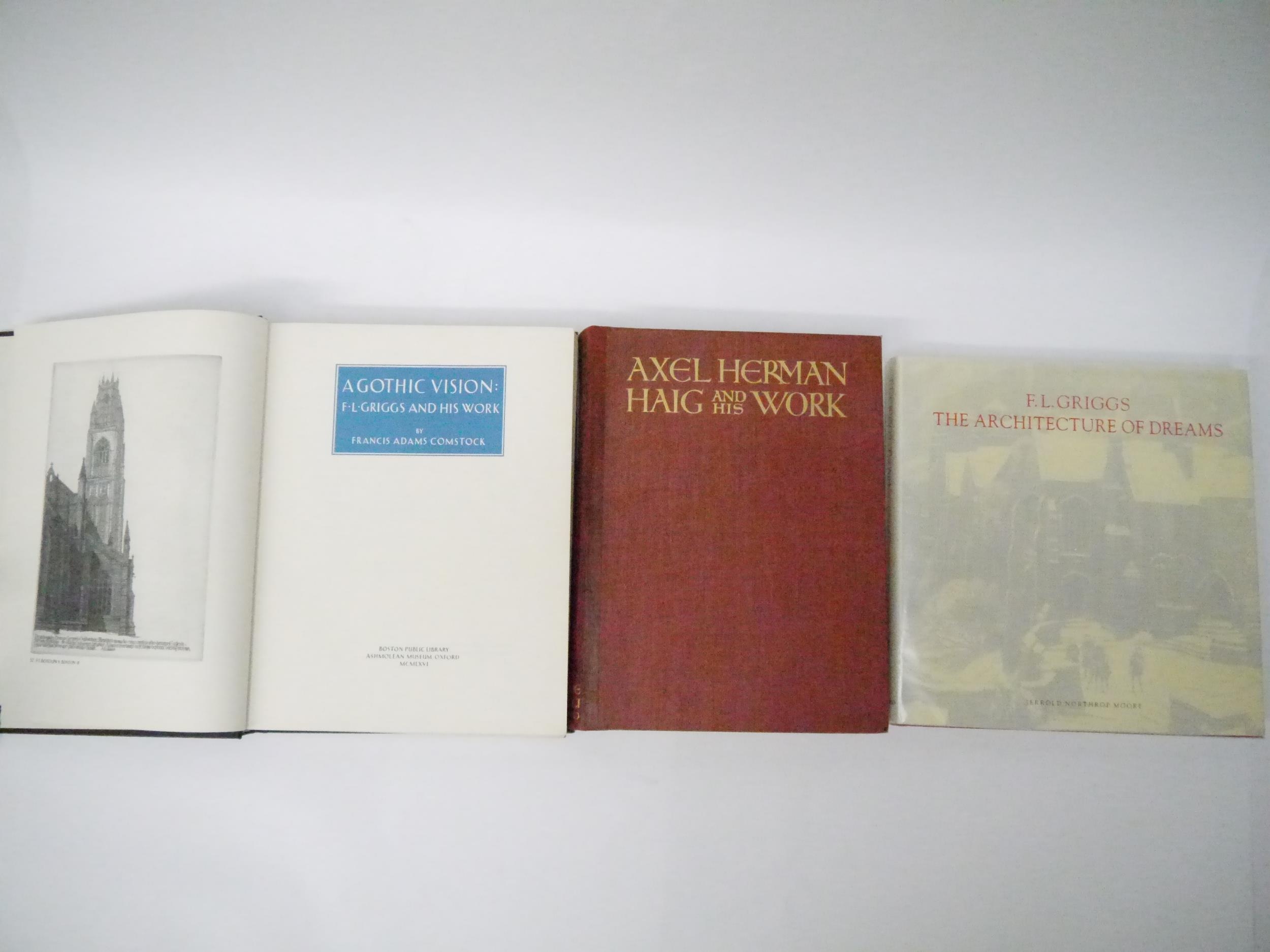 F.L. GRIGGS: ‘A Gothic Vision: F L GRIGGS and his work’, by Francis Adams Comstock. A Signed, Limited Edition of 600 copies only. This copy is signed by the author and numbered 161. Published by Ashmolean Museum, Oxford, and Boston Public Library in 1966. Hardback. Black cloth covered boards with lettering in gold. 375 pages. Well illustrated throughout. 28.5 x 22 cm; together with ‘F.L. GRIGGS The Architecture of Dreams’, by Jerrold Northrop Moore. Published in 1999 at the Clarendon Press, Oxford. Hardback red buckram with Dustwrapper. 302 pages in fine condition; together with ‘AXEL HERMAN HAIG and his work’, by E.A. Armstrong. Published in 1905 by The Fine Art Society, London. Hardback - leather spine. 186 pages. Illustrations throughout from his etching, pencil drawings and water-colours with a biography and a descriptive catalogue of his etched works. Illustrations in colour and black & white on thicker paper with tissue guards. This is an ex-library copy; but very neatly marked. New endpapers with bookplate - small round stamps on the blank back of the illustrations, nicely done. The size is; 27 x 20 cm. (3)
