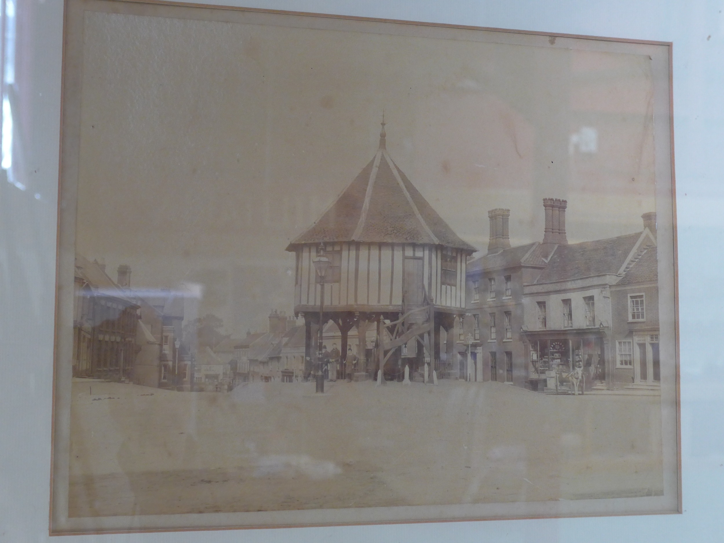 A framed and glazed black and white photograph of the Market Place, Wymondham