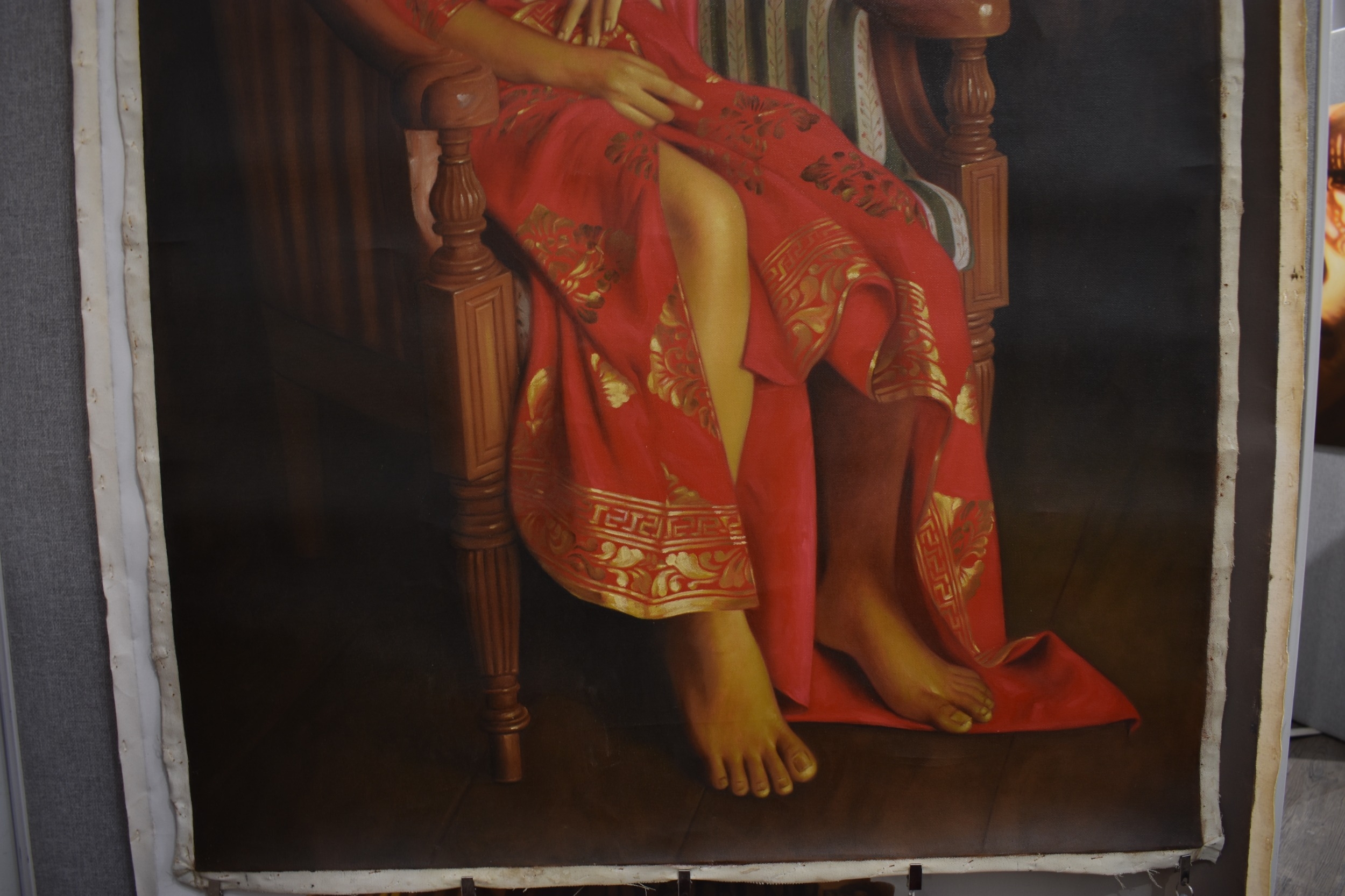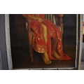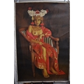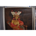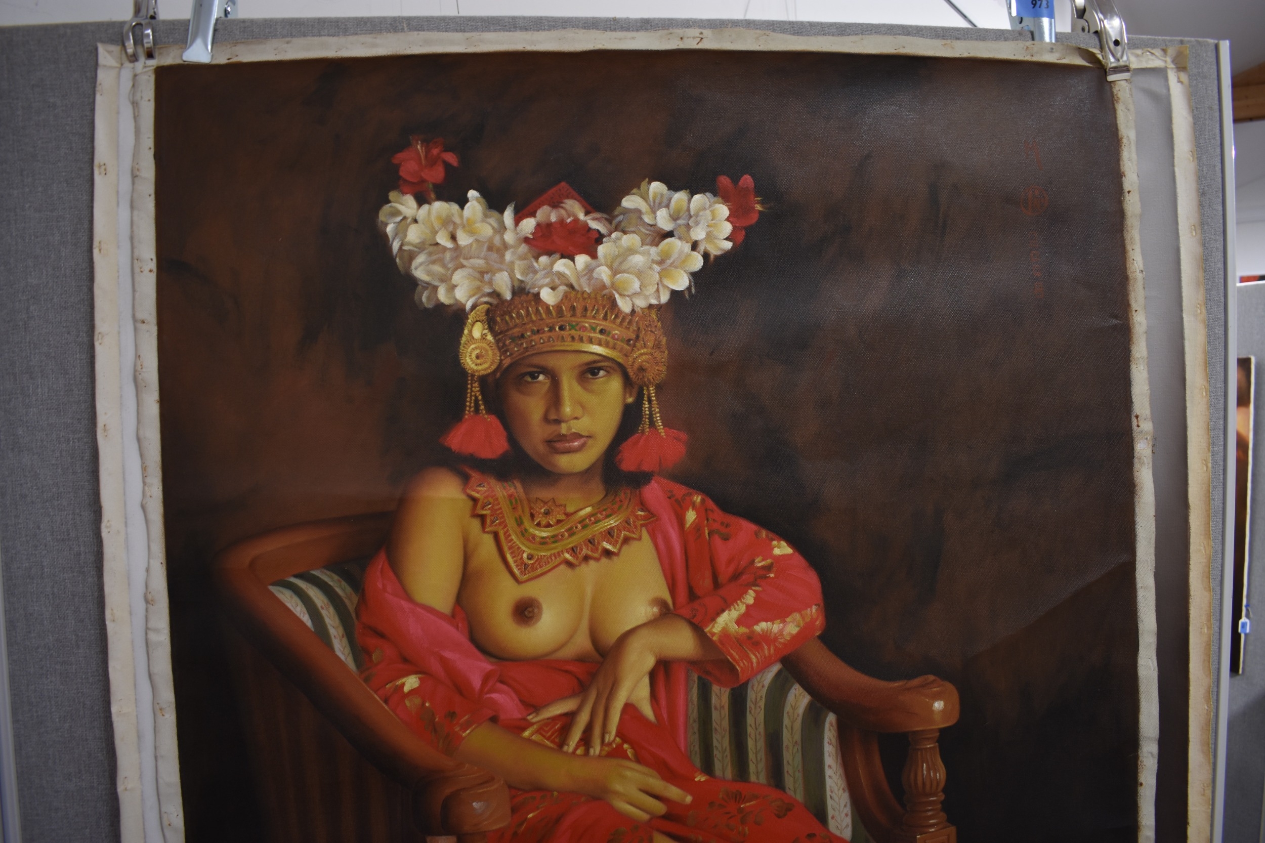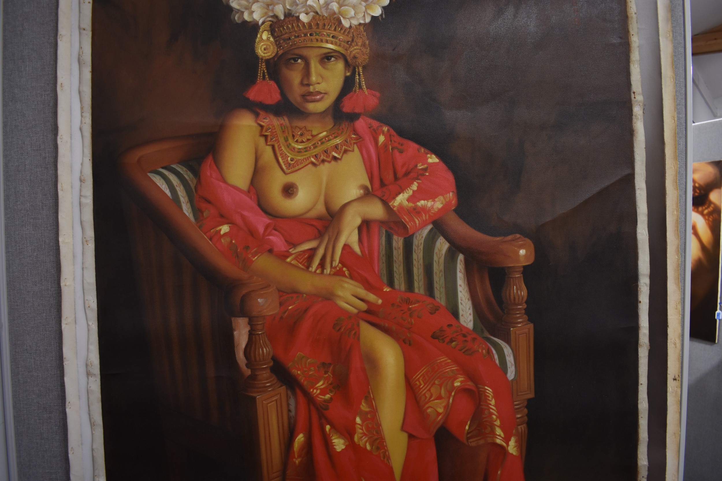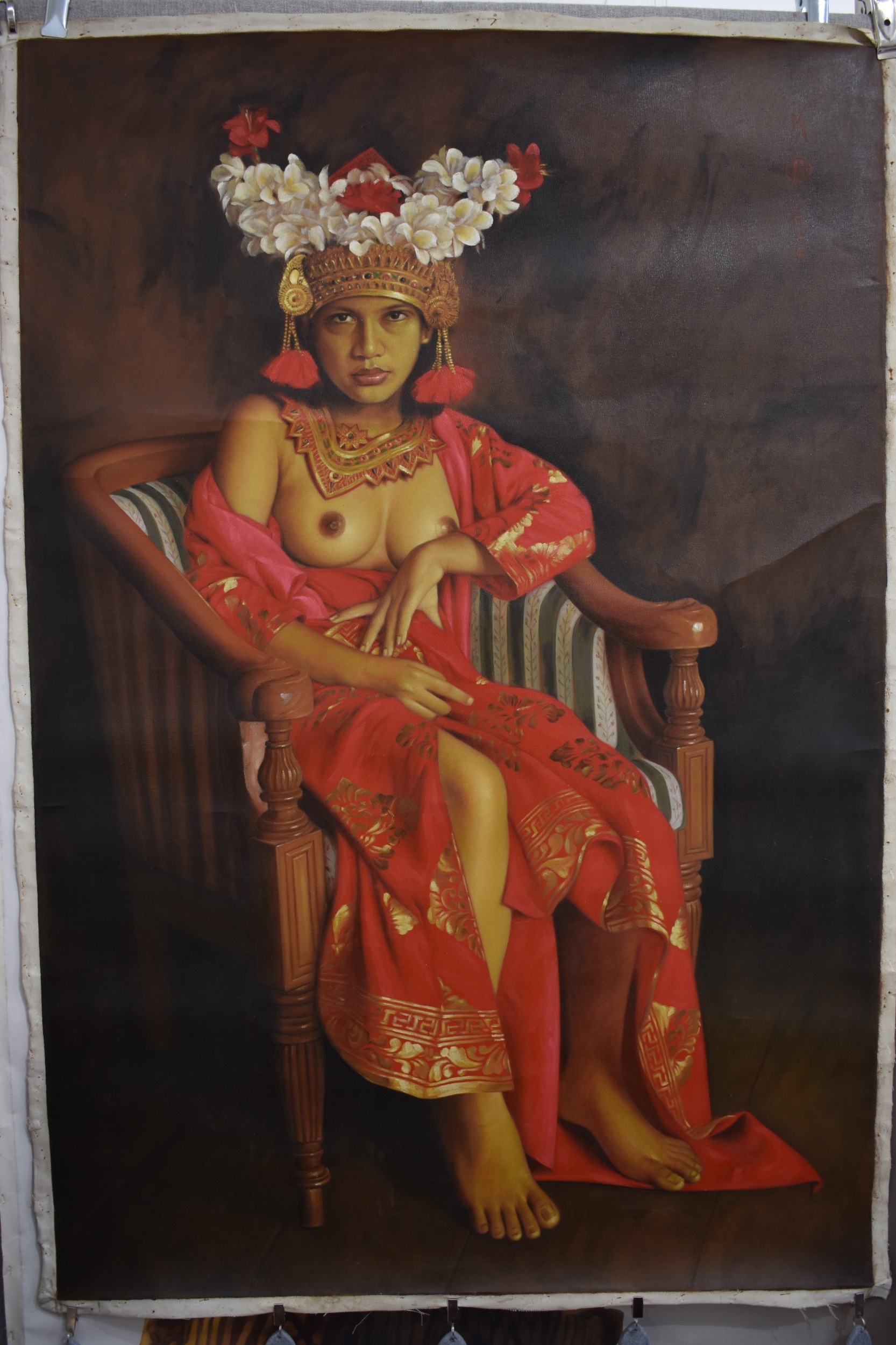 S. TONO (b.1969) : Indonesian Contemporary artist the painting depicts a seated Indonesian female a Regency tube chair wearing a floral headdress and necklace, with her breasts uncovered in a silk garment, dated 2008, unstretched acrylic on canvas, image size 134cm x 90cm